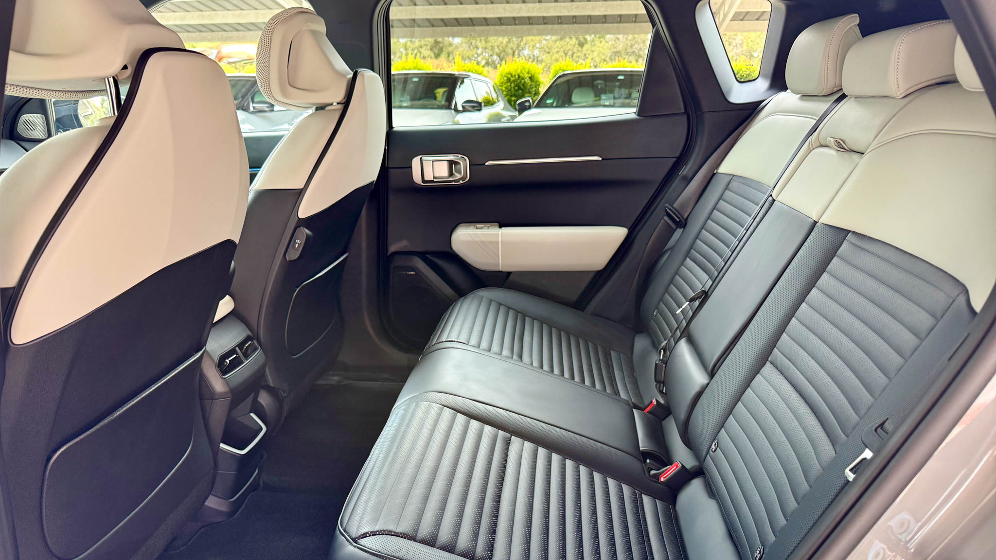 Die Füße lassen sich hinten allerdings nicht unter die Vordersitze schieben, die im Fahrzeugboden verbaute Batterie ist im Weg. Die Beinposition ist dadurch leicht angewinkelt, was auf längeren Fahrten unbequem werden kann. Der Mitteltunnel fehlt dank des elektrischen Antriebs, was der Mittelsitzposition zugutekommt. Allerdings ist dieser Platz nur für Kinder oder kurze Strecken zu empfehlen, da die Breite begrenzt ist.