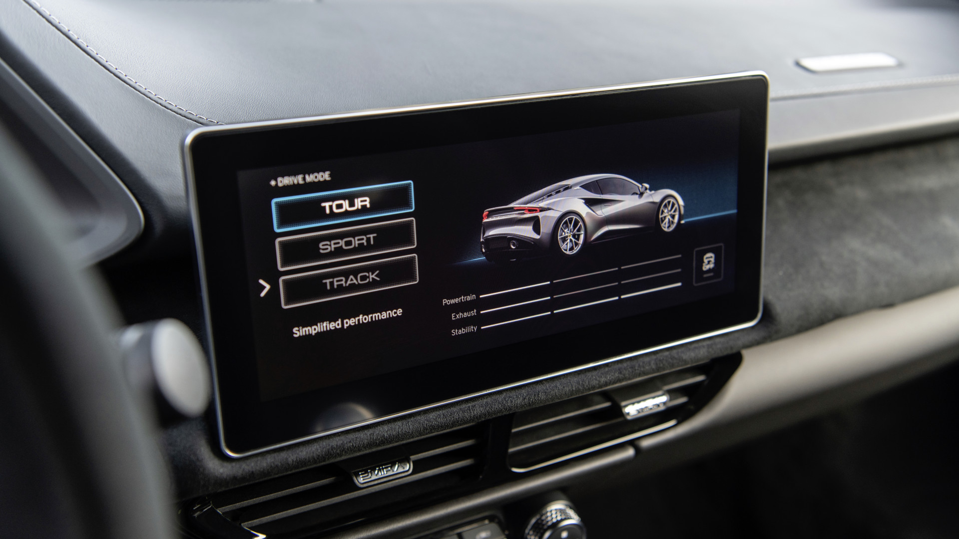 Das digitale Cockpit hinter dem „Multifunktionslenkrad“ (auch dies ist ein neues Vokabular im Lotus) zeigt die wichtigsten Fahrinfos und Anzeigen des Bordcomputers auf dem 12,3-Zoll-TFT-Display an. Auf dem 10,25-Zoll-Bildschirm oberhalb des zentralen Luftaustritts wird das Infotainment aufgespielt.