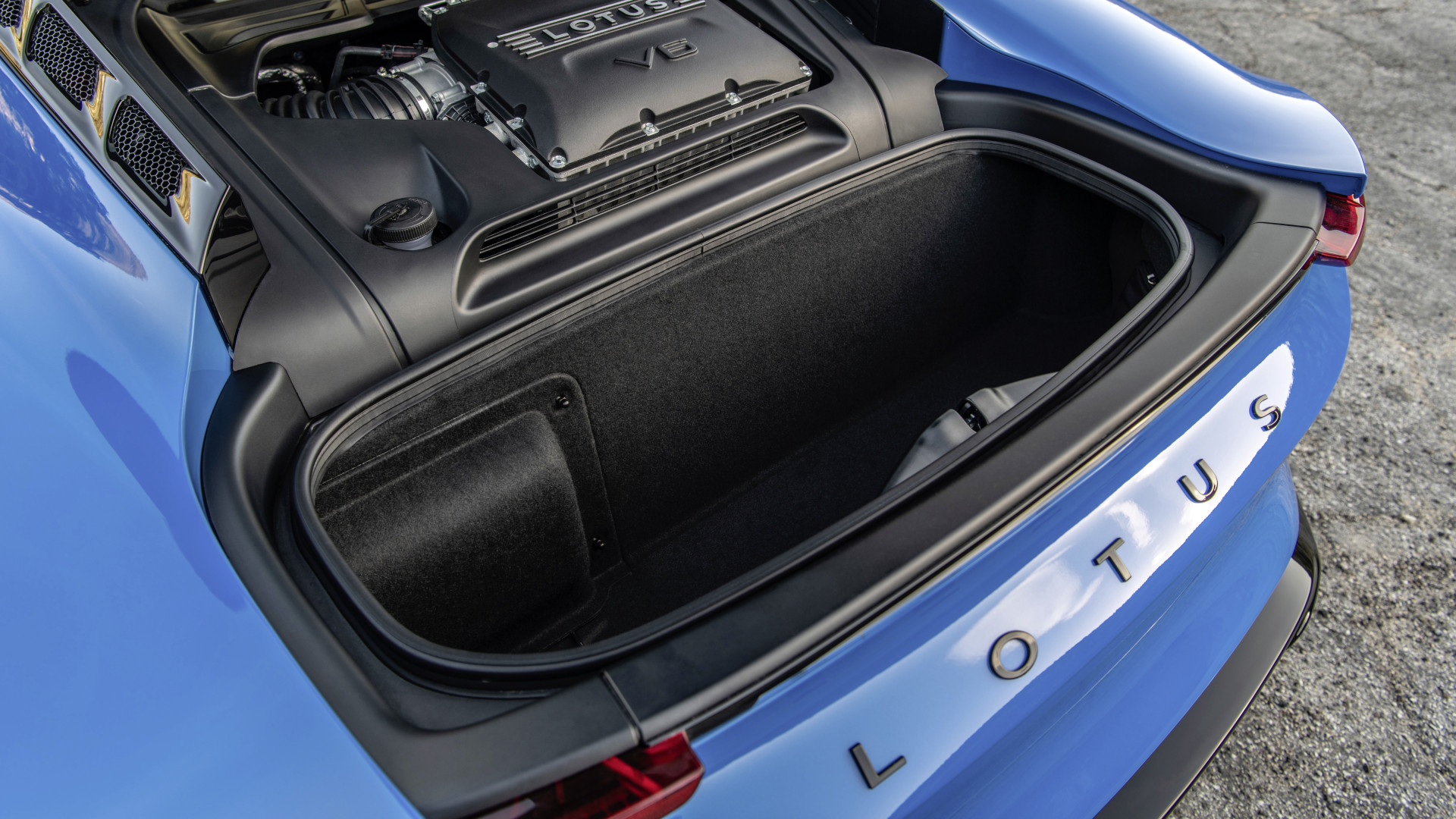 Und die Koffer? Sie dürfen nur klein ausfallen. Ein Gepäckabteil vorne unter der Haube gibt es nicht. Das Gepäck oder andere Gegenstände können hinter den Sitzen oder dem Motor untergebracht werden. Die Staufläche hinter den zwei Sitzplätzen ist im Emira 208 Liter groß. Der Raum hinter dem Motor bietet 151 Liter Staufläche. Das genügt für ein Flightcase in Standardgröße oder einen Satz Golfschläger, verspricht Lotus. Akzeptabel? Andersherum gefragt: Wer erwartet viel Kofferraum in einem Mittelmotorsportwagen von Lotus?