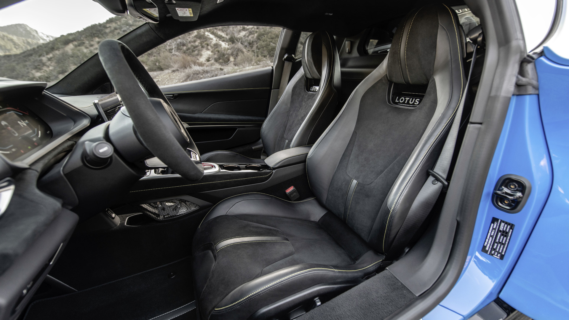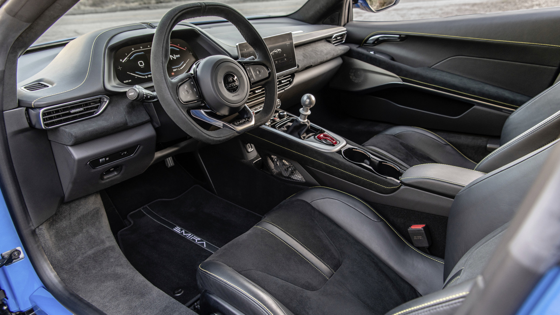 Assistenzsysteme wie ein adaptiver Tempomat oder Spurwechselassistenten sowie Features wie ein Multifunktionslenkrad oder eine elektrische Parkbremse sind im Lotus Sportler neu. Im 4,41 Meter langen und 1,23 Meter hohen Emira steigt man wegen der breiten Türen komfortabler ein. Auch wenn der Kofferraum fehlt, gibt es 359 Liter Stauraum. Das 12,3-Zoll-Digitalcockpit, das hochwertig wirkende Interieur und die Sitze bieten eine gute Aufenthaltsqualität. Becherhalter finden sich im Innenraum genauso wie ein Handschuhfach oder eine Ablage fürs Smartphone. Auf den Sportsitzen des Zweisitzers sitzen sowohl kleinere als auch größere Passagiere bequem mit reichlich Seitenhalt.