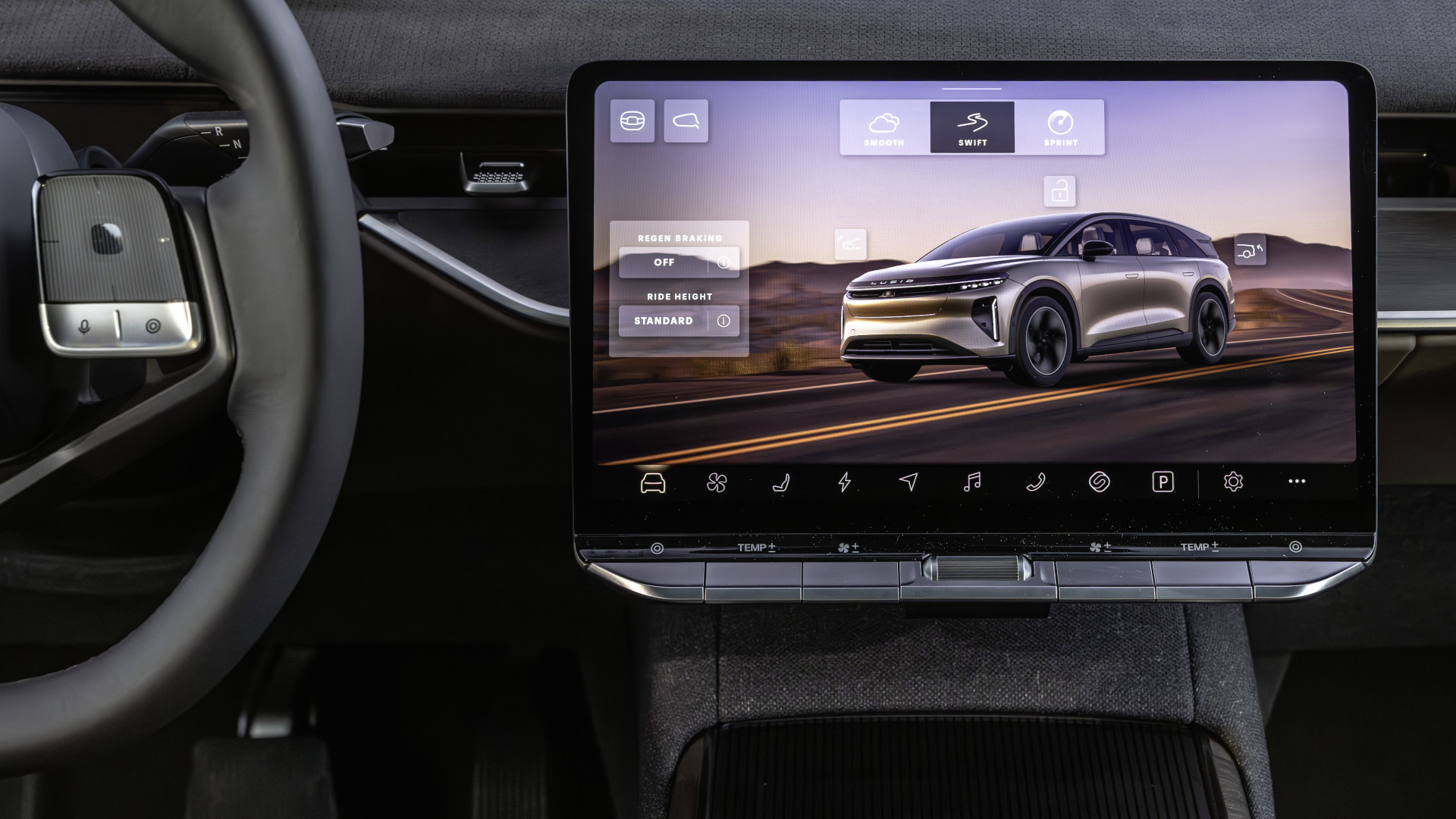 Die Bedienung des SUVs erfolgt ausschließlich über die Displays. Das beinhaltet auch Dinge wie die Einstellung der Seitenspiegel oder das Öffnen des Handschuhfachs. Sehr modern, aber auch umständlich. Eine weitere Möglichkeit sind die haptischen Touch-Regler rechts und links am Lenkrad, die mehrere Funktionen übernehmen können, wenn sie zuvor im Display aktiviert wurden. Es dauert aber einen Moment, um sich auf den Glasflächen zurechtzufinden. Eine Alternative ist die Sprachsteuerung, die mit dem Befehl „Hey Lucid” aufwacht. Zumindest die Scheibenwischer lassen sich noch per Knopfdruck hinter dem Lenkrad einschalten.