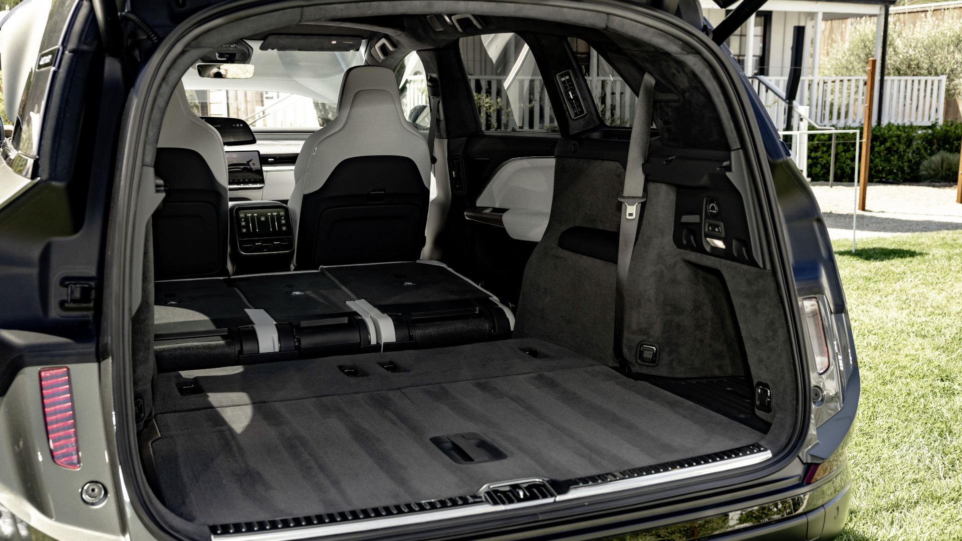 Als selbsternannte neue Instanz in der Oberklasse setzt der Lucid Gravity auf einen imposanten Auftritt. Das SUV ist fünf Meter lang, seine Breite beträgt zwei Meter, die Höhe 1,65 Meter. Der Radstand kommt auf satte 3,3 Meter. Das ermöglicht eine Kofferraumkapazität, die auch in diesem Segment ihresgleichen sucht, egal ob Elektroauto oder Verbrenner. Das SUV fasst, wenn fünf Personen an Bord sind, 780 Liter. Mit umgeklappten Sitzen sind es bis zu 3.450 Liter. Hier lässt sich wirklich alles transportieren: vom Fahrrad über das Surfbrett bis hin zum Kühlschrank. Die Ladekante ist angenehm niedrig und gegen Verkratzen beim Einladen geschützt.