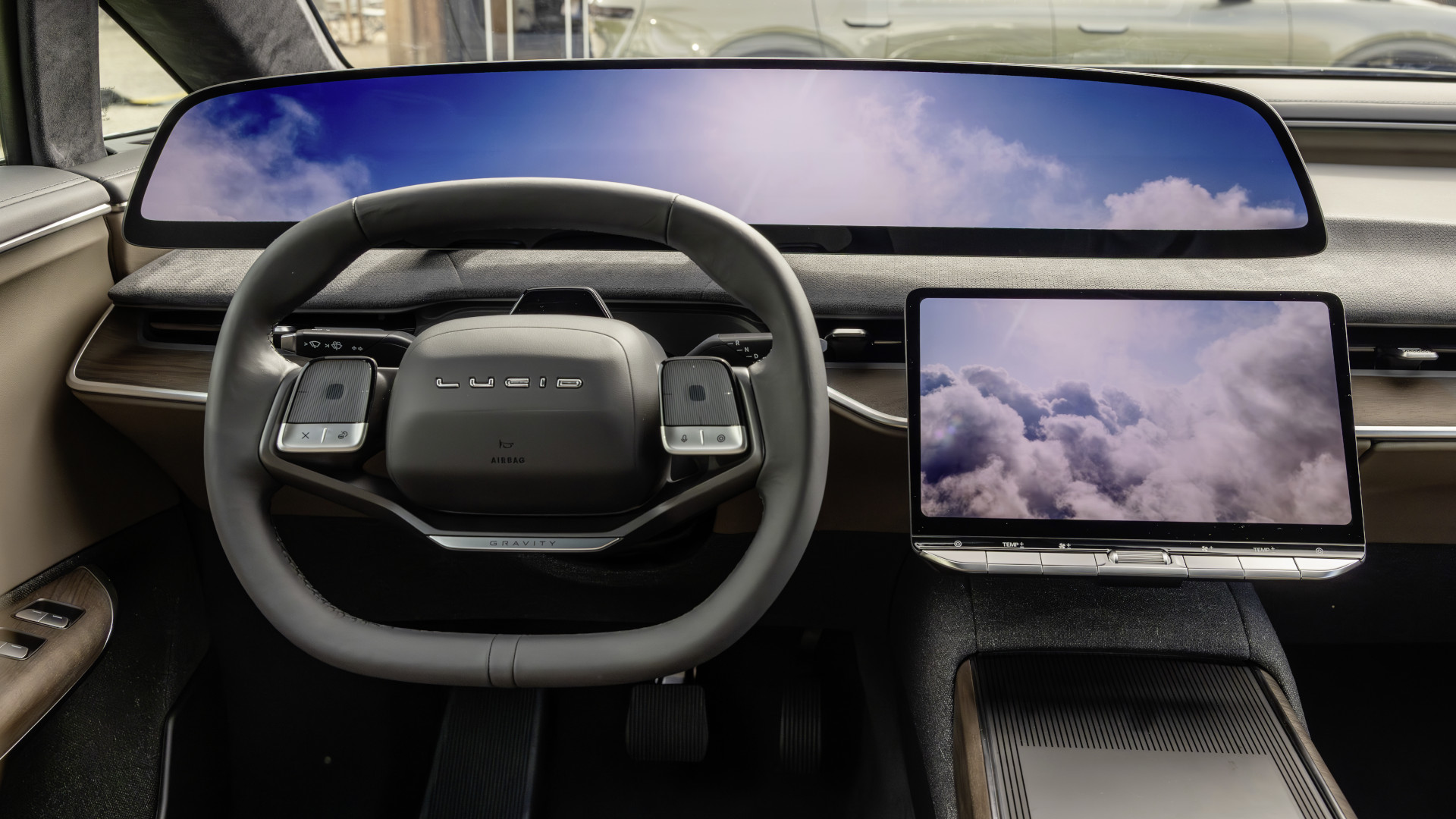 Größter Blickfang im Innenraum sind die beiden riesigen Displays. Vom Fahrenden bis zur Fahrzeugmitte erstreckt sich ein 24 Zoll großes, gekrümmtes 6k-OLED-Display, das über dem Armaturenbrett zu schweben scheint und sowohl Kombiinstrument als auch Infotainment anzeigt. Im Gegensatz zu vielen anderen Herstellern, die das nur simulieren, handelt es sich tatsächlich um ein einziges, ununterbrochenes Panel im Cockpit. Darunter befindet sich ein horizontal ausgerichtetes Full-HD-Display, das als separater Bildschirm für schnelle Zugriffe konzipiert ist. Die beiden Bildschirme können auch zusammen interagieren, indem sie z.B. während des Ladens eine Brandung simulieren. Das ist so realistisch, dass im Lucid Gravity durch diese Technologie Strandgefühle aufkommen.