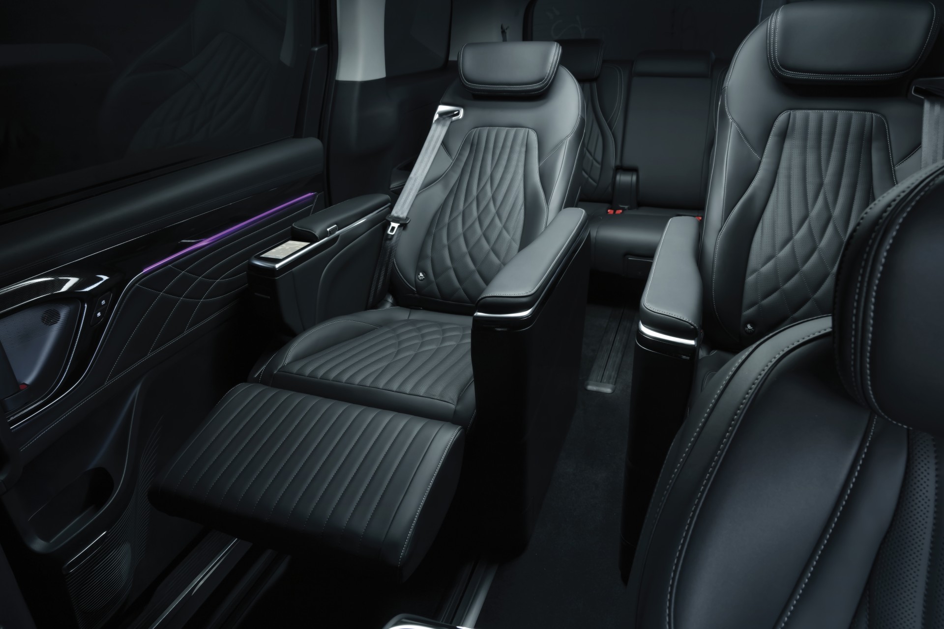 Im Elite finden sich in der mittleren Sitzreihe zwei Einzelsitze mit manueller Rückenlehne. Wurde das Luxury-Paket mitbestellt, lässt sich die Rückenlehne elektrisch verstellen. Die nobelste Lösung wird aber im Premium-Paket geboten: zwei Liegesessel mit eigener Beinauflage wie in den höheren Buchungsklassen im Flugzeug.