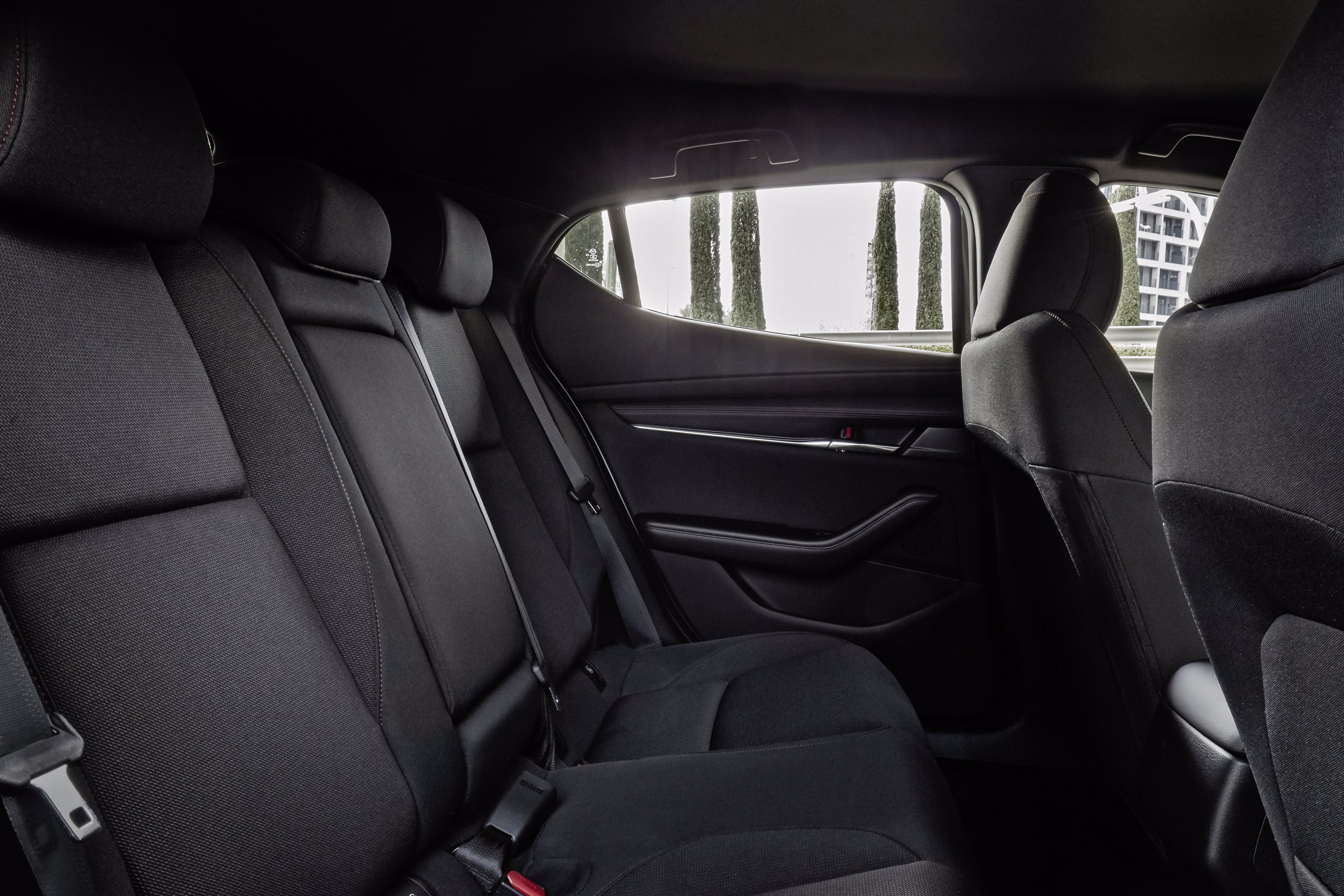 Auf den neuen Vordersitzen, die mehr Seitenhalt bieten und im Stil der AGR-Gesundheitssitze von Opel gesünderes Sitzen versprechen, sitzt man mit 1,85 Meter Körpergröße bequem. Dahinter weniger, wenn man ein großer Erwachsener ist. Das Dach und die Dachinnenseiten kommen dem Kopf nah. Viel Licht lassen die schmalen Seitenscheiben und die breiten hinteren Dachsäulen nicht herein. Das wenige Glas sorgt auch dafür, dass der Fahrer beim Rückwärtsfahren im neuen Mazda3 so gut wie nichts sieht.