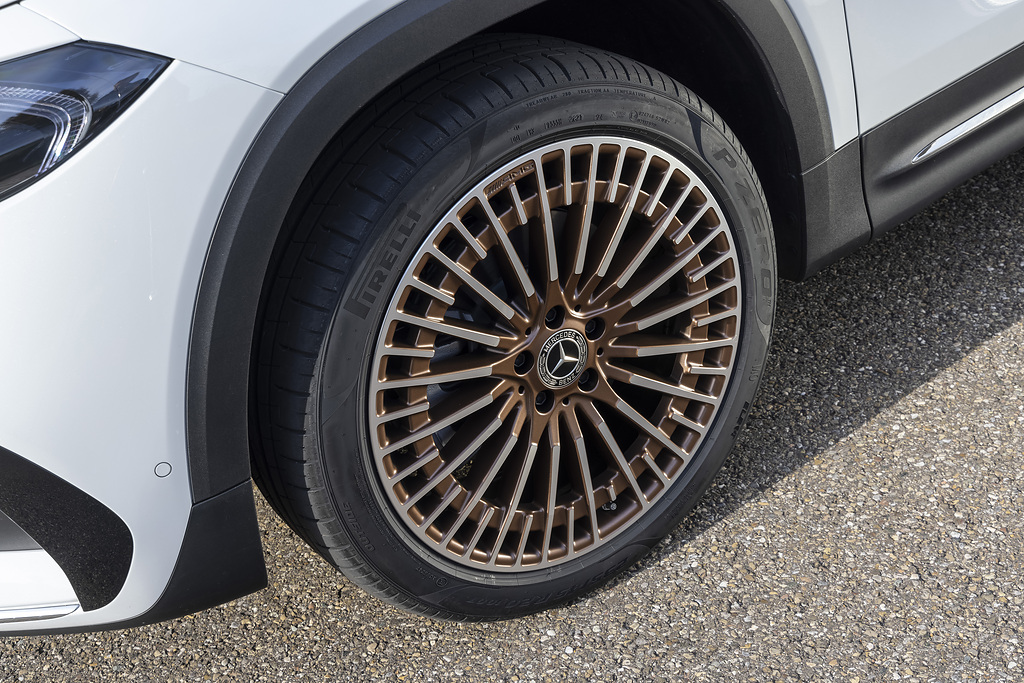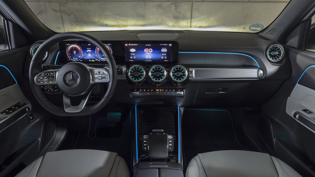 Den Unterschied zum GLB bestimmt im dritten Mercedes E-SUV der typische EQ-Look mit dem schwarzen Grill, der windschnittig geglätteten Frontpartie, den aerodynamischeren Felgen und den LED-Leuchtbändern an der Front- und Heckpartie.