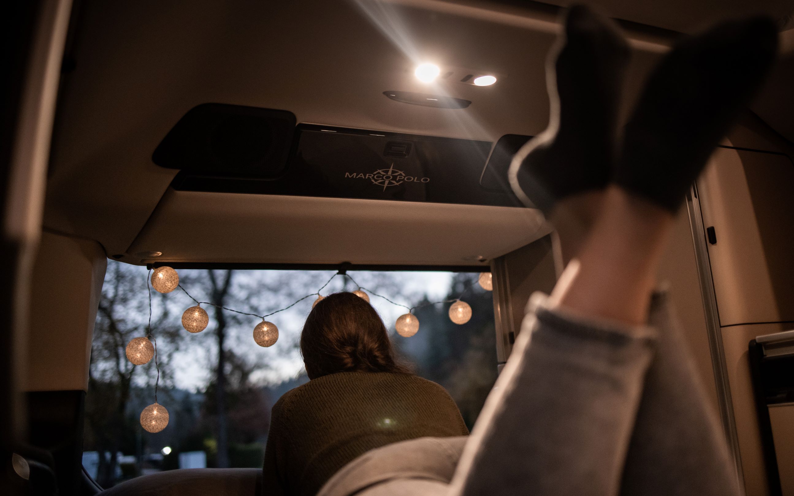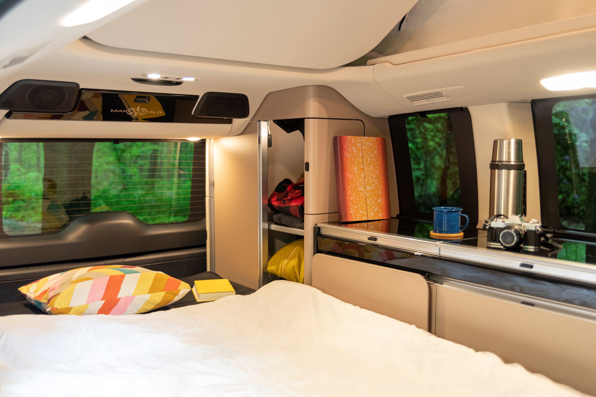 Fahrzeugtypen-Kombinationen sind beliebt. Der Marco Polo verbindet die Außenmaße eines Kompakt-Vans mit den inneren Werten eines Wohnmobils. Mit ihm können Passagier:innen campen fahren, nach dem Urlaub passt das Auto aber auch problemlos in die Tiefgarage oder kann für größere Besorgungen verwendet werden.