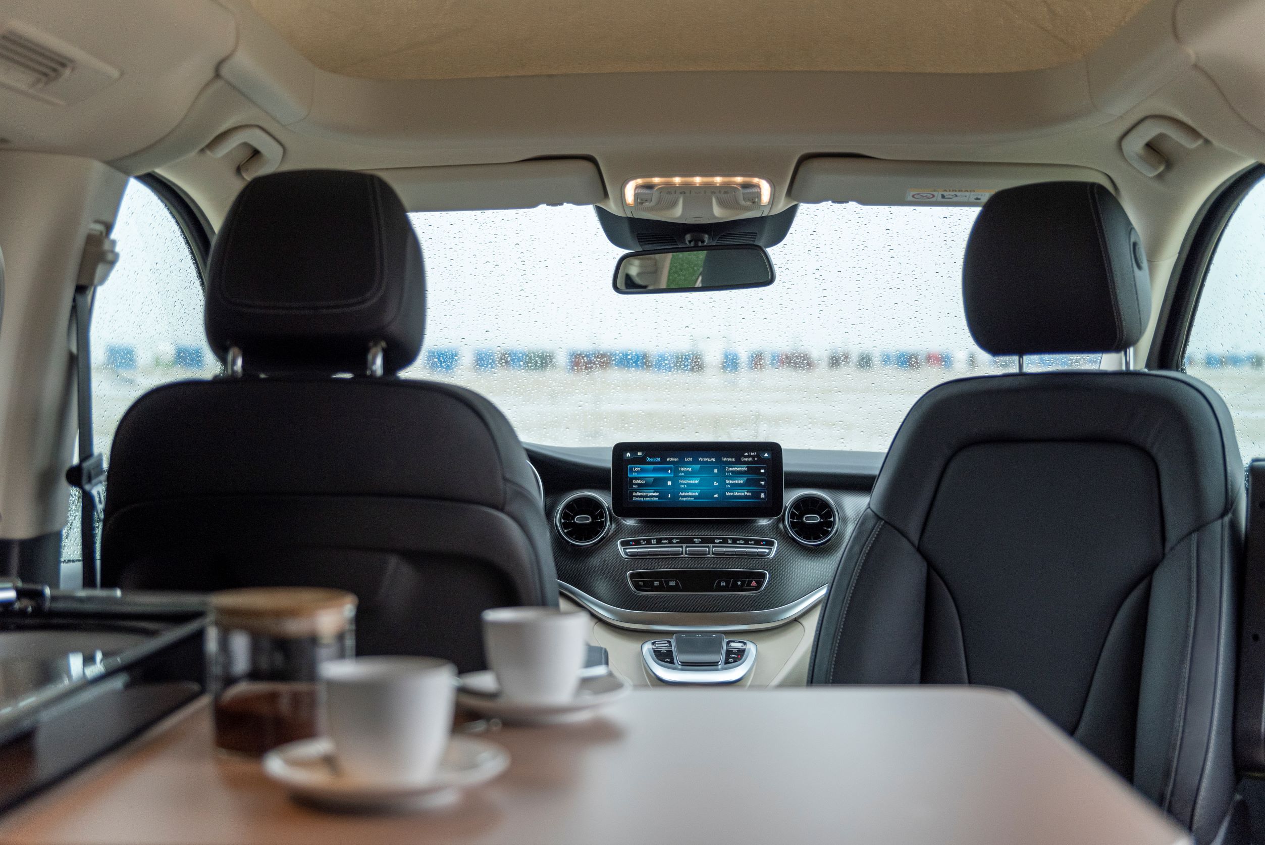 So lassen sich die Fahrsitze beispielsweise um 180 Grad drehen. Dann können die Reisenden entspannt am integrierten Tisch essen oder die weitere Route planen.
