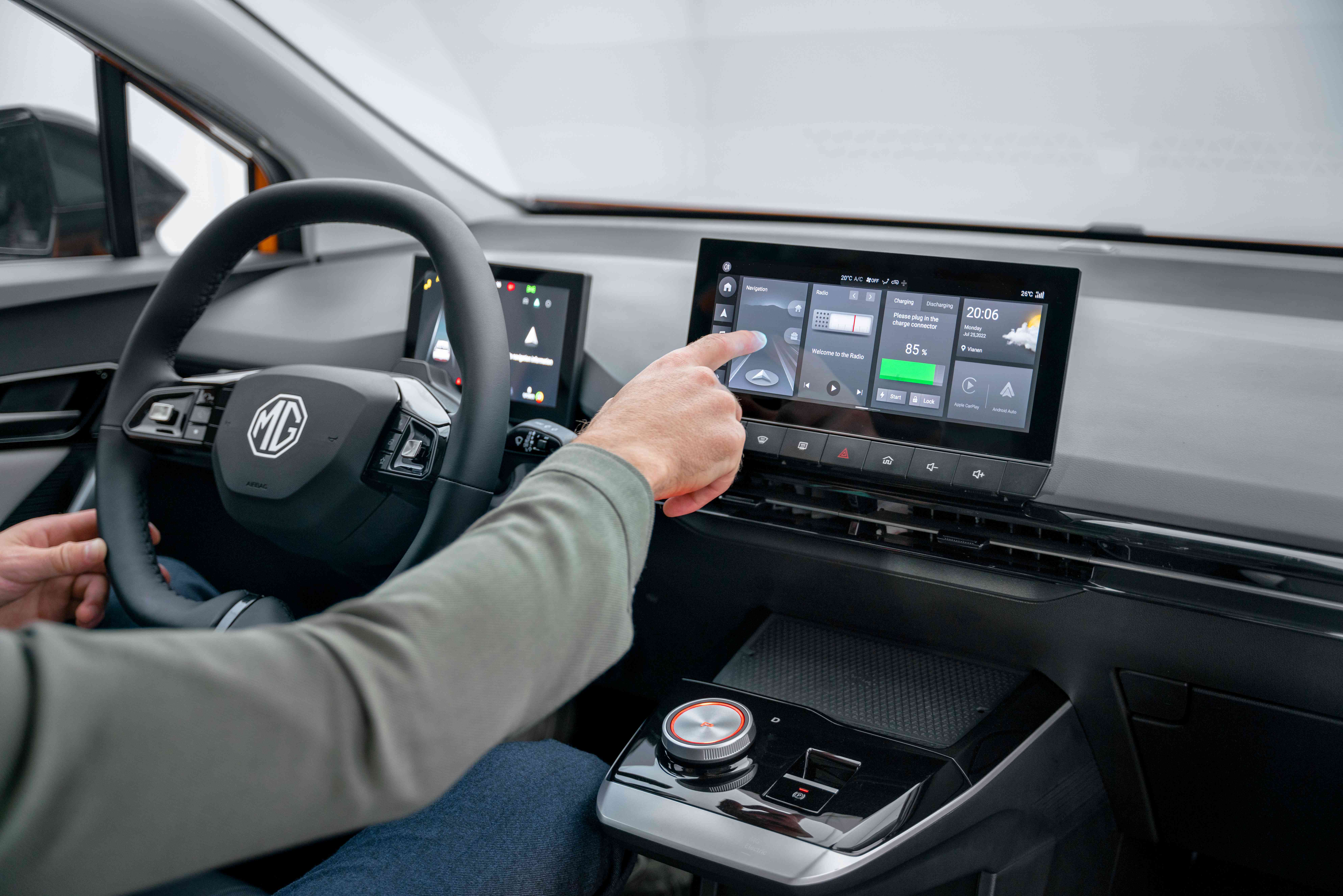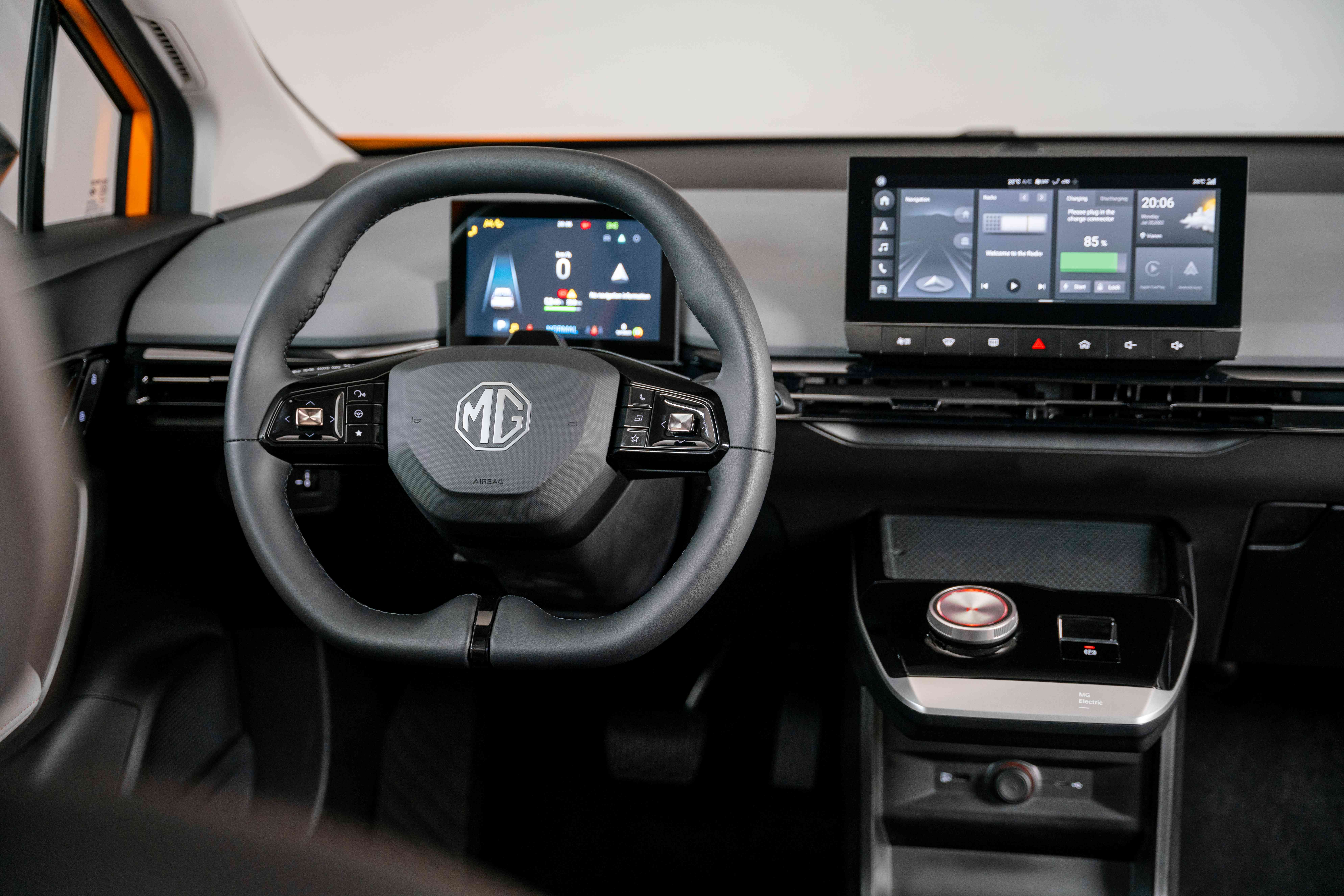 Das Cockpit und der Innenraum des MG4 wirken schlicht und aufgeräumt. Wer sich ans Interieur und die Innenausstattung des VW ID.3 erinnert fühlt, liegt richtig. Die Bildschirme zeigen digital an. Ein kleiner im 7-Zoll-Format sitzt hinter dem Lenkrad. Ein zweiter im Querformat mit 10,5 Zoll Bildschirmdiagonale thront zentral über der Mittelkonsole.