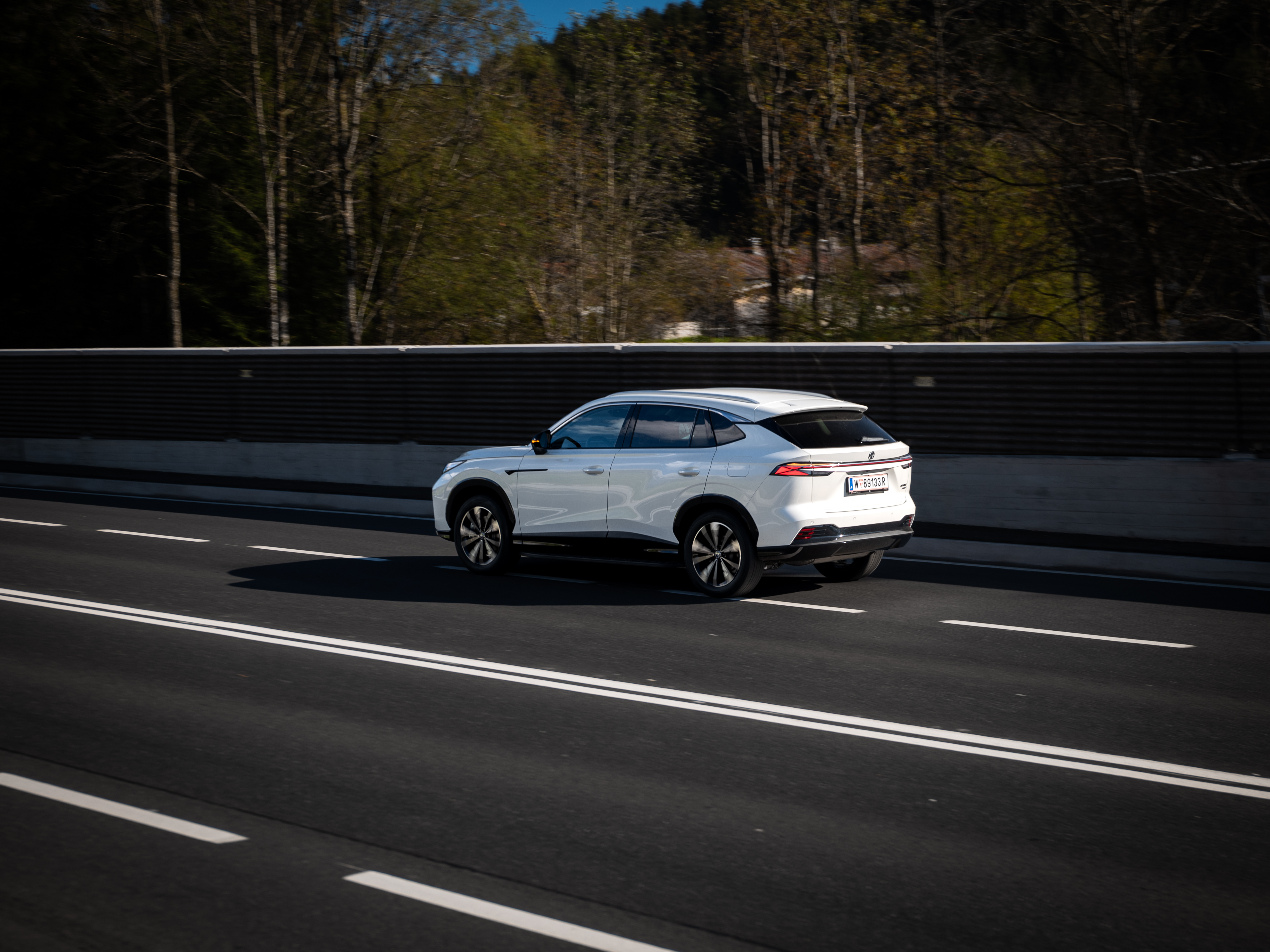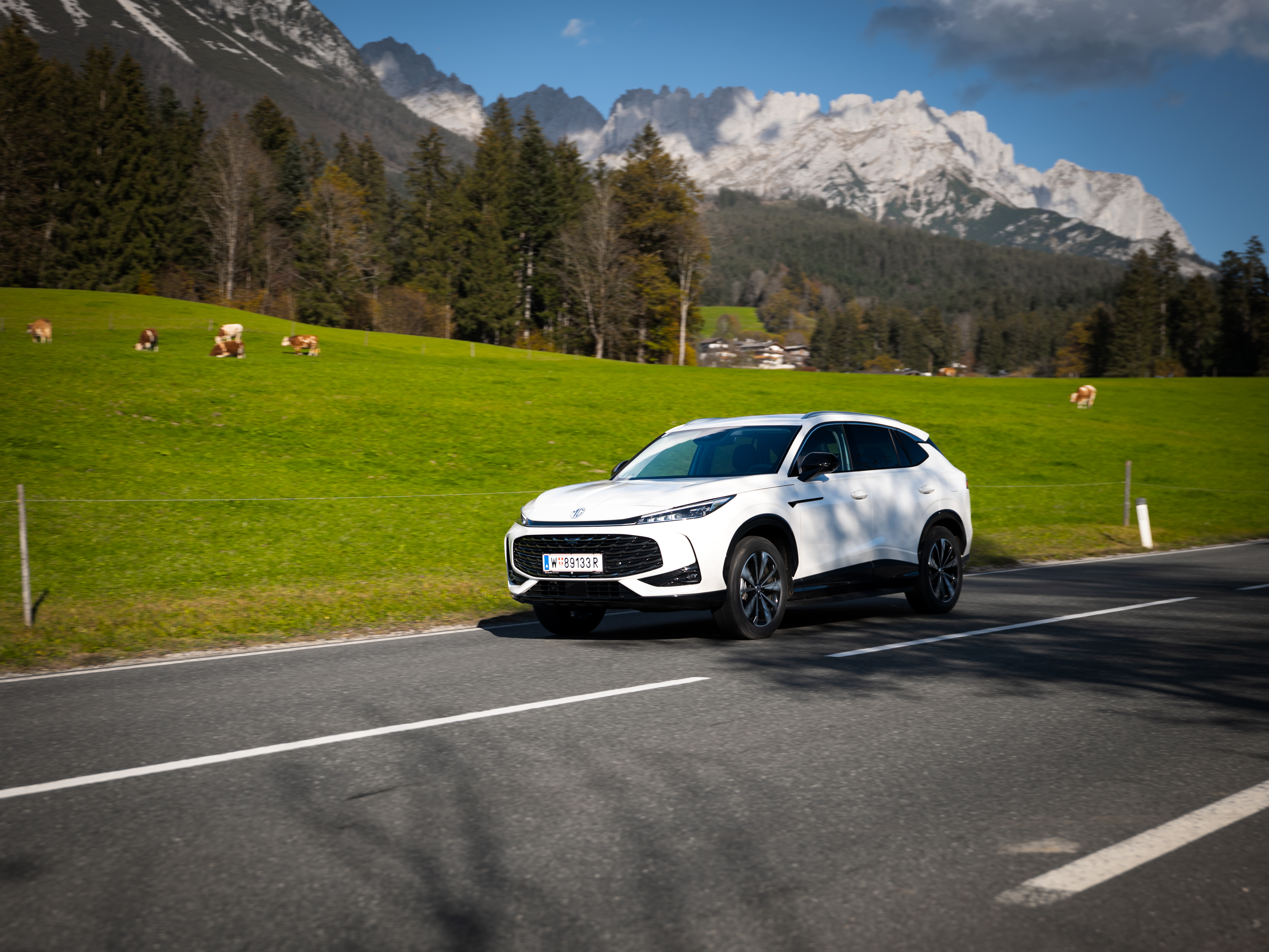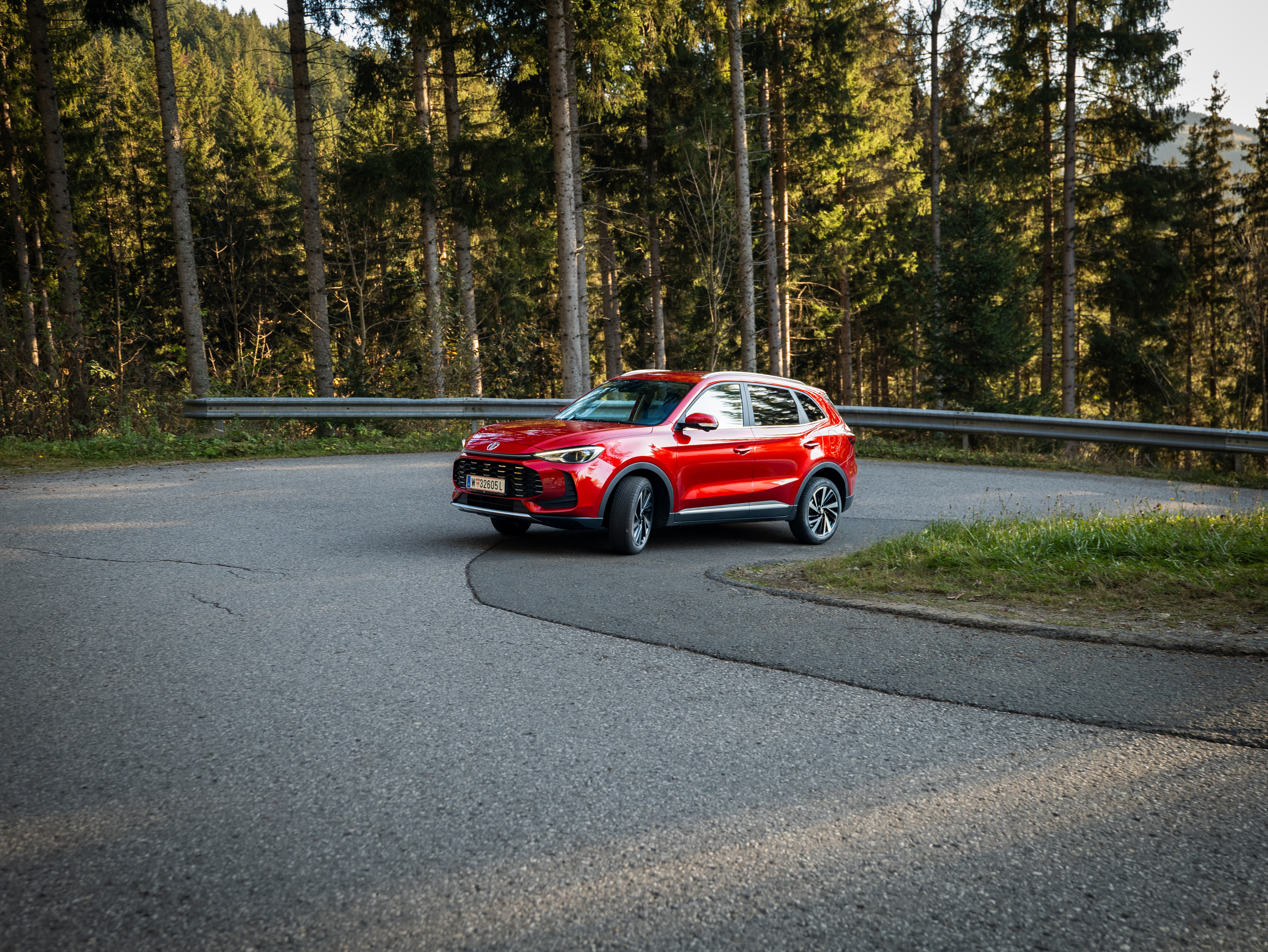 Wer Fahrspaß sucht, wird den MG nicht kaufen. Wer Ruhe liebt, schon eher. Das Fahrwerk ist weich abgestimmt, federt angenehm, lässt aber auch ein bisschen Wanken in Kurven zu. Die Lenkung fühlt sich leichtgängig und ausreichend direkt an, die drei Modi (Komfort, Normal, Sport) unterscheiden sich kaum. Unterm Strich ist der HS Hybrid+ ein komfortables Reiseauto. Auch bei höheren Geschwindigkeiten ist vom Benzinmotor kaum etwas zu hören – das stören schon eher die Windgeräusche.