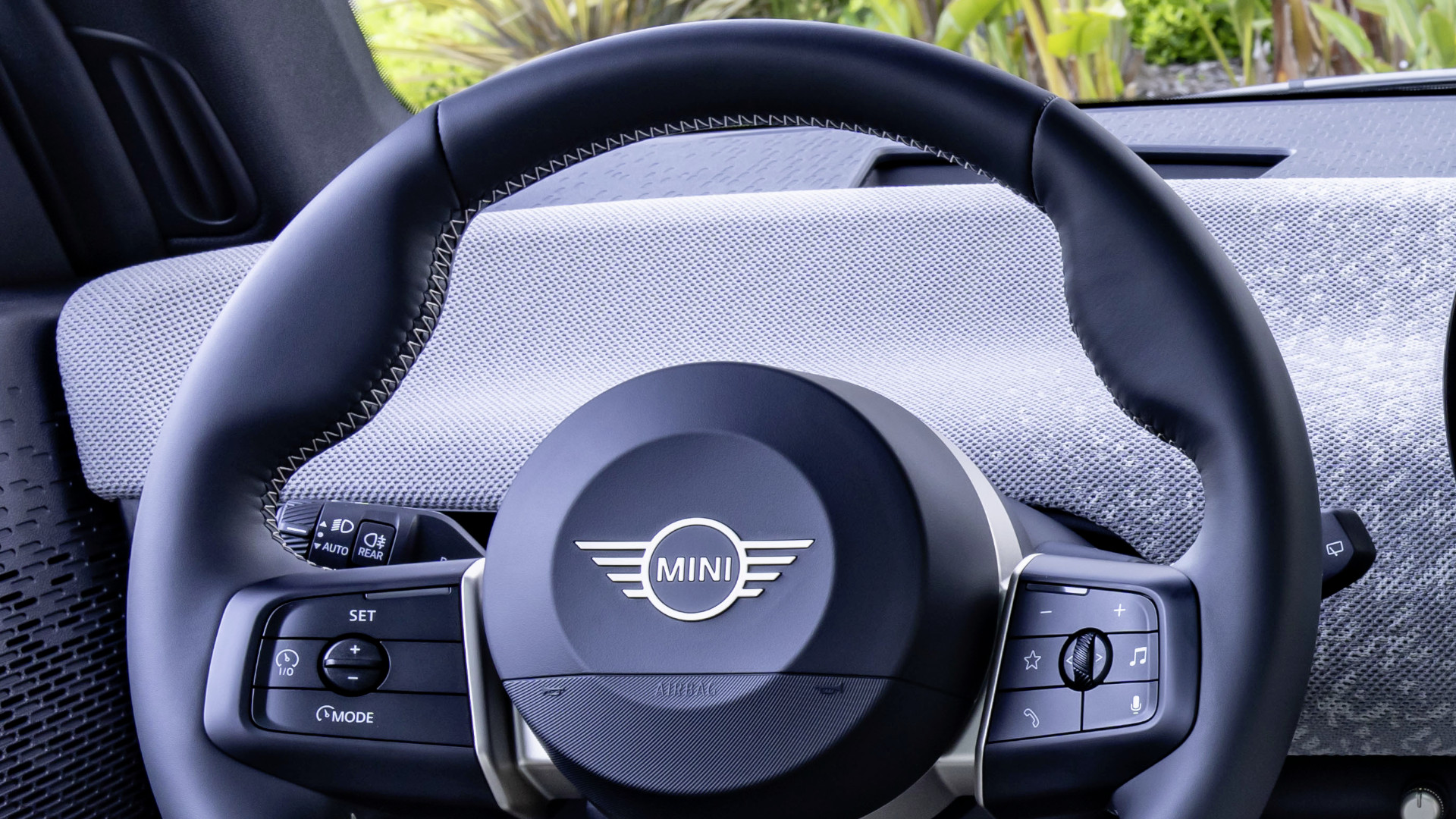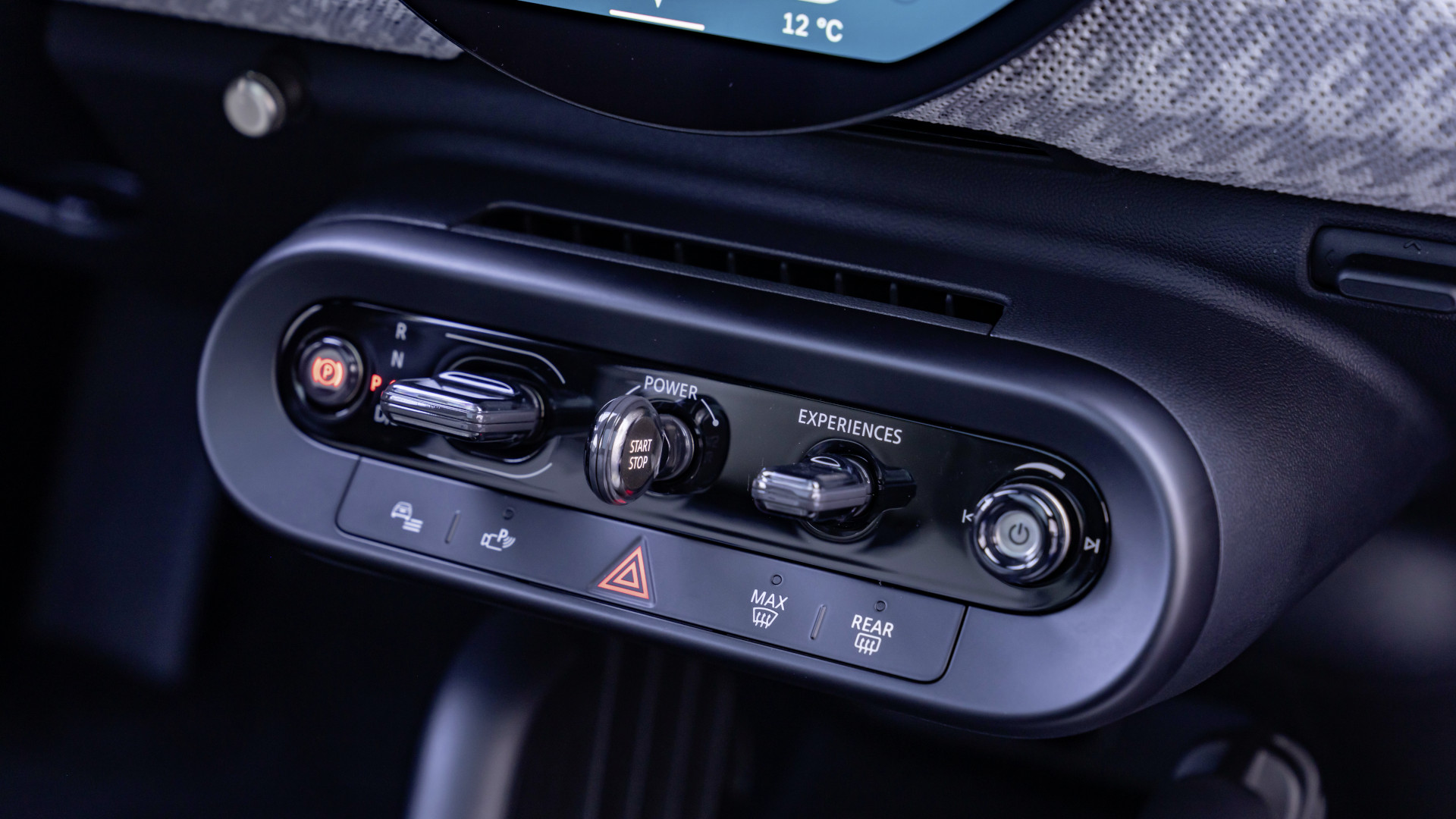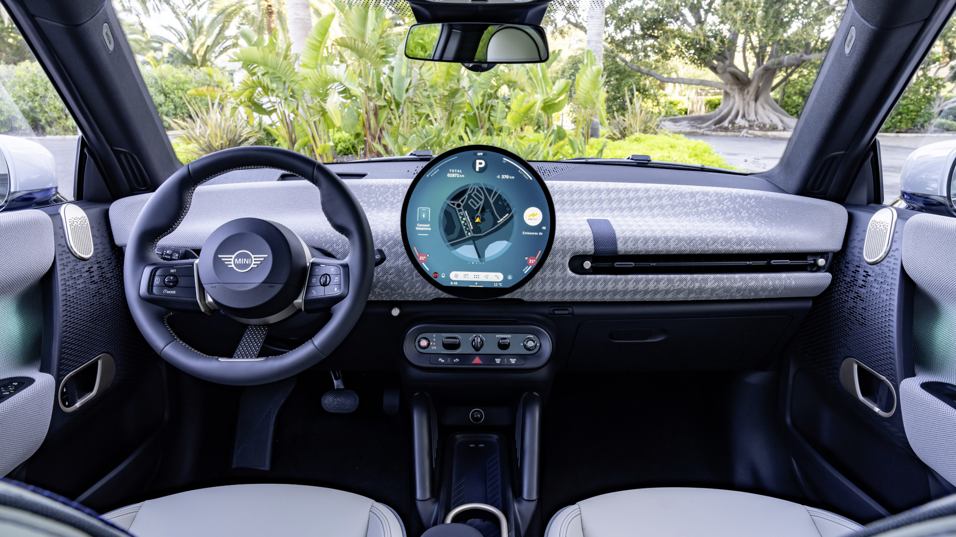 Wer im Mini Cooper Electric aufs Cockpit blickt, blickt ins Leere. Im Cooper E und SE finden sich keine klassischen Instrumente hinter dem Lenkrad. Den Bedienmittelpunkt bildet der zentrale Rundbildschirm mit 24 Zentimeter Durchmesser. Der elegante Touchscreen sitzt außerhalb der Blickrichtung. Wünscht man sich die Tempoanzeige und weitere Fahrinfos im Blick, muss man das Head-up Display (HUD) im teuren Ausstattungspaket hinzubestellen und erhält dann trotzdem eine billige HUD-Ausführung mit Plastikscheibchen.