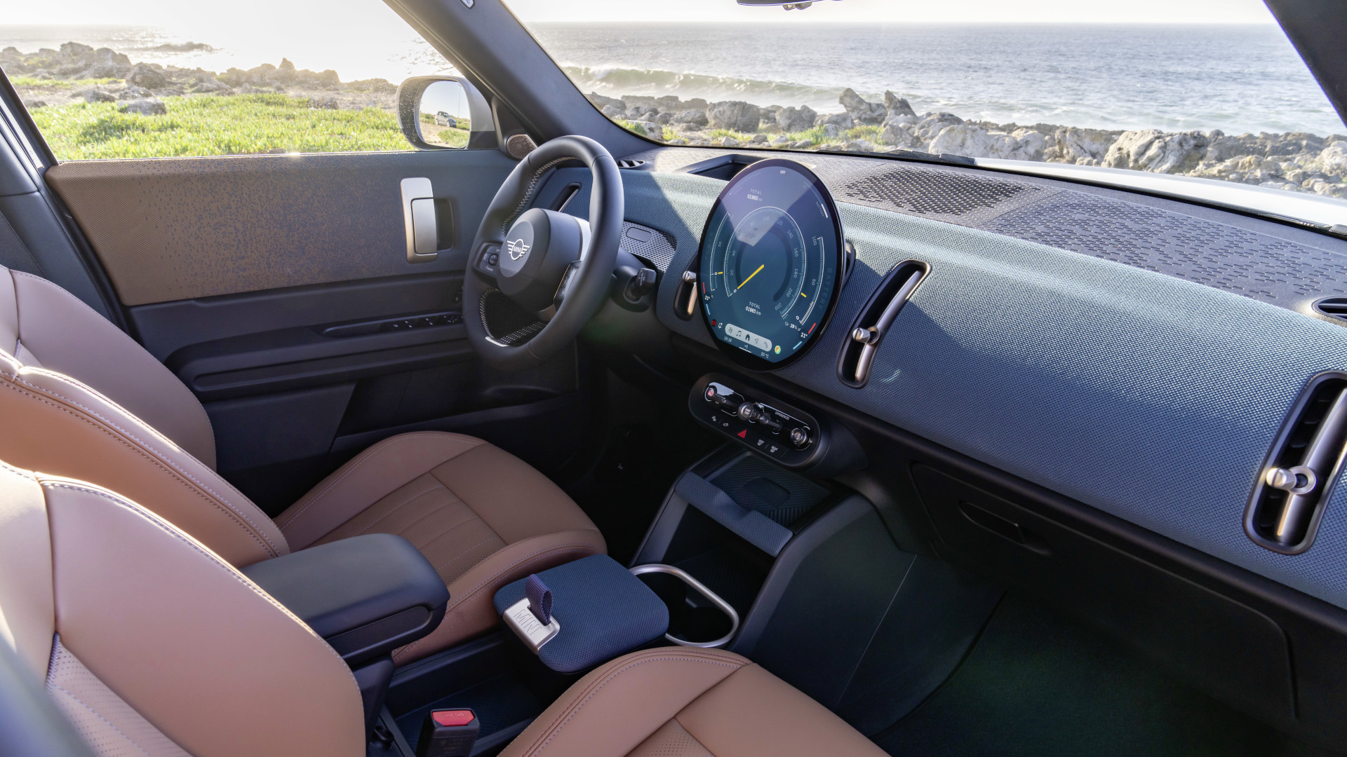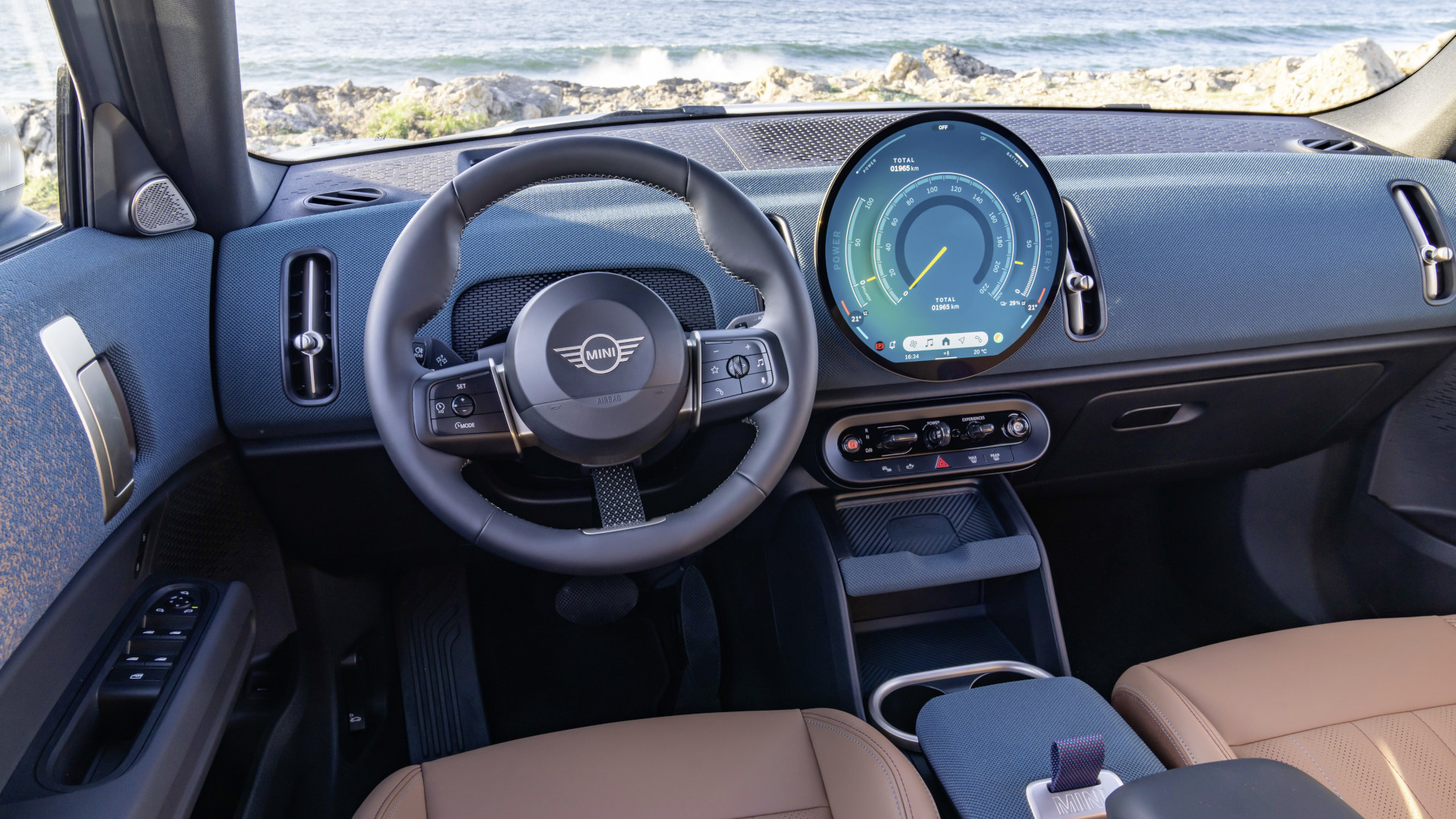 Im Cockpit und Interieur gefällt der neue Mini Countryman Electric mit dem sehr schicken, runden 9,4-Zoll-Display. Das Cockpit und Interieur wirken nicht mehr so verspielt wie bisher, sondern angenehm reduziert. Dass das zentrale Display auch die Tempoanzeige übernimmt, ist nicht optimal. Manches Kunststoffteil im Innenraum lässt ebenso noch Wünsche zur Verbesserung übrig. Die Verarbeitung des erstmals zusammen mit dem BMW iX1 in Leipzig vom Band laufenden Countryman stimmt positiv.
