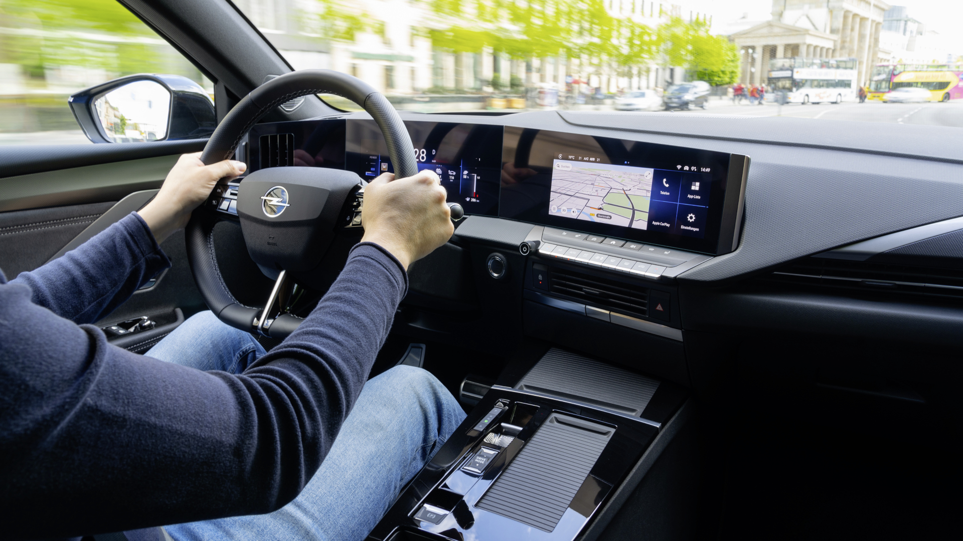 Das Meiste wird im Astra Cockpit trotz der verbliebenen Schalter über frei konfigurierbare Apps auf dem zentralen Bildschirm erledigt. Früher hießen die Tasten „Menü“ und „Radio“, heute die Tastflächen „App Liste“ und „Medien“. Die Lautstärke wird im Astra Electric aber weiterhin – gut so – über einen klassischen Drehregler eingestellt.