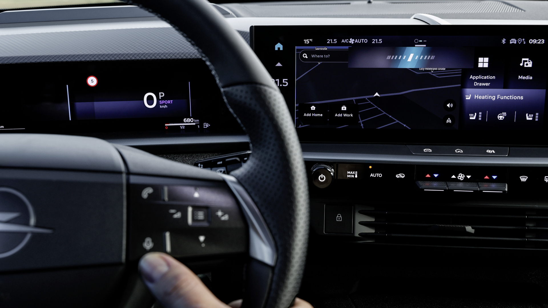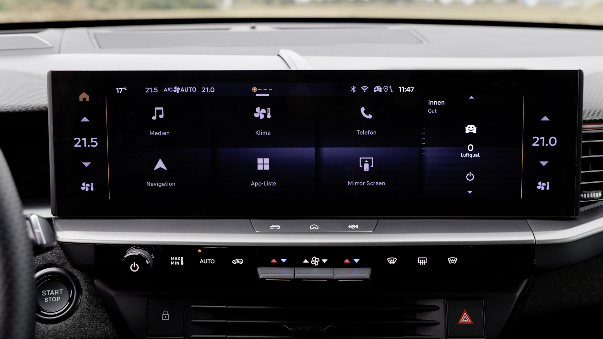 Im Gegensatz zu Marken wie Tesla verzichtet Opel im Grandland auf eine rein digitale Bedienung. Unter dem Infotainment kann per Knopf direkt auf das Menü für die Assistenzsysteme zugegriffen werden. Die Klimaanlage wird mit konventionellen Schaltern bedient, es gibt Tasten für Heck- und Frontscheibenheizung sowie einen klassischen runden Lautstärkeregler für das Radio.