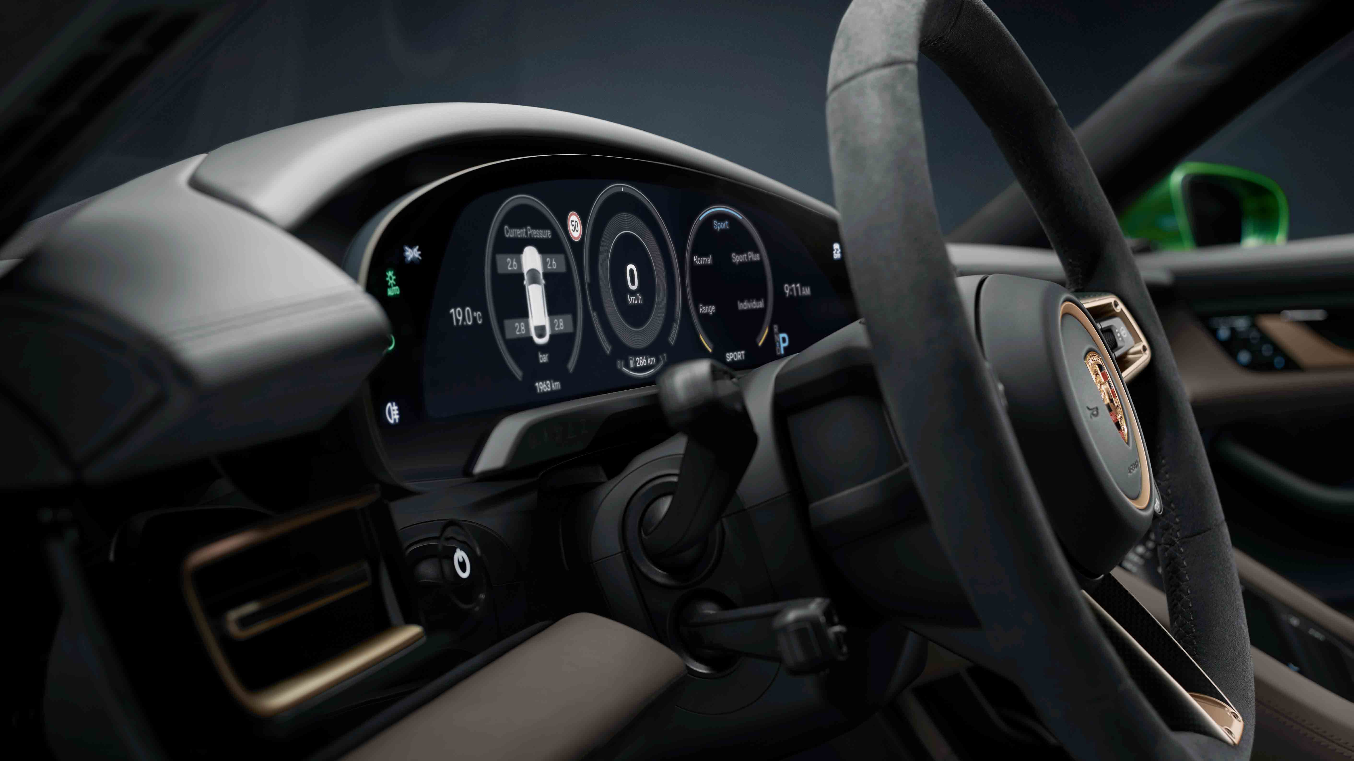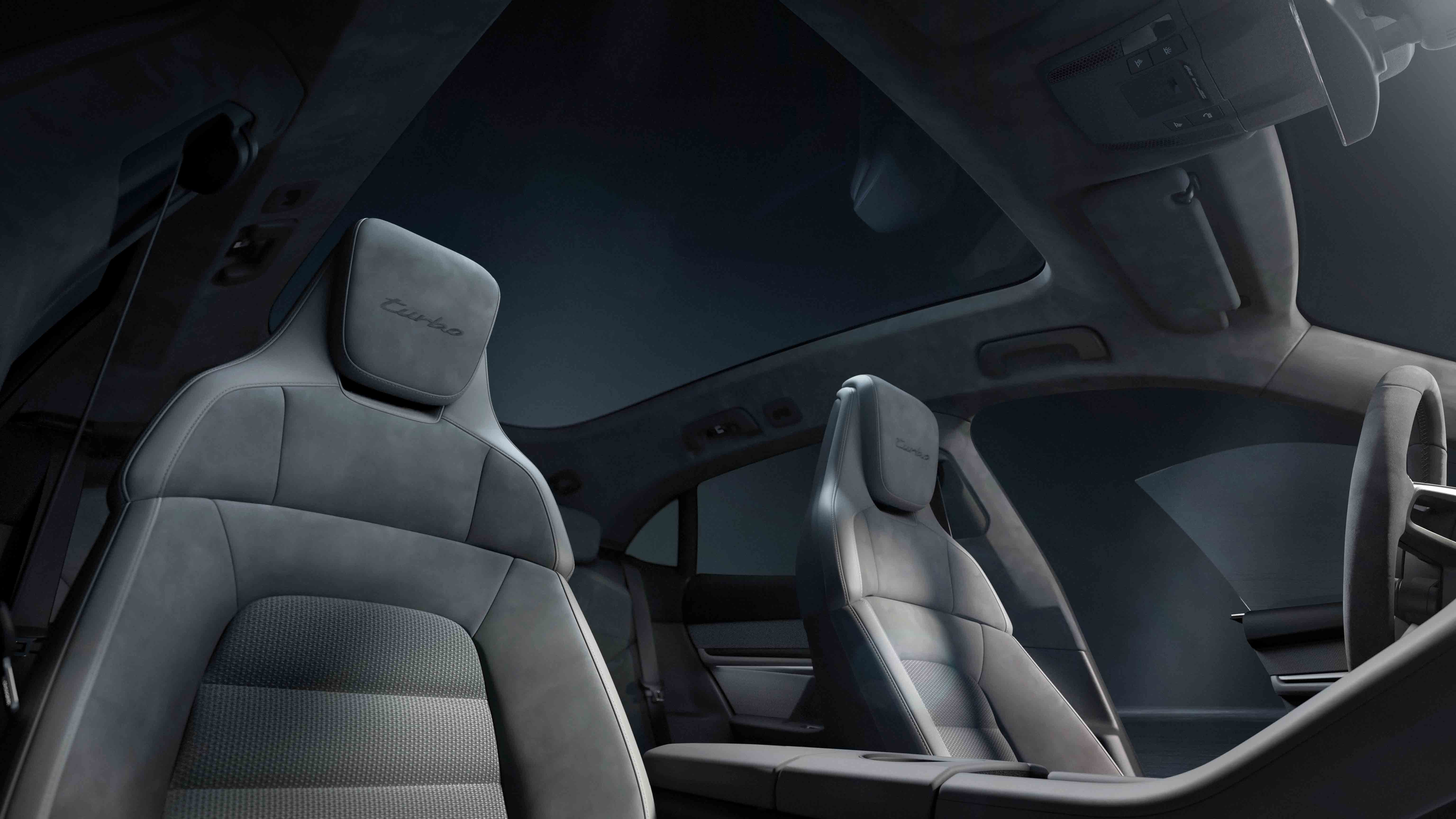 Die Turbo S Variante verfügt zudem über ein Interieur-Paket (Carbon), adaptive Sportsitze, ein GT Multifunktions-Sportlenkrad Race Tex, eine lederfreie Ausstattung (Bi-Color) sowie 21-Zoll Mission E Design Räder.