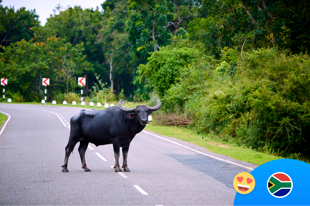 Nicht immer kommt uns ein Auto entgegen. In Ländern wie Südafrika kann es auch mal passieren, dass ein Pferd, ein Esel oder ein Schwein den Weg versperrt. Autofahrer müssen Tieren, die die Straße überqueren, Vorfahrt gewähren. Sie dürfen nicht schneller fahren oder sie absichtlich anfahren.