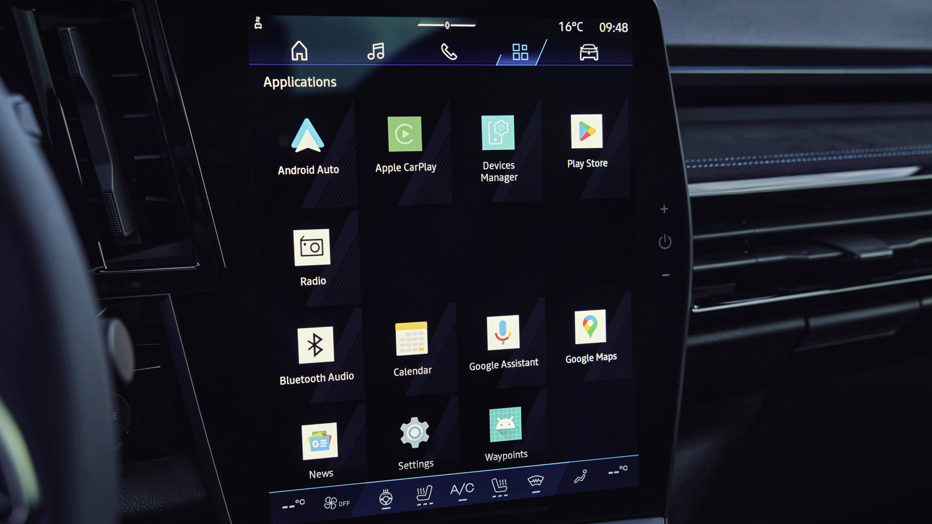 Ein absolutes Highlight des Austral ist das Infotainment-System. Ausgestattet mit einem großen 12-Zoll-Hochkant-Touchscreen und einem digitalen Kombiinstrument in gleicher Größe, bietet das System eine flüssige und reaktionsschnelle Bedienung. Die Technologie basiert auf Google Android Automotive, was unter anderem eine integrierte Google-Maps-Navigation mit Echtzeit-Verkehrsdaten, Sprachsteuerung via Google Assistant und den Zugang zum Google Play Store für Apps ermöglicht. Diese Integration macht das Infotainment zu einem der besten Systeme in dieser Klasse. Zusätzlich sind Apple CarPlay und Android Auto kabellos nutzbar.