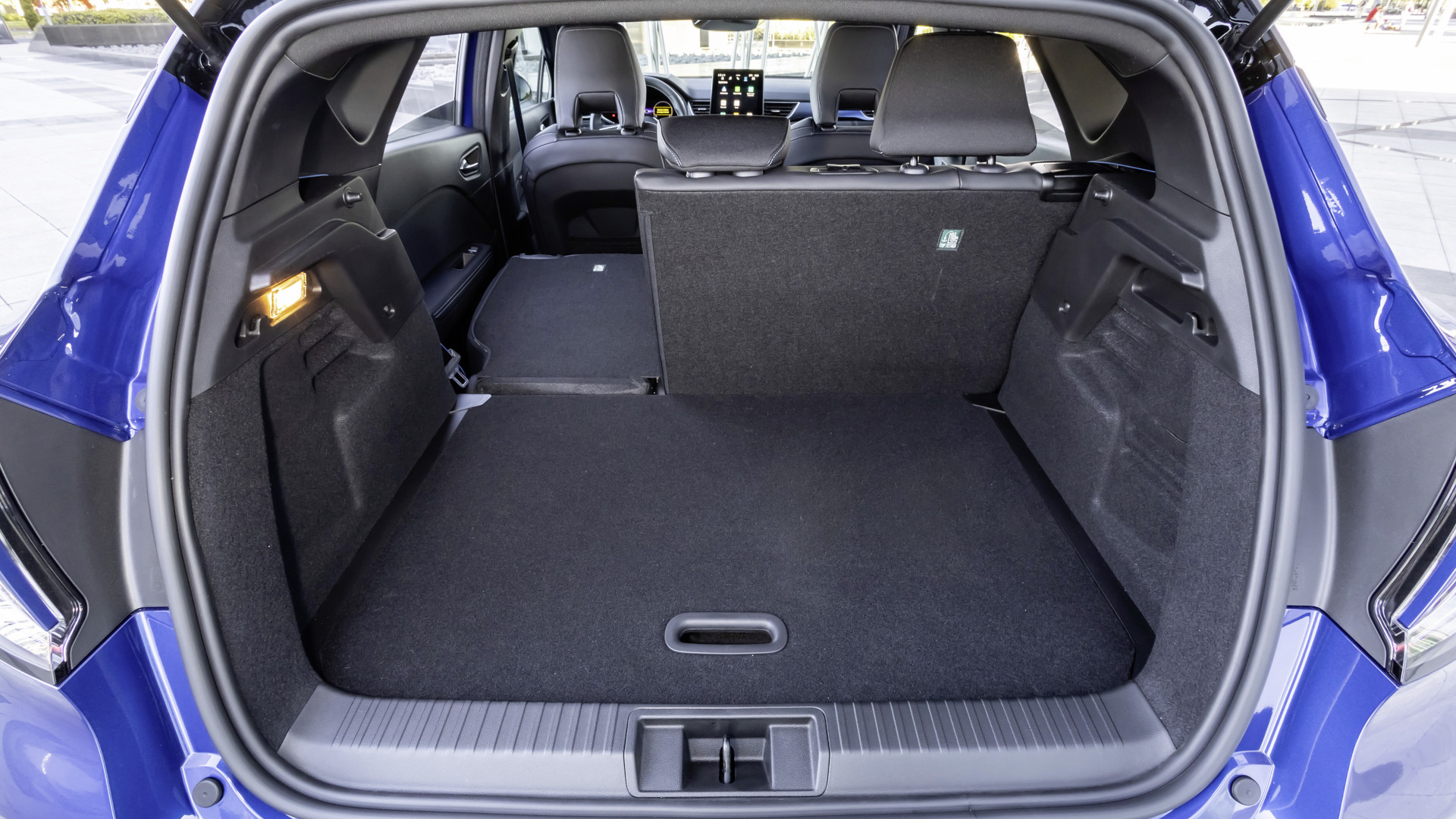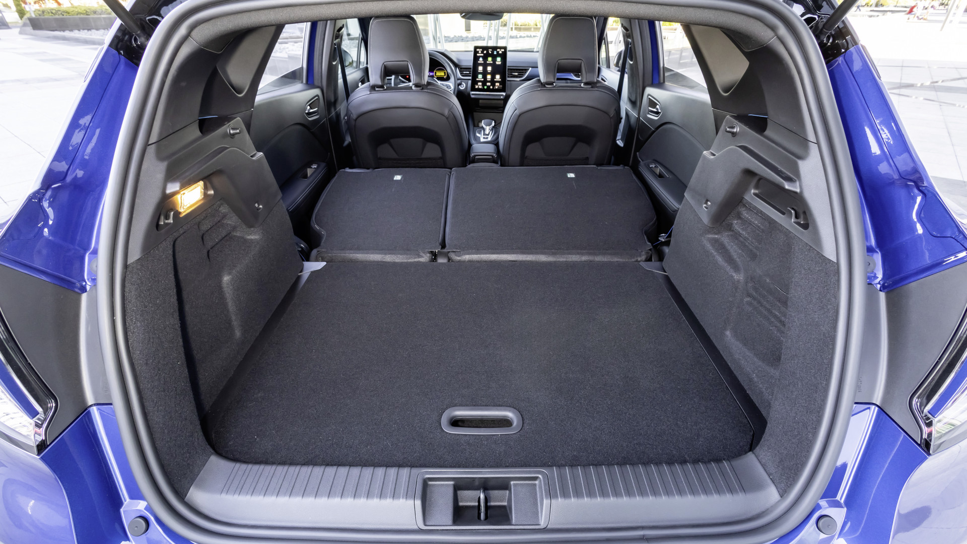 Was den Captur besonders macht, ist die um 16 Zentimeter verschiebbare Rückbank. Damit ist er super flexibel. So kann man sich aussuchen, ob man lieber mehr Beinfreiheit im Fond oder ein größeres Kofferraumvolumen haben möchte. Je nach Ausstattung gibt es beim Benziner einen Kofferraum mit einem Volumen zwischen 422 und 536 Litern. Wenn man die Rückbank umklappt, kann man bis zu 1.275 Liter Gepäck verstauen. Beim E-Tech Hybrid ist der Kofferraum etwas kleiner, weil der Hybridantrieb mehr Platz braucht. Hier sind 322 bis 440 Liter drin. Wenn man die Rückbank umklappt, kann man 1.118 Liter unterbringen.