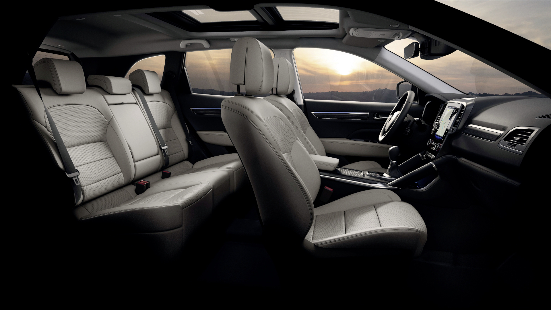 4,67 Meter Länge und 1,84 Meter Breite sorgen dafür, dass eine vierköpfige Familie im fünfsitzigen Koleos bequem sitzt. Die breiten Vordersessel, die sich im höchsten Ausstattungsgrad Initiale Paris beheizen und belüften lassen, bieten genauso viel Sitzkomfort wie die im Topmodell mit feinem Leder bezogene Rückbank.
