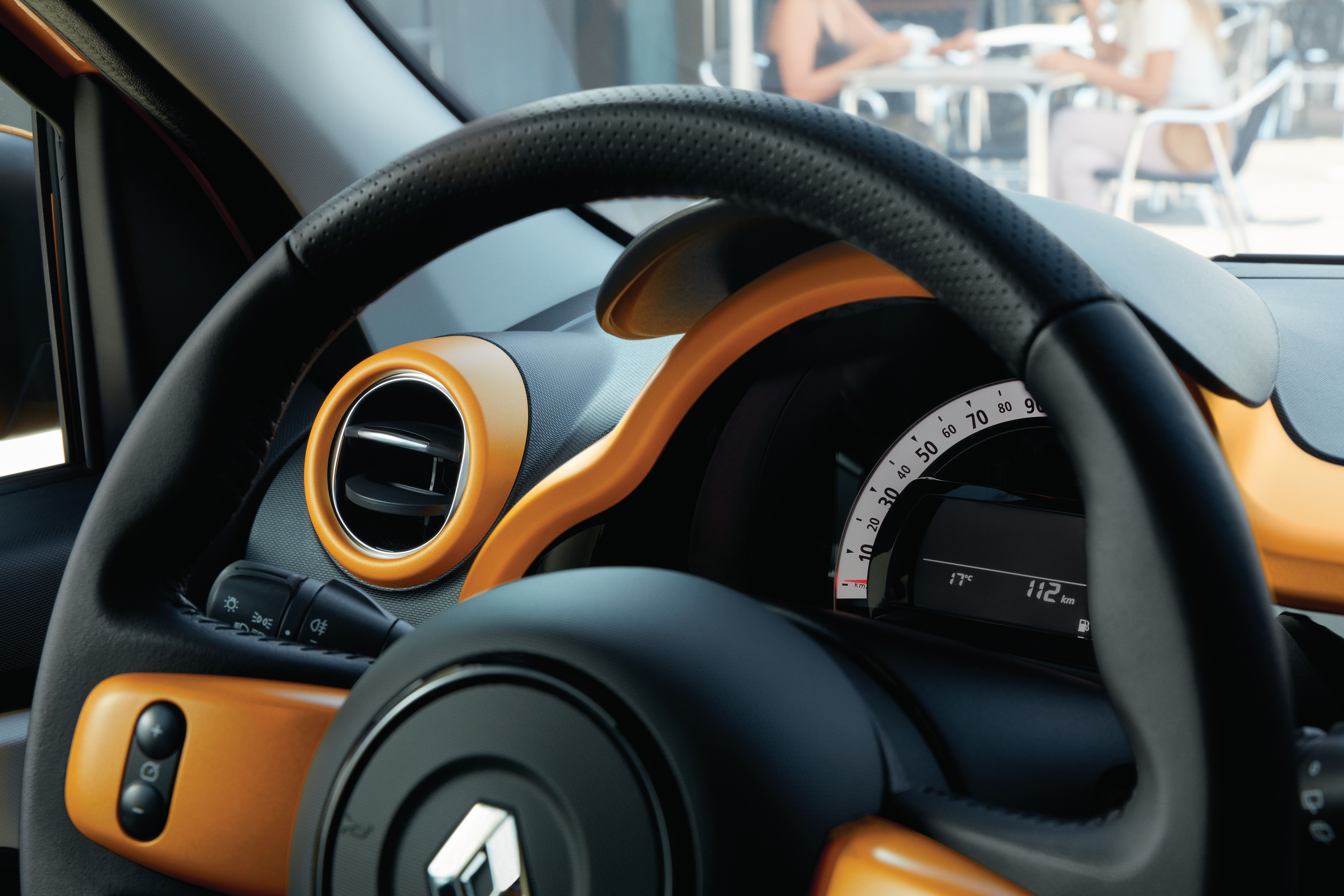 Der Twingo Electric ist ein modernes und jugendliches Auto, das zeigen auch die Außenlackierungen, und die Farbgebung im Innenraum. Dort hat man ebenfalls die Möglichkeit Armaturenbrett, Schaltknauf und Sitze farblich zu individualisieren.