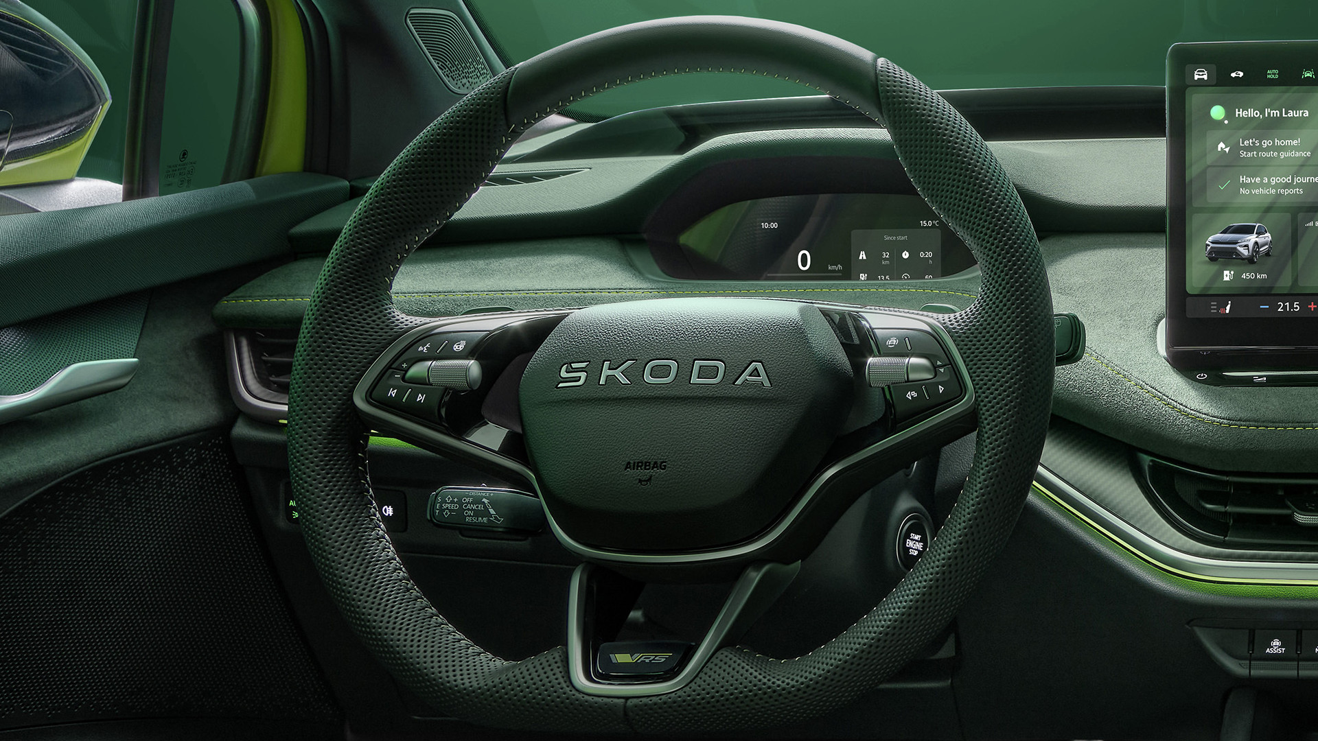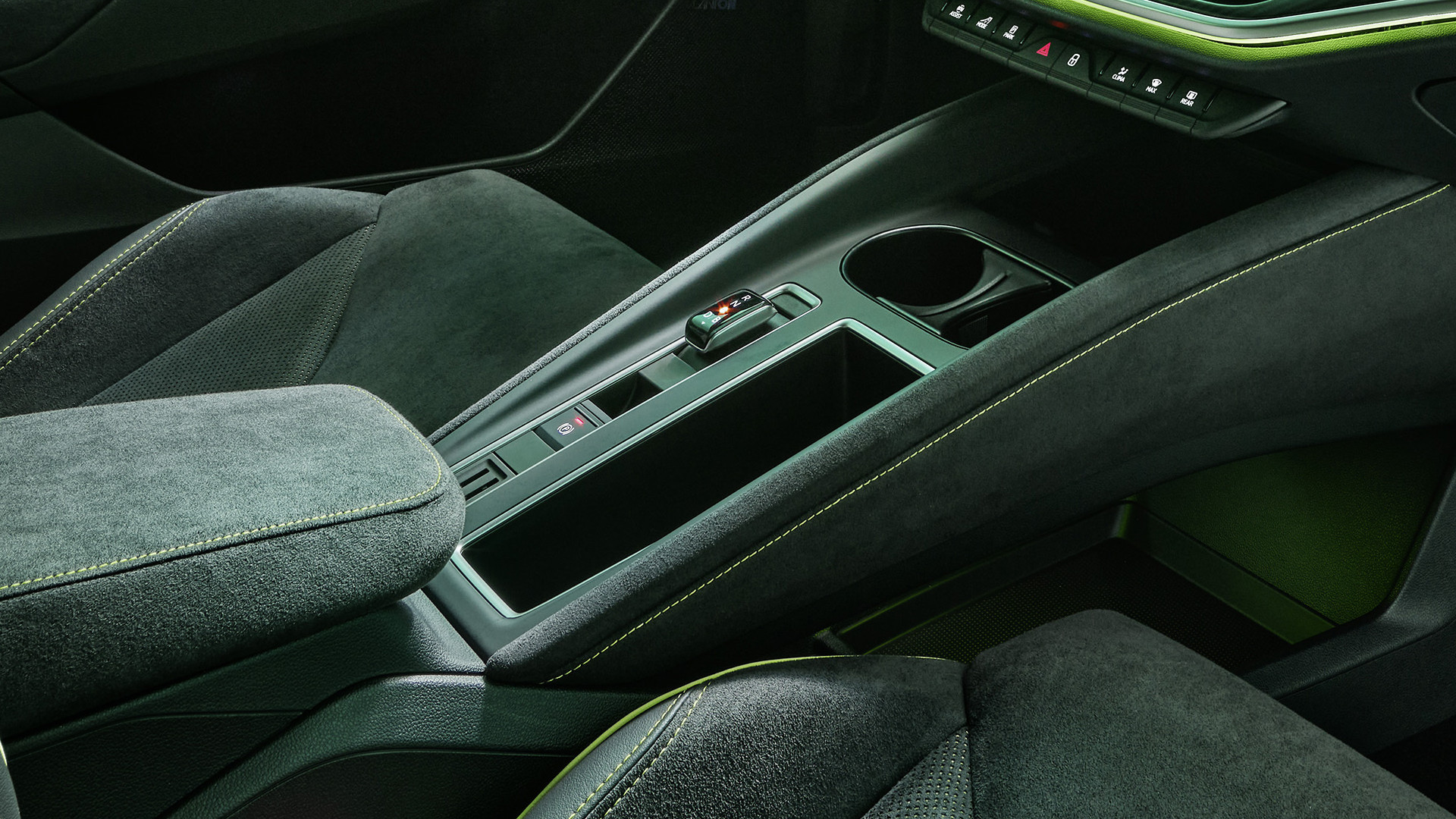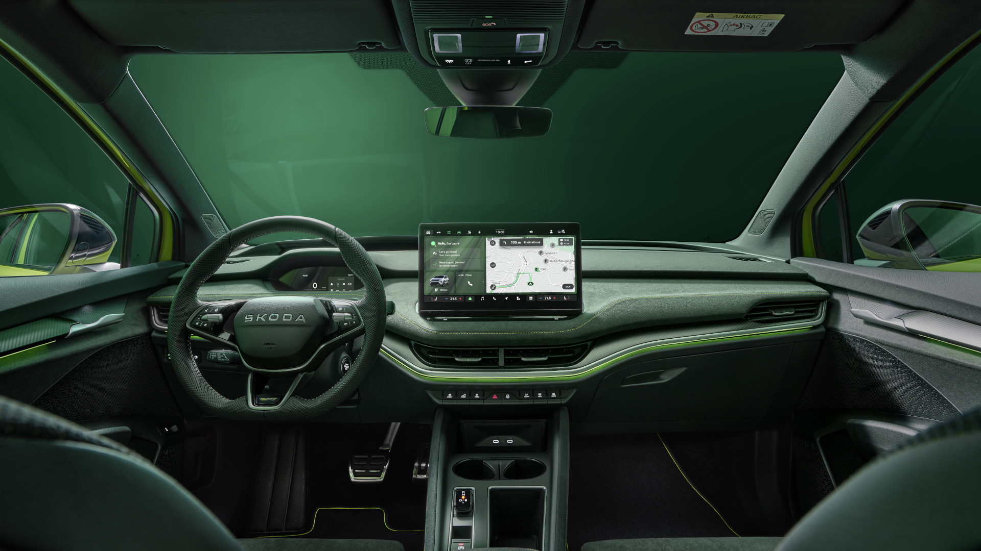 Der Innenraum des Skoda Elroq RS ist ein gelungenes Zusammenspiel aus sportlichem Design und funktionaler Ausstattung. Die Innenausstattung setzt auf solide Materialien, die einen qualitativen Eindruck machen, ohne Luxusambiente zu vermitteln. Mikrofaserbezüge, Carbon-Dekorleisten und Ziernähte in Lime-Grün sorgen für ein sportliches Ambiente, das sich nahtlos in das Gesamtbild des Fahrzeugs einfügt. Das Interieur ist insgesamt gut verarbeitet, wobei auch die praktischen "Simply Clever"-Details wie die gut durchdachten Ablagemöglichkeiten und die Wendematte im Kofferraum hervorstechen. Die Sportsitze bieten nicht nur guten Halt, sondern sind auch komfortabel, was den Elroq RS für Langstreckenfahrten bestens geeignet macht.