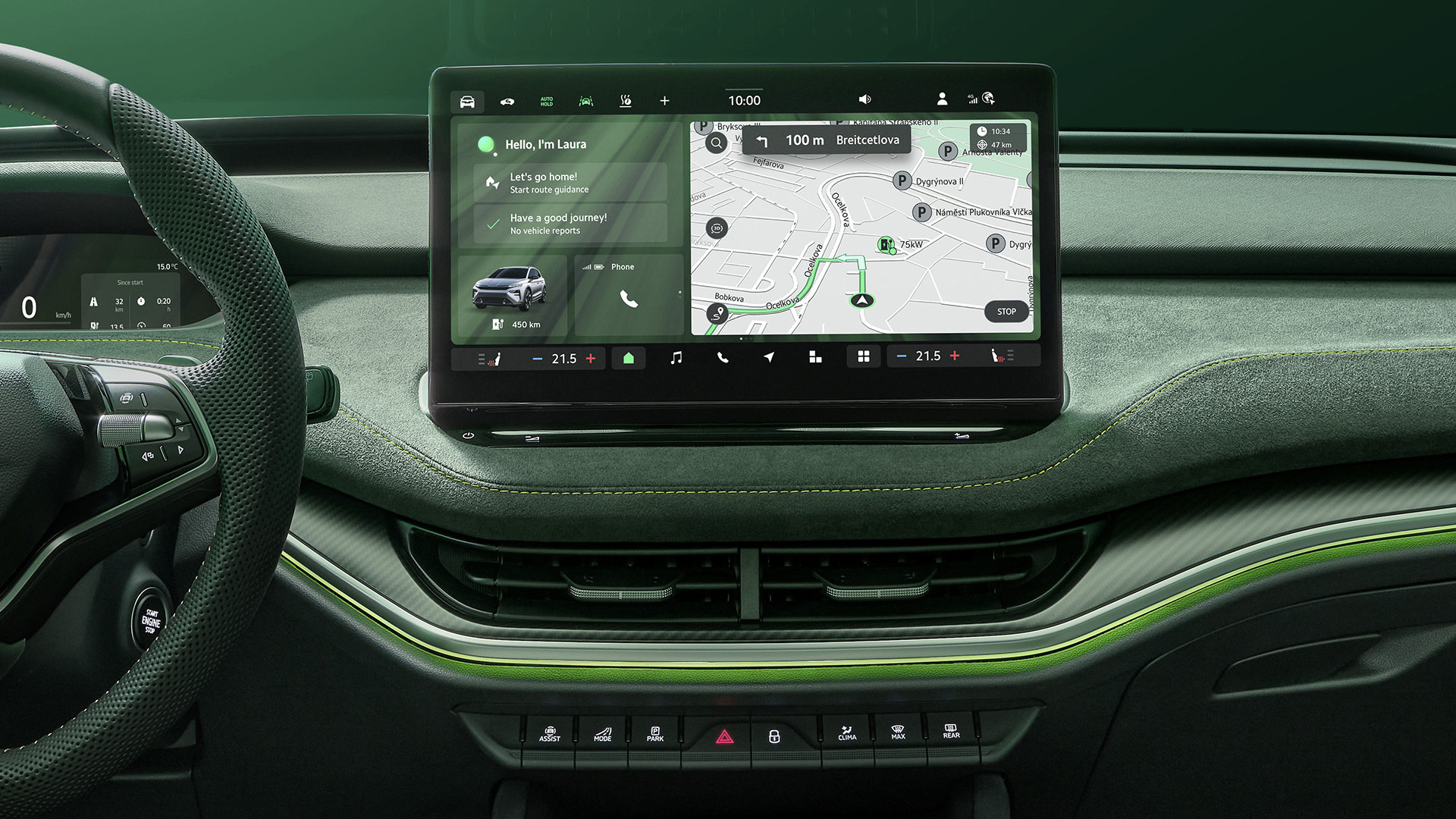 Das Infotainment-System im Elroq RS ist das Zentrum des Innenraums. Das 13-Zoll-Infotainmentdisplay bietet eine klare und gut strukturierte Benutzeroberfläche, die über das integrierte System für Navigation, Musik und Konnektivität gesteuert wird. Sprachsteuerung und die Integration von Apple CarPlay und Android Auto sind natürlich ebenso vorhanden. Darüber hinaus ist das Cockpit digital und beinhaltet ein 5-Zoll-Fahrerdisplay, das alle relevanten Fahrdaten übersichtlich darstellt. Beim RS-Modell sind außerdem einige Optionen, die beim herkömmlichen Elroq Aufpreis kosten, bereits serienmäßig enthalten. Dazu zählt neben dem Head-up-Display auch die 360°-Umgebungskamera.