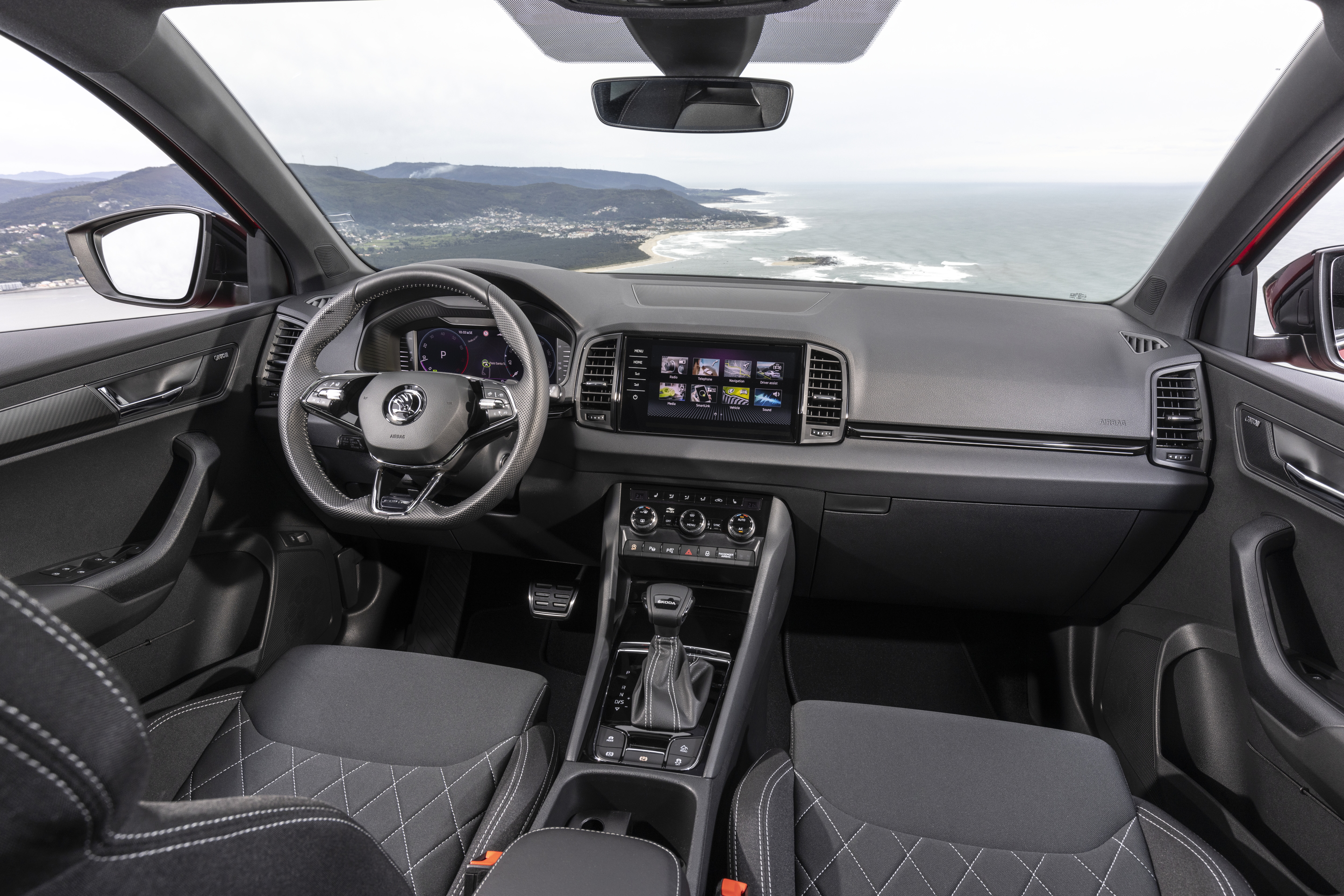 Wie für Skoda typisch, verfügt der Karoq Sportline über praktische Funktionen und Ablagefächer im Innenraum. So sind Parktickethalter in Griffnähe, Befestigungen für ein Tablet an den Kopfstützen und der Mittelkonsole, eine Stoff-Gummi-Matte für schmutzige Utensilien, ein Eiskratzer im Tankdeckel und sogar ein Regenschirm unter dem Beifahrersitz serienmäßig an Bord. Der Kofferraum, in dem sich eine abnehmbare LED-Akku-Taschenlampe befindet, führt die Praktikabilität fort und fasst 521 bis 1.630 Liter Volumen. Optional kann er mit einer elektrischen Heckklappenöffnung ausgestattet werden.