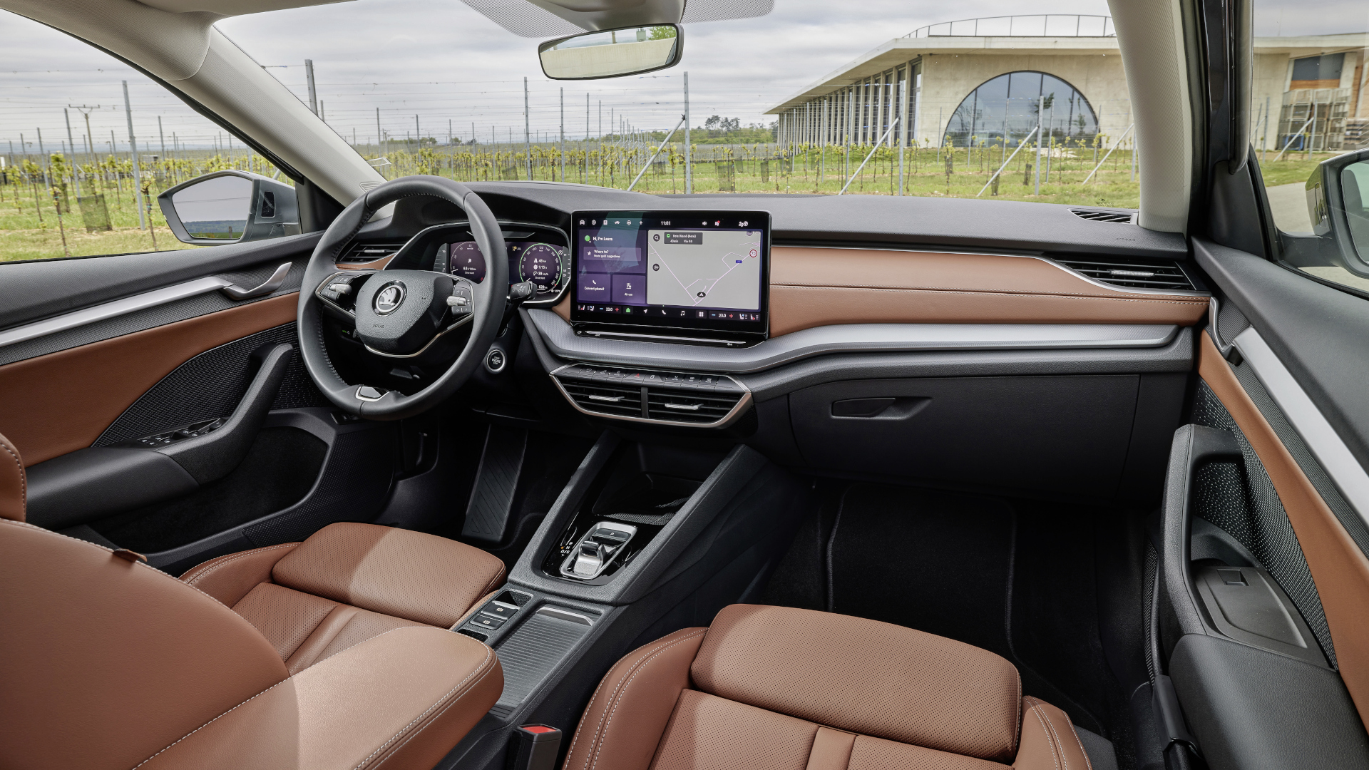 Der Innenraum des Škoda Octavia präsentiert sich hochwertiger mit seinem neuen Armaturenbrett und neuen Materialien. Mit der Golf-8-Plattform ziehen digitale Instrumente und erstmals in einem Škoda ein Head-up-Display, das wichtige Fahrdaten auf die Frontscheibe projiziert, im Cockpit ein.