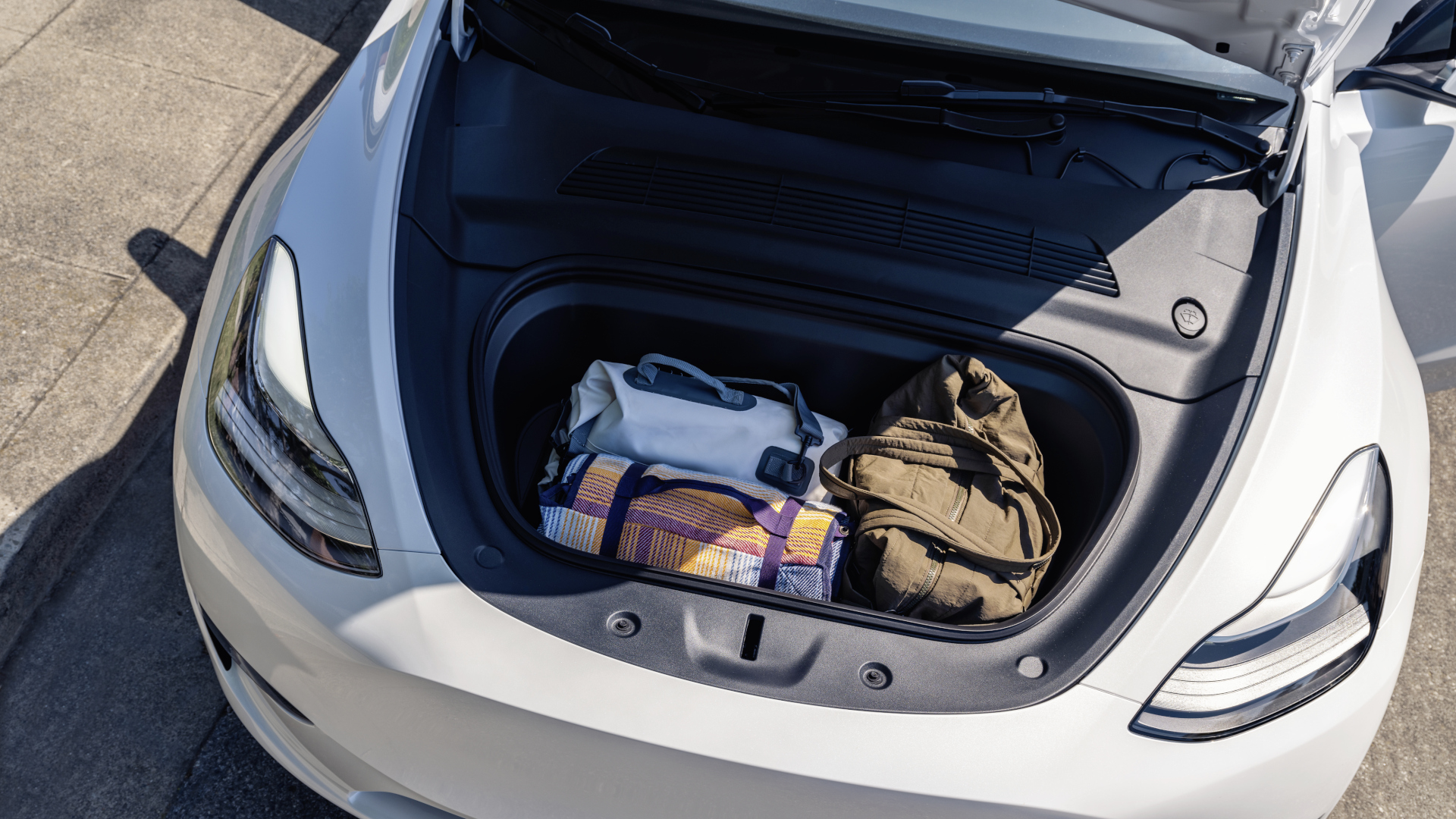 Im geräumigen Fach unter dem Kofferraumboden kommt noch mehr unter. Der für Elektroautos so typische Zusatzstauraum unter der Fronthaube, der „Frunk“ (ein Kunstwort aus „Front“ und „Trunk“, englisch: Kofferraum), ist so groß, dass neben den Ladekabeln auch noch eine Reisetasche Platz findet. Bei über 100 Litern liegt das Stauvolumen.