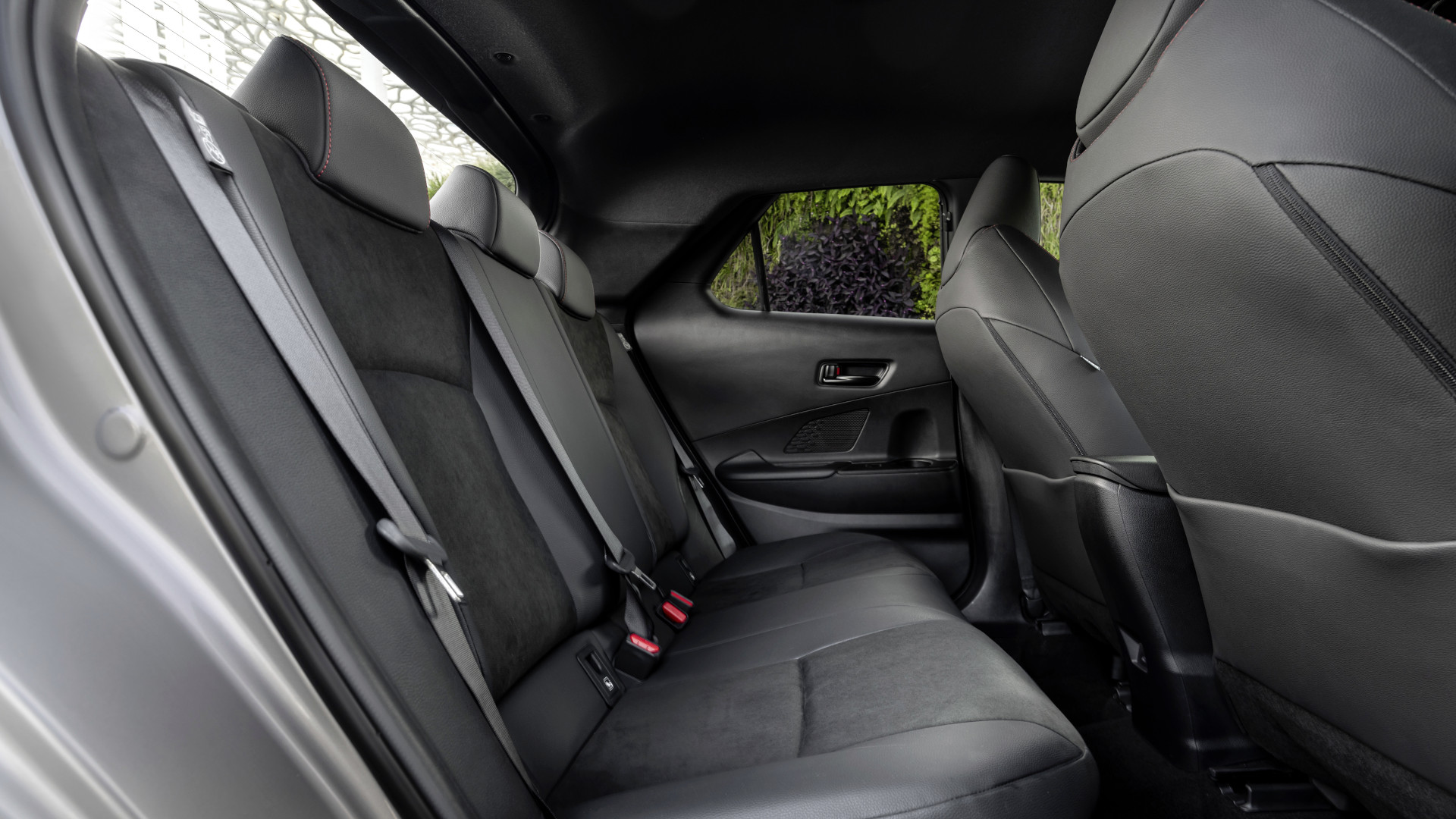 Der Ein- und Ausstieg ist im Fond wegen des schmalen Türausschnitts nicht immer bequem. Im Fondbereich geht es wegen der schmalen Glasflächen dunkel und höhlig zu. Das im C-HR Lounge serienmäßige Panoramadach, das wegen der infrarotreduzierenden Low-E-Beschichtung ohne Sonnenrollo auskommt, bringt Licht in den Fond, aber nicht sehr viel, da es die Sonneneinstrahlung durch Verdunkelung abhält. Dafür erhöht es die Kopffreiheit um drei Zentimeter. Bei dem Dachverlauf setzt der Dachhimmel die Grenzen, die bei etwa 1,80 Meter Körpermaß beginnen. Der Platz vor den Knien ist nicht üppig, geht aber in Ordnung.