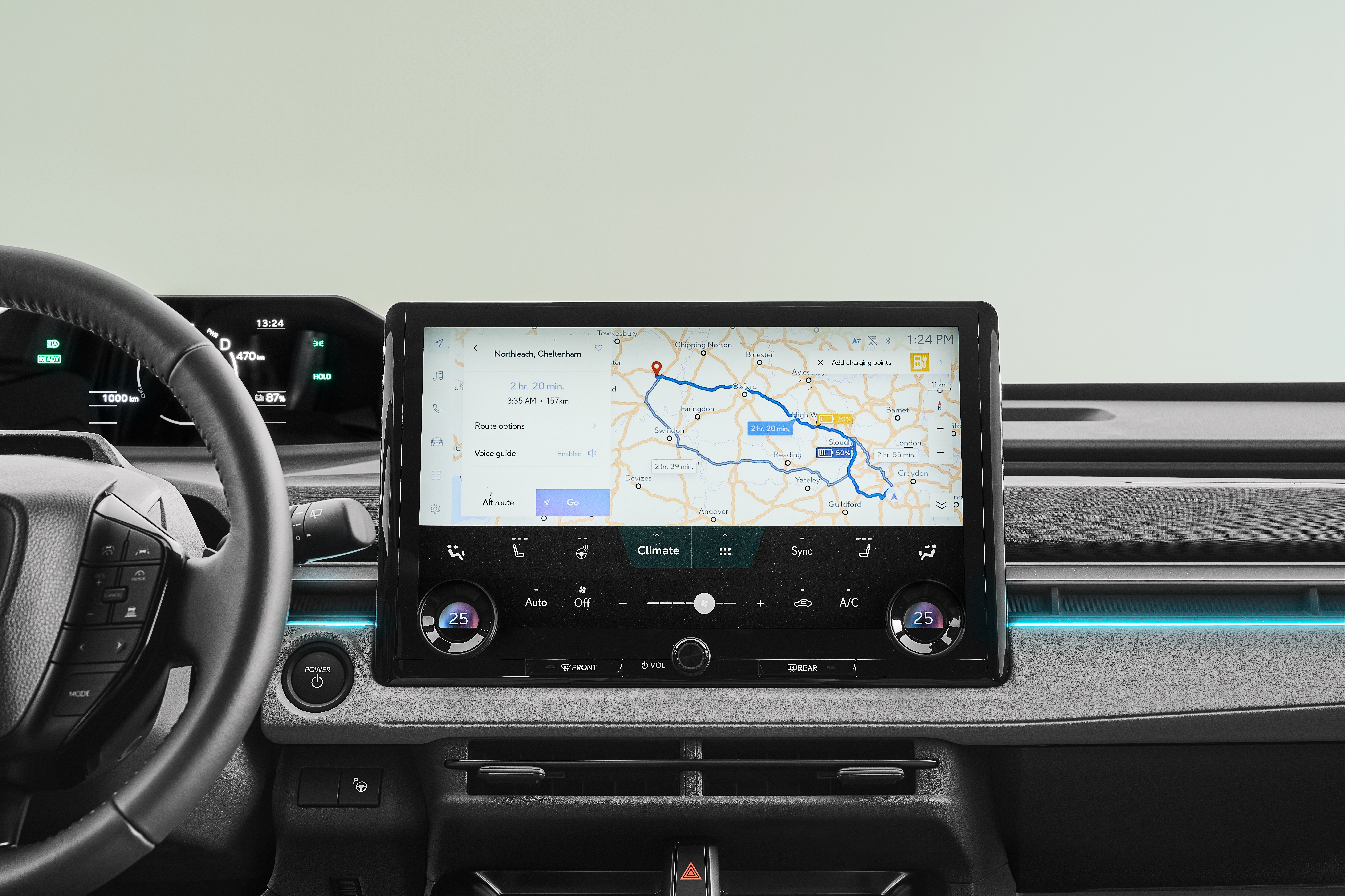 Das digitale Herzstück im Cockpit des Toyota C-HR+ ist ein zentraler Touchscreen mit einem 14 Zoll großen Bildschirm, der serienmäßig verbaut ist. Dieses Infotainment-System beinhaltet eine integrierte Navigationslösung mit automatischer Ladeplanung, die notwendige Ladestopps direkt an der Route anzeigt. Das funktionierte in unserem Test ohne jegliche Probleme. Hinter dem Lenkrad befand sich bei unserem Testwagen ein 7-Zoll-Display für die fahrrelevanten Instrumente.