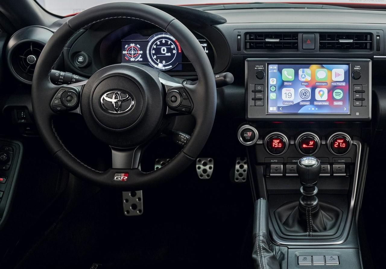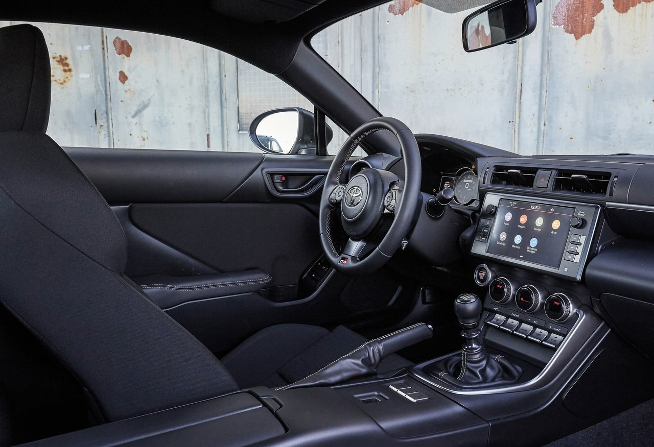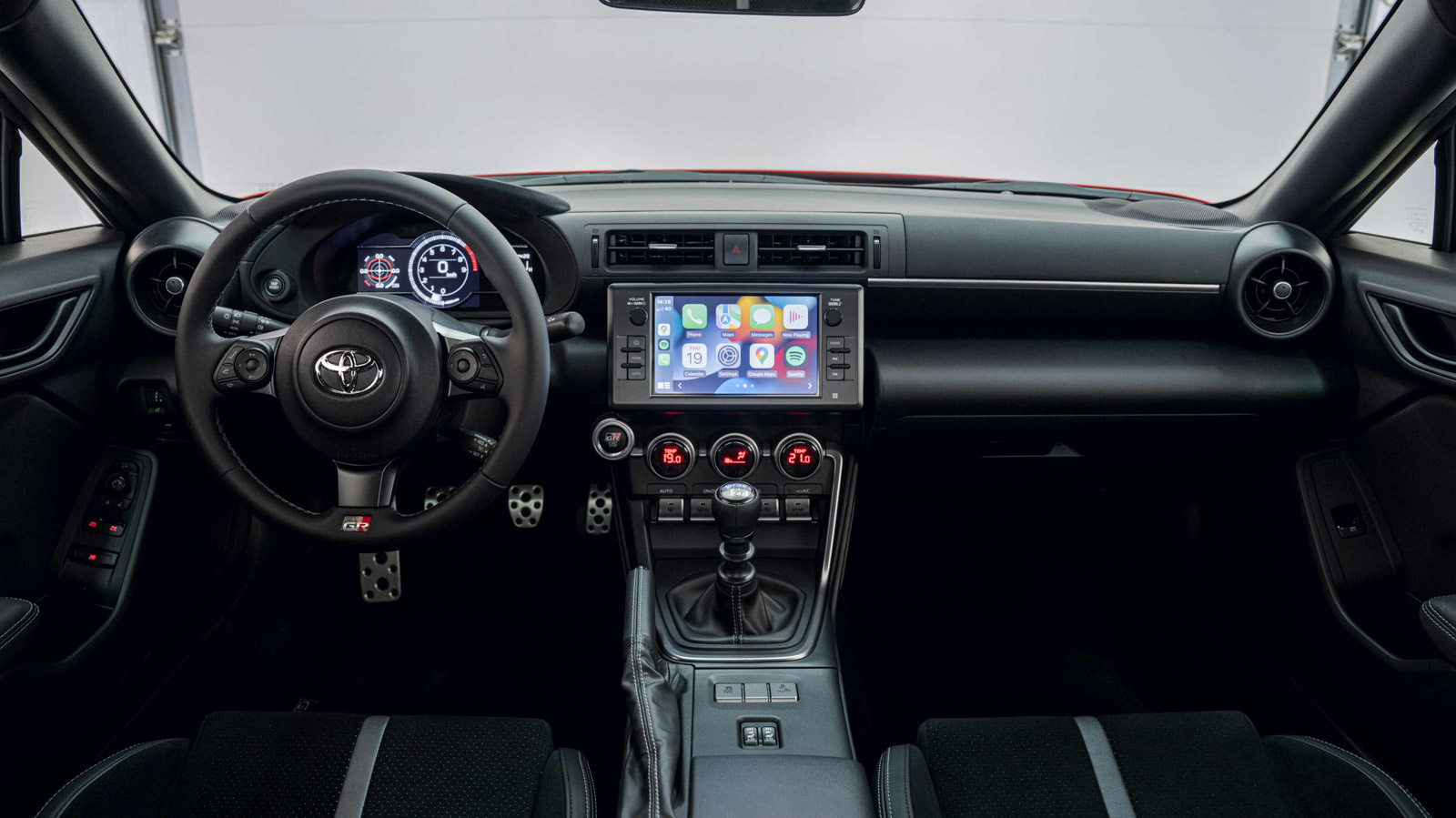 Sportlich wird es bereits im GR86 Pure mit 17-Zoll-Leichtmetallfelgen, einem 3-Speichen-Sportlederlenkrad, schwarzen Sportsitzen mit Stoffbezug, dem Toyota-Touch-Infotainmentsystem mit 8-Zoll-Display sowie Smartphoneintegration und einer Klimaautomatik.
