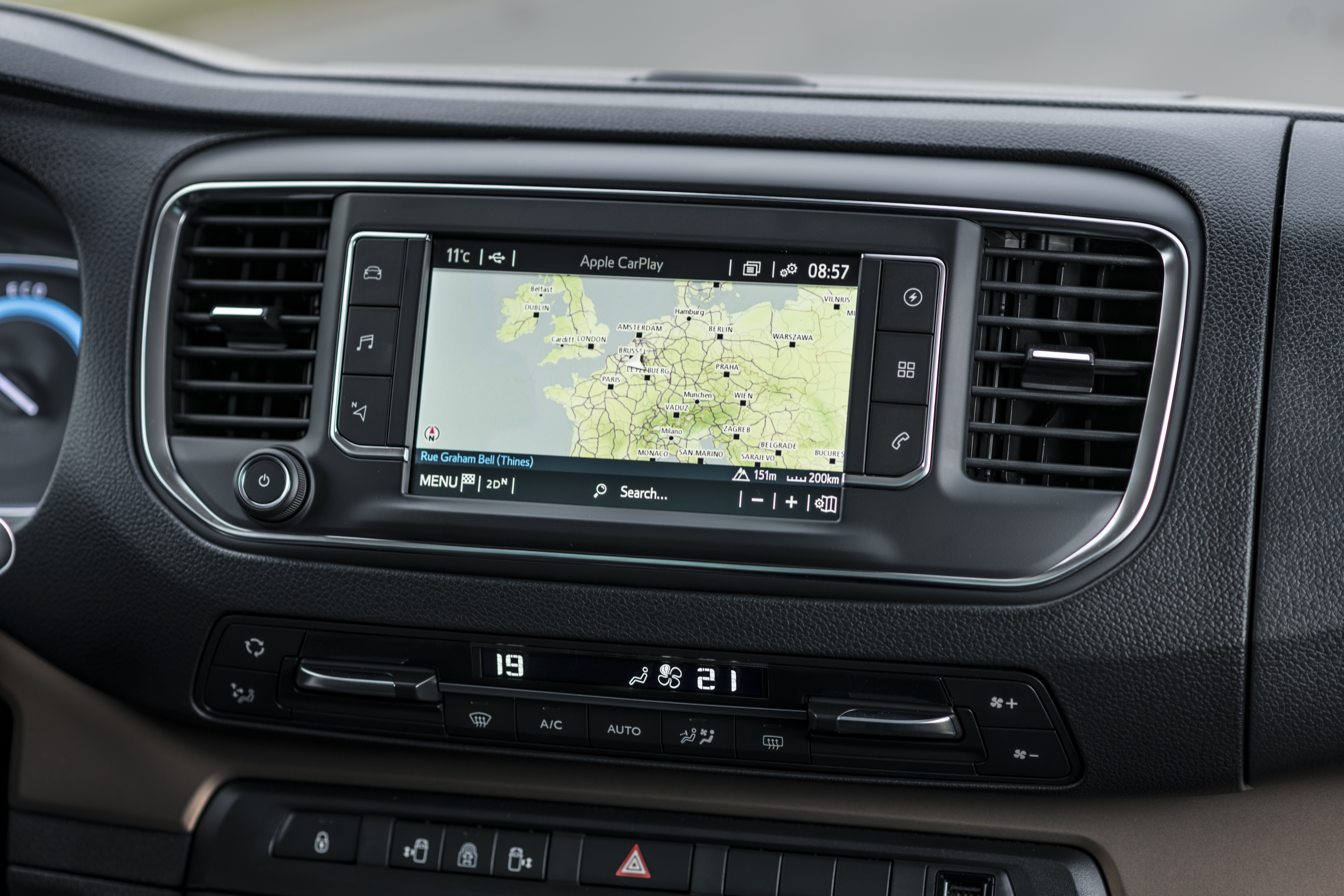 Das Infotainment-System im Proace Verso Electric bedient sich leicht. Es verfügt über einen Touchscreen-Bildschirm, der Zugriff auf Navigation, Musik, Telefon und andere Funktionen ermöglicht. Die serienmäßige Rückfahrkamera bietet sich an, um das große Auto leichter in Parklücken zu manövrieren.