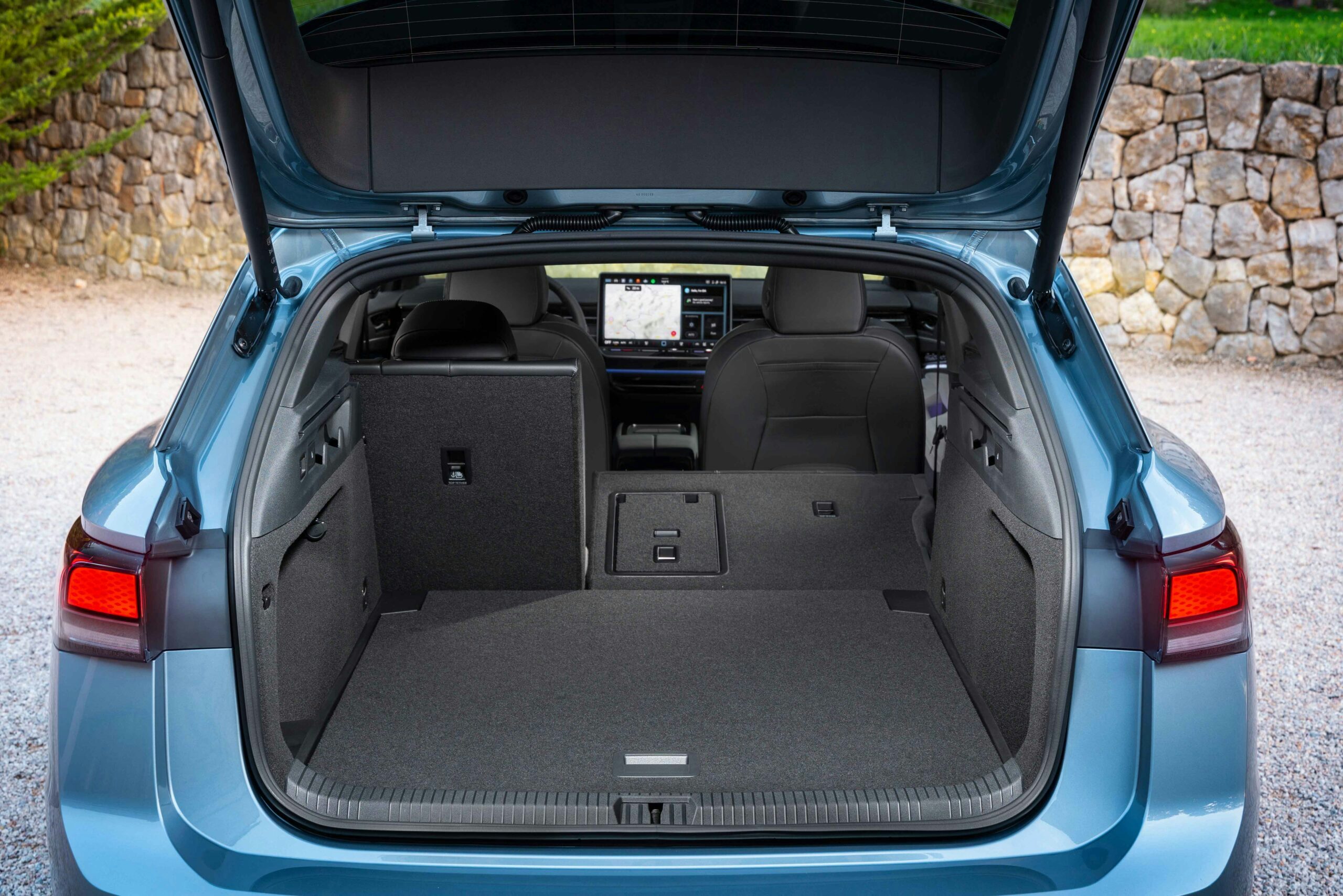 Das Platzangebot im ID.7 Tourer ist nicht nur in der ersten und zweiten Sitzreihe gut, sondern auch im Kofferraum. Die asymmetrisch teil- und klappbare Rückbank kann das Ladevolumen im Gepäckraum nochmal vergrößern. Sind die Rücksitze umgeklappt, passen in den ID.7 Tourer satte 1.714 Liter hinein. Wenn fünf Personen mitfahren, dann ist das maximale Ladevolumen 605 Liter. Diese Werte sind teils deutlich höher, als die der ID.7 Limousine.