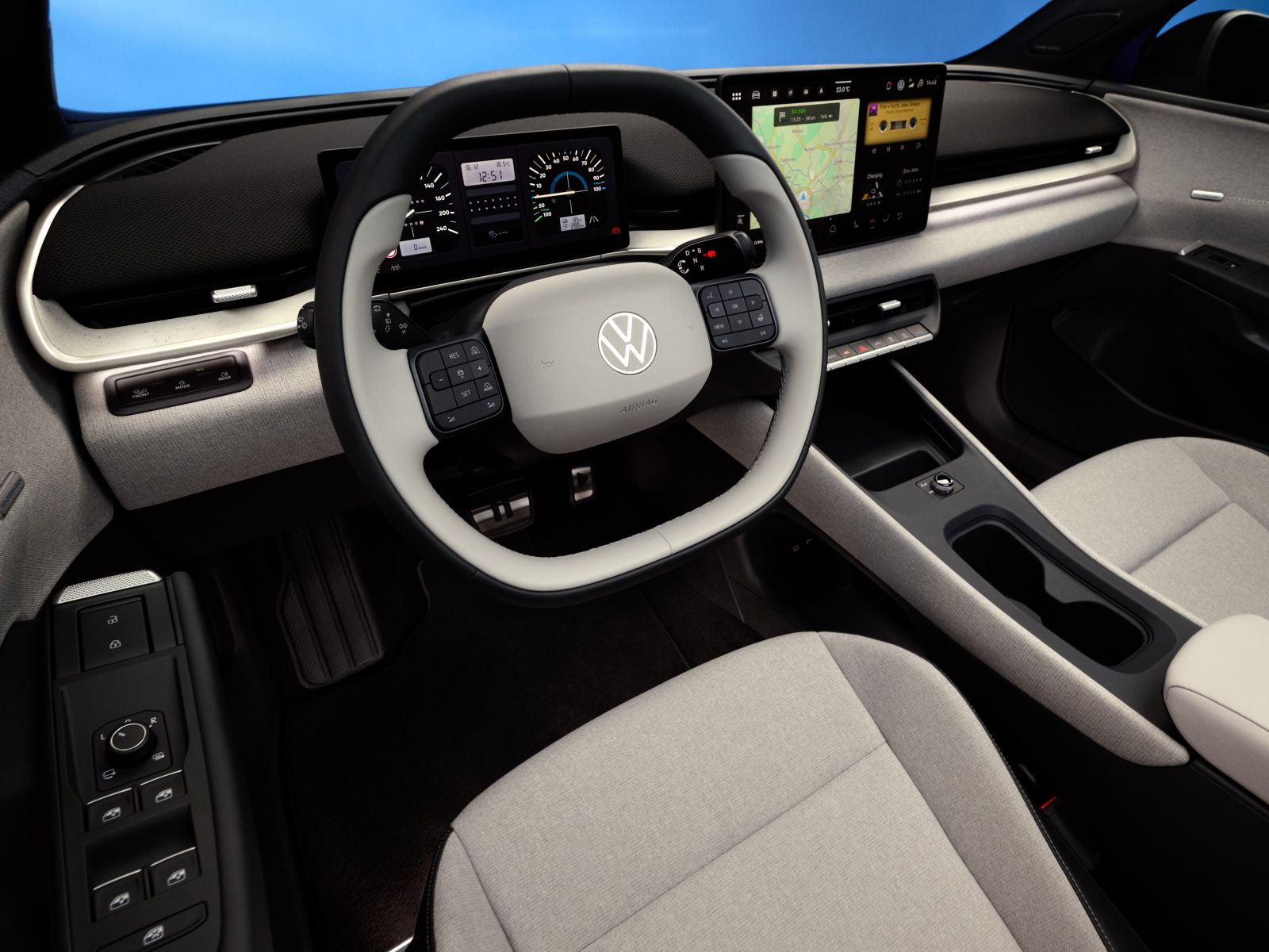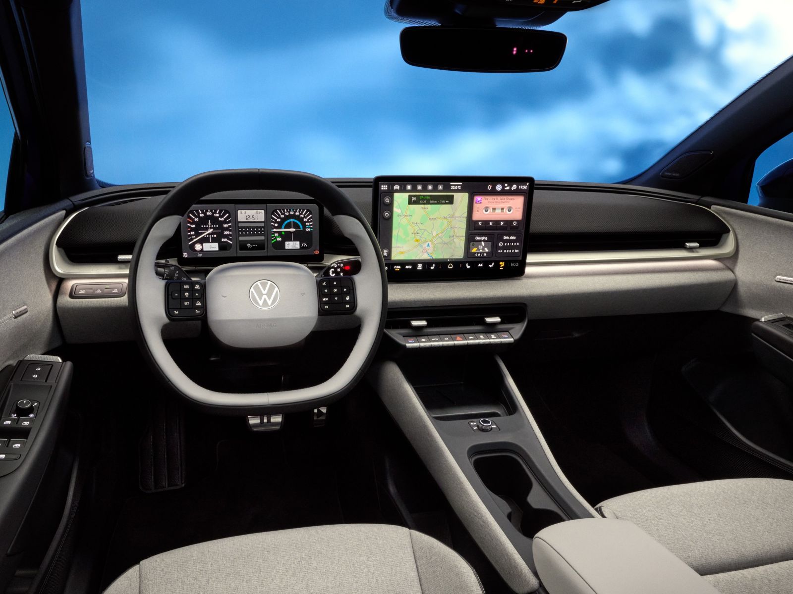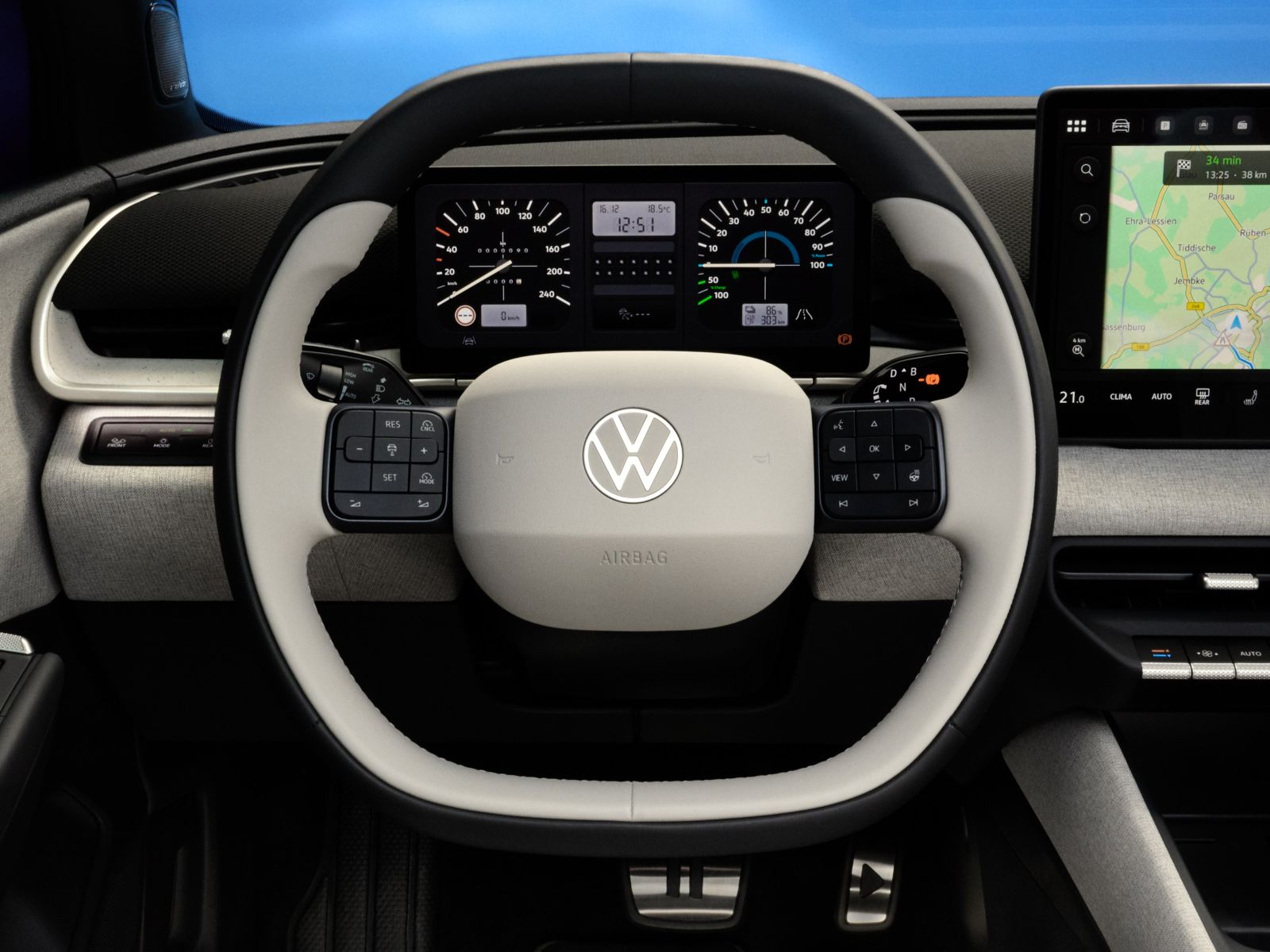 Auch auf dem zweifarbigen Lenkrad finden sich den ersten Bildern nach echte Knöpfe und nicht wie früher einmal berührungsempfindliche Tasten. Dahinter sticht das Retro-Design (ausstattungsabhängig) des Fahrerdisplays sofort ins Auge. Die digitale Anzeigen erinnern an den Golf I. Wem das zu viel an Nostalgie ist, der kann auch zu einer moderneren Darstellung wechseln.