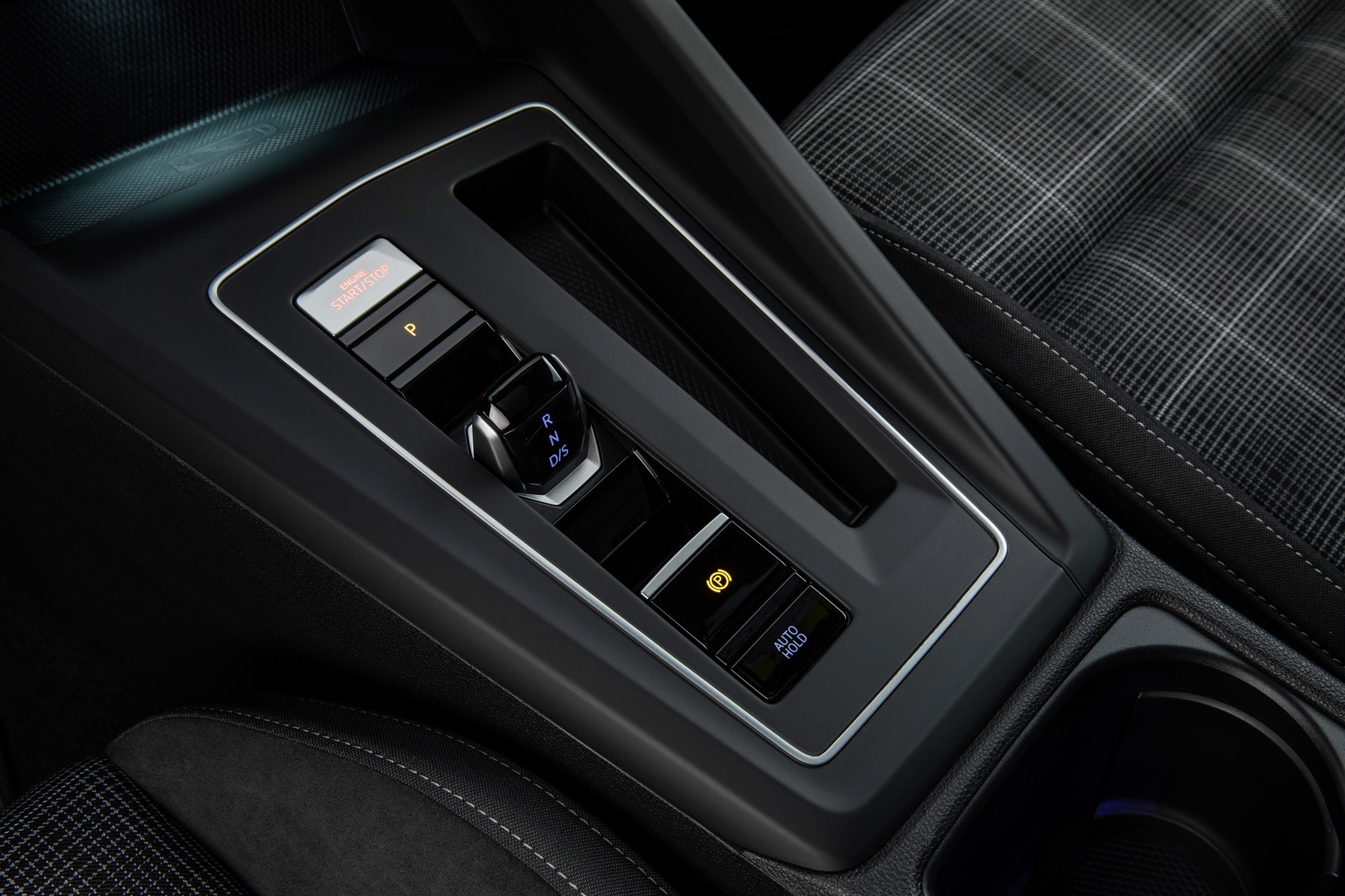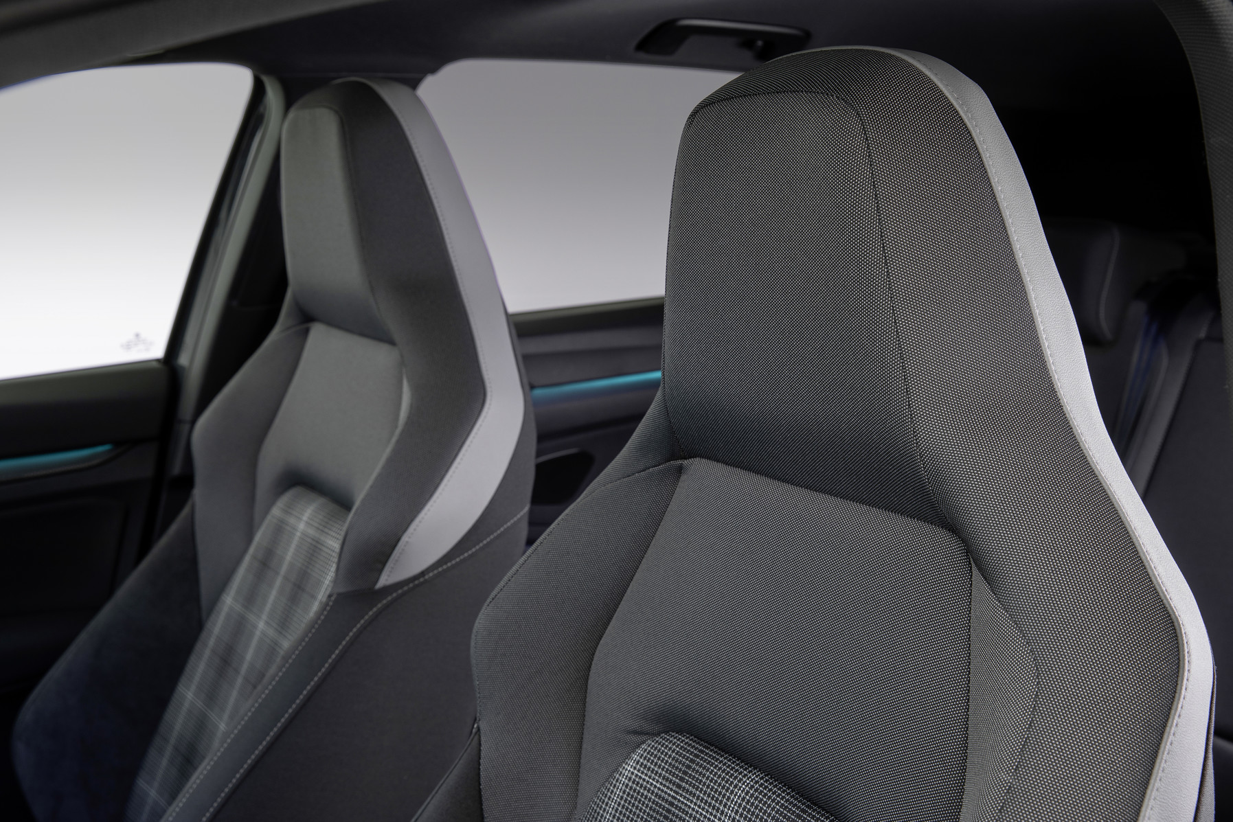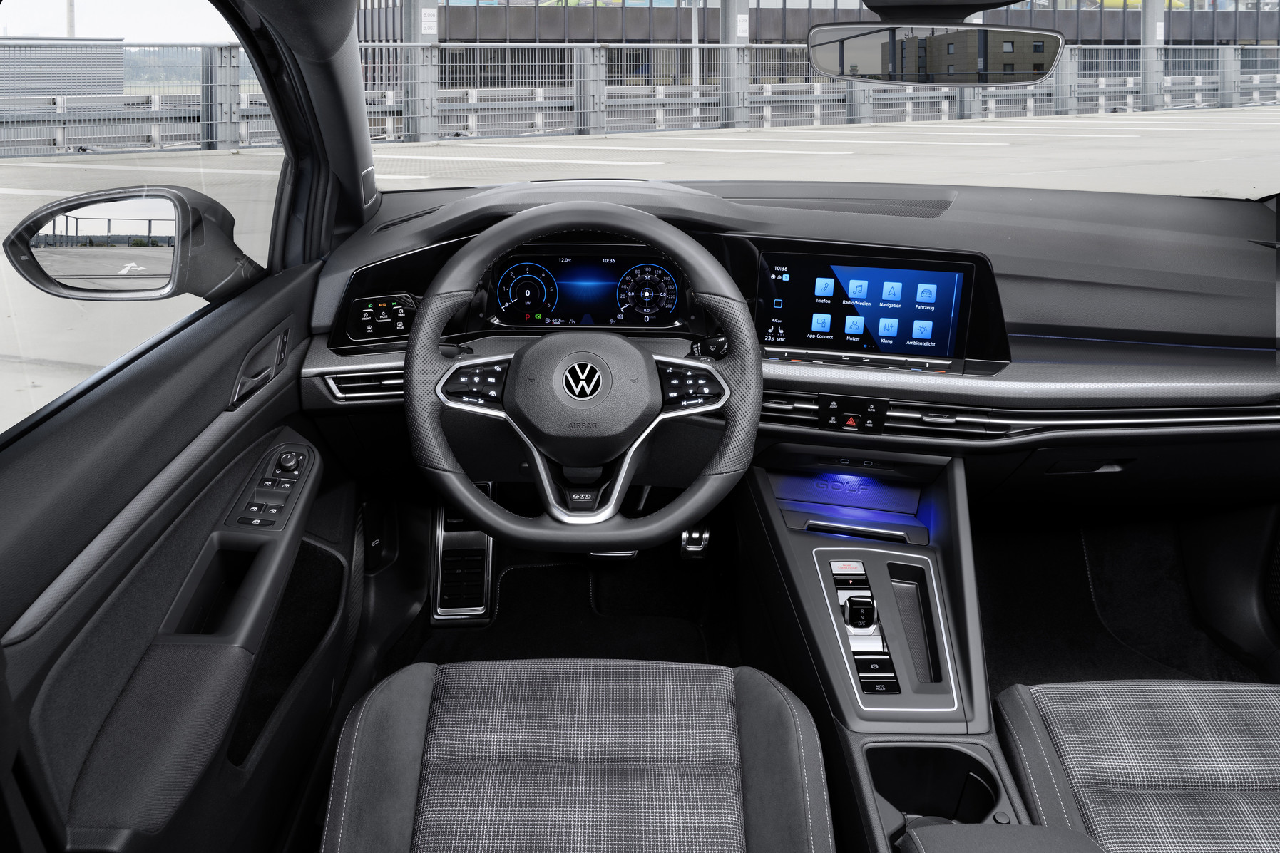 Im Innenraum setzt sich die Traditionalität und die Farbsprache des GTD mit silbernen Nähten im schwarzgrauen Karomuster der Sportsitze, der bis zum Startzeitpunkt des Motors rot pulsierenden „Engine“-Start-Stopp-Taste und den in GTD-Farben schimmernden Speichen des Lederlenkrads fort.