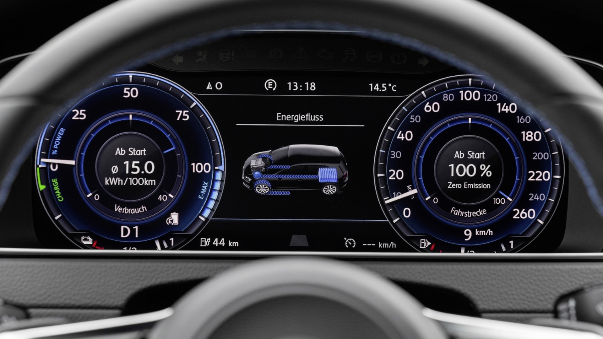 Auch das zentrale Energiespar-Instrument unterstützt. Es zeigt an, wenn der Fahrer sparsam unterwegs ist, wenn rekuperiert oder gerade viel Strom aus der Batterie gezogen wird. Eine elektrische Reichweite von 50 Kilometern schlummert im Akku – sagt VW. In der Praxis reicht eine 8,7 kWh-Ladung 20 bis 50 Kilometer weit, abhängig von der Fahrweise, Topographie, Außentemperatur und den eingeschalteten Verbrauchern (Licht, Radio, Sitzheizung usw.).