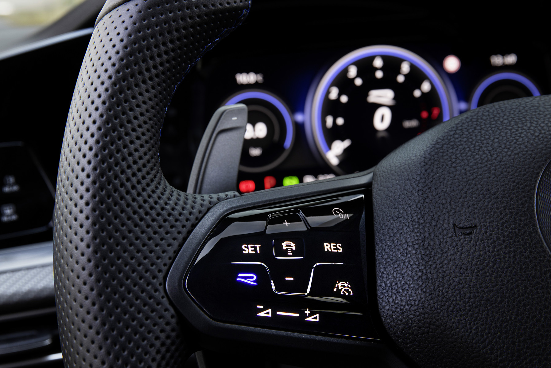 Auch im Innenraum sind die Unterschiede zum GTI gering. Die Sportsitze sind wohl konturiert, allerdings wären verstellbare Seitenwangen und eine ausziehbare Oberschenkelauflage wünschenswert. Das markante Karo der GTI-Reihe gibt es hier nicht, dafür perfekt verarbeitetes Leder. Das gilt für den gesamten Innenraum. Der ist auf dem gewohnt hohen Niveau von Volkswagen. Zwar wurde hauptsächlich Kunststoff verbaut, doch der ist hochwertig und gibt keinerlei Anlass zur Beschwerde. Hinzu kommen die üblichen Accessoires besonders sportlicher Modelle: Instrumententafel und Türverkleidungen tragen Dekoreinlagen aus Carbon, die Pedale sind aus gebürstetem Edelstahl. Das Lederlenkrad ist griffig und unten abgeflacht, um eine sportliche Fahrweise zu unterstützen.