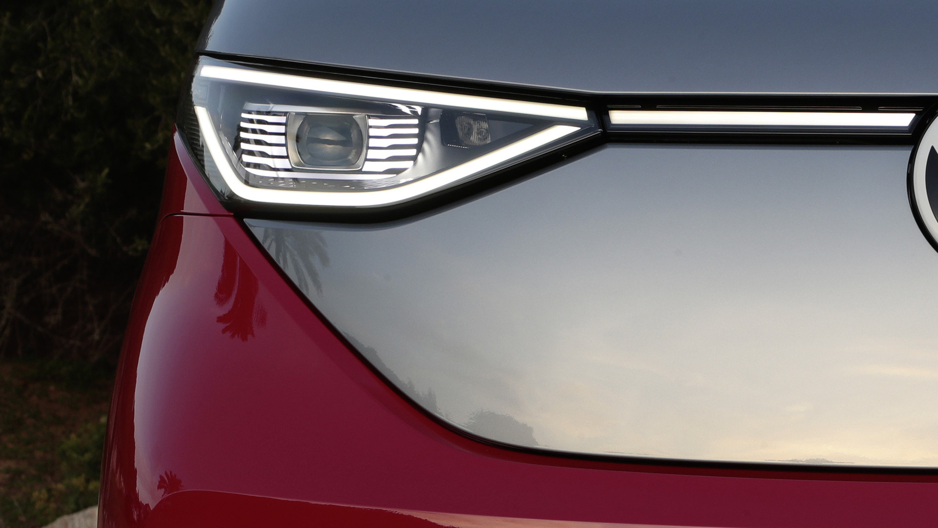 Schon von vorn an der individualisierten Frontpartie mit schwarzen Lüftungsgittern im Wabendesign zu erkennen, kommt der GTX mit serienmäßigen LED-Matrixscheinwerfern betont dynamisch daher. Den ID. Buzz GTX gibt es einfarbig in Weiß, Rot, Silber, Dunkelblau oder Schwarz oder auch alternativ in der Bulli-typischen Zweifarblackierung, hier jedoch bisher nur in der Farbkombination Kirschrot-Silber.