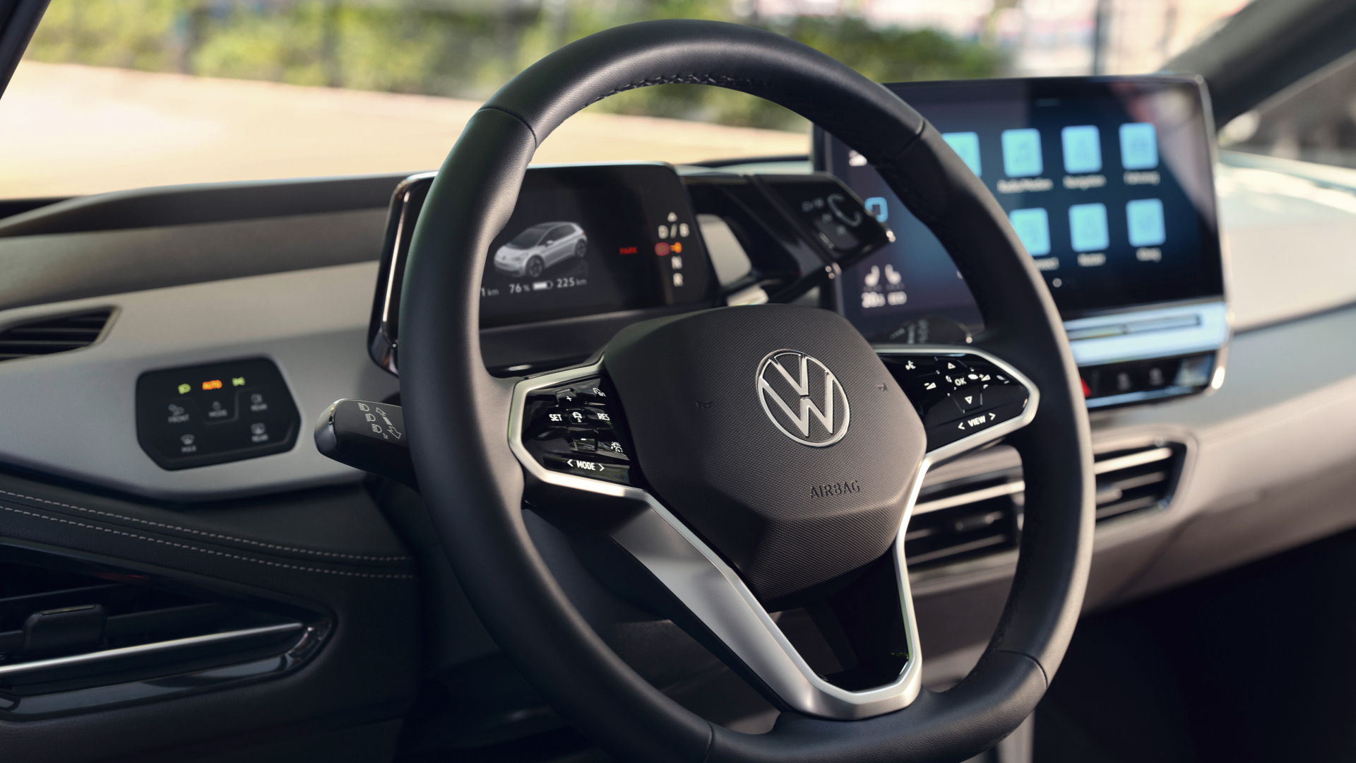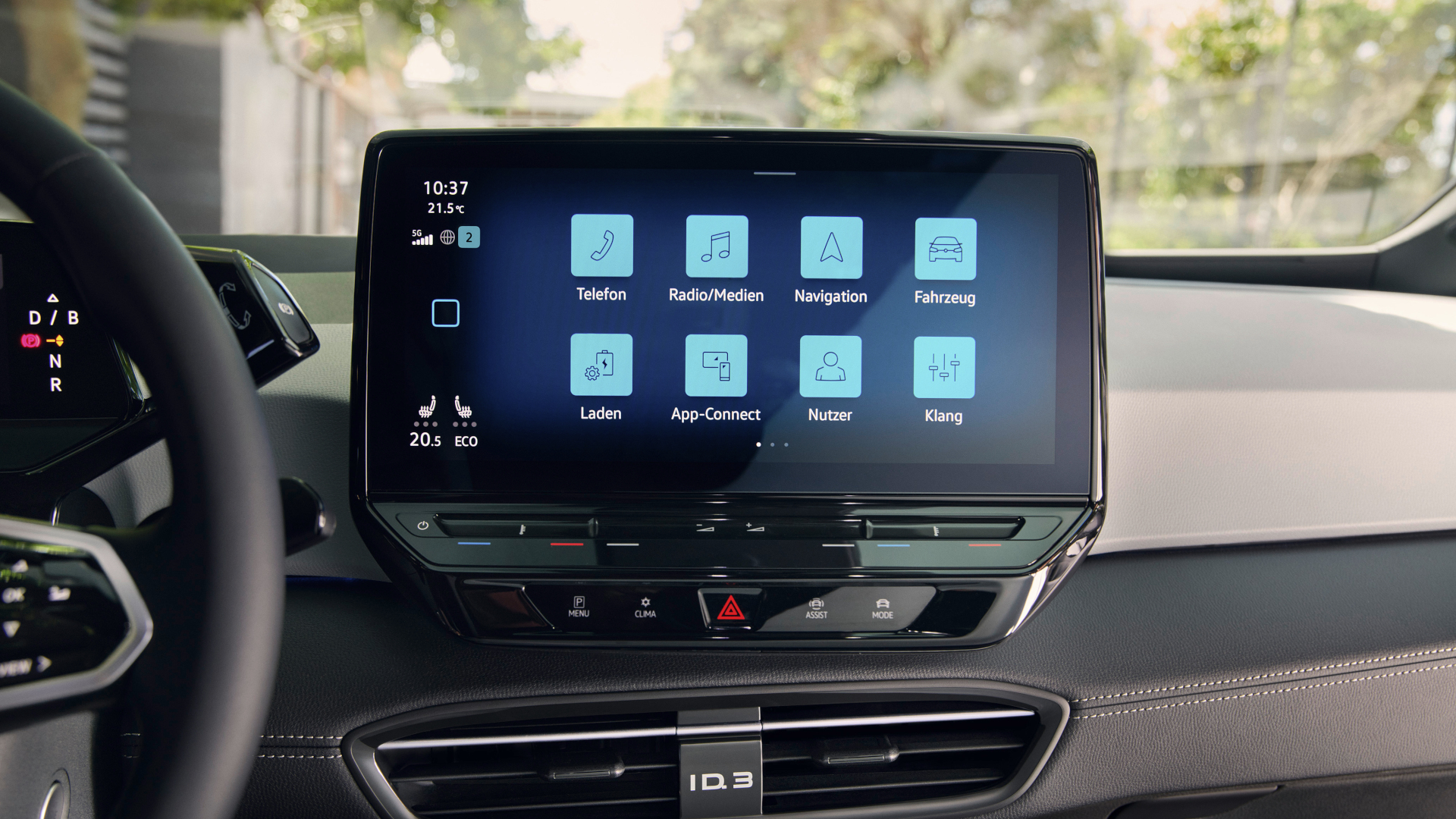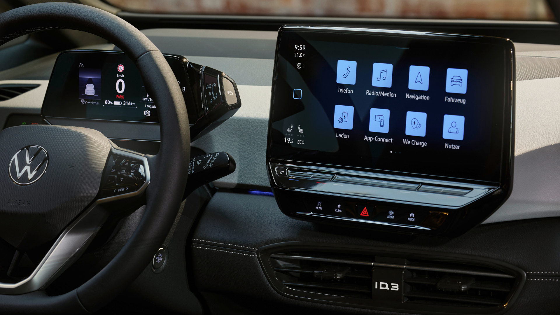 Mit dem Facelift und der neuesten Software-Generation ist der ID.3 außerdem in der Lage, Updates over-the-air zu empfangen. Per Multifunktionslenkrad steuern Sie das 5,3 Zoll große Instrumentendisplay. In der Konsolenmitte befindet sich das nun serienmäßige 12 Zoll große Touch-Display für Navigation, Telefonie, Medien, Assistenzsysteme und Fahrzeug-Setup. Mit der Überarbeitung wurde auch die anfangs verschachtelte Menüstruktur verbessert.