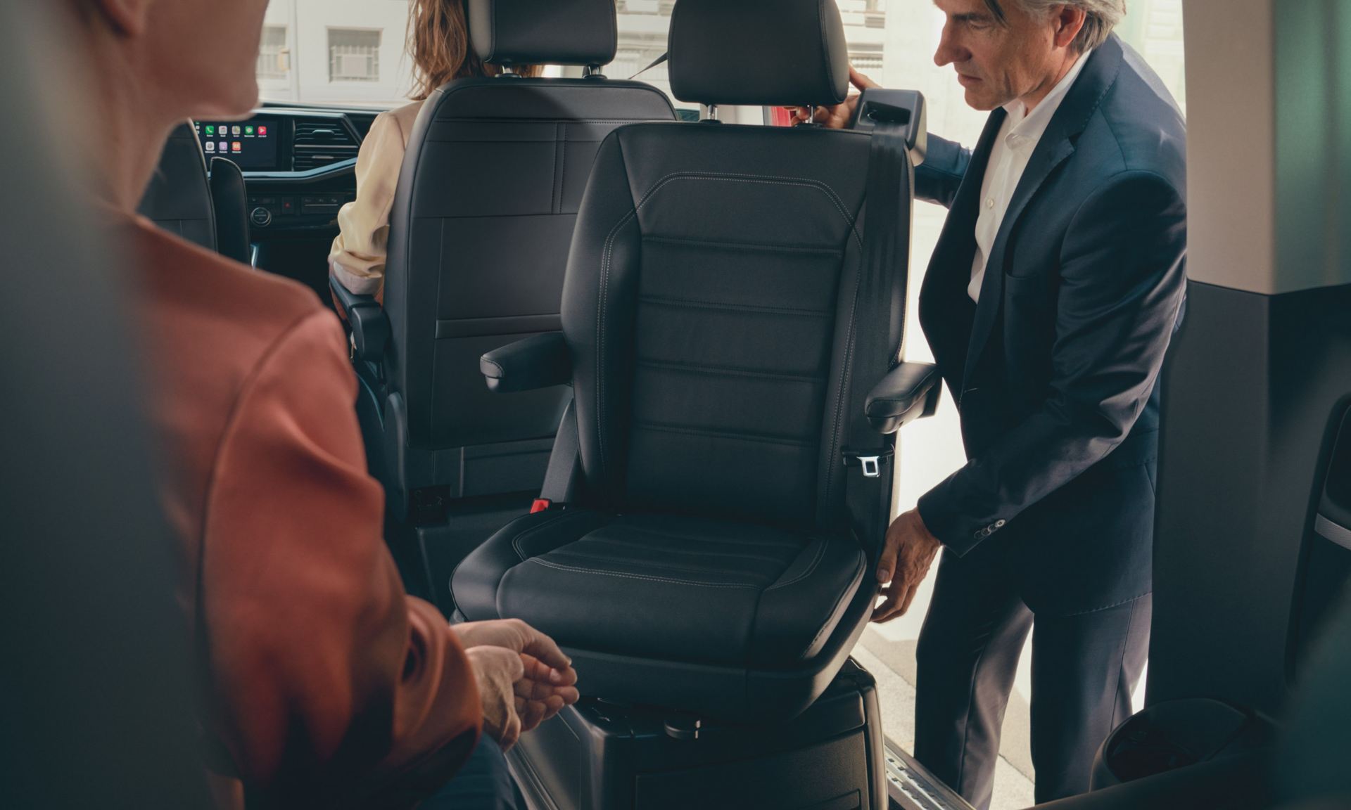 Genauso wie der Caddy ist auch der Multivan wahlweise mit sieben Sitzen erhältlich. Doch diese Extraplätze sind nicht das Praktischste am Wagen! Alle Sitze lassen sich ausbauen, einzelne Plätze sind drehbar und können verschoben oder umgeklappt werden. So lässt sich der Passagier:innenraum zu einem „Wohnzimmer“ umbauen, in dem die erste Rückbank in Richtung der zweiten blickt.