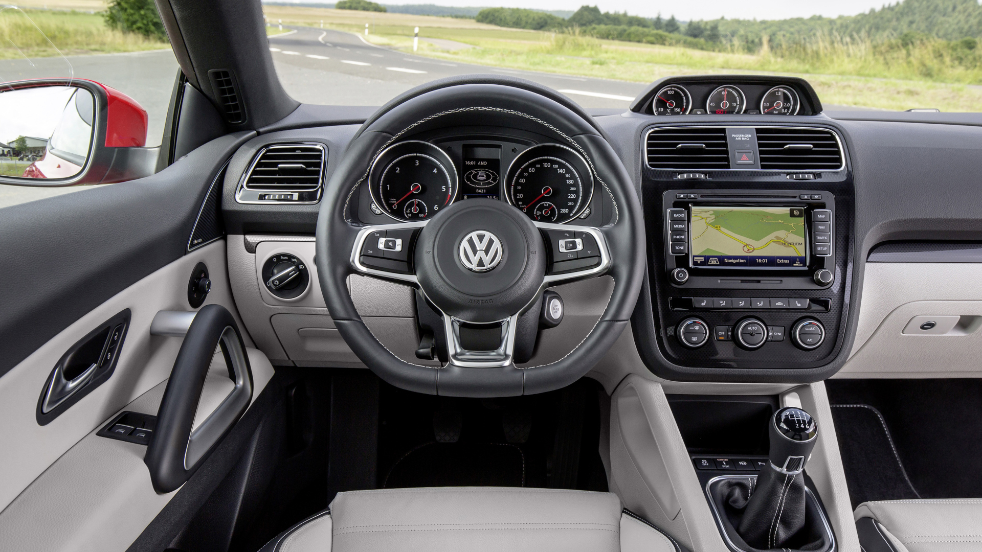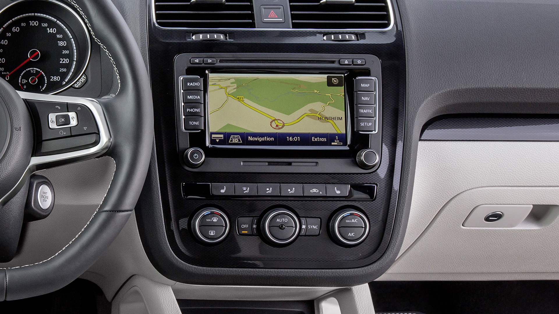 Das Infotainment wurde 2014 nicht verbessert. Das über den Touchscreen bedienbare moderne System des Golf sucht man im Scirocco vergebens. Aufgrund dessen fortgeschrittenen Alters ist auch die Bedienung des Navigationssystems ein wenig von gestern.