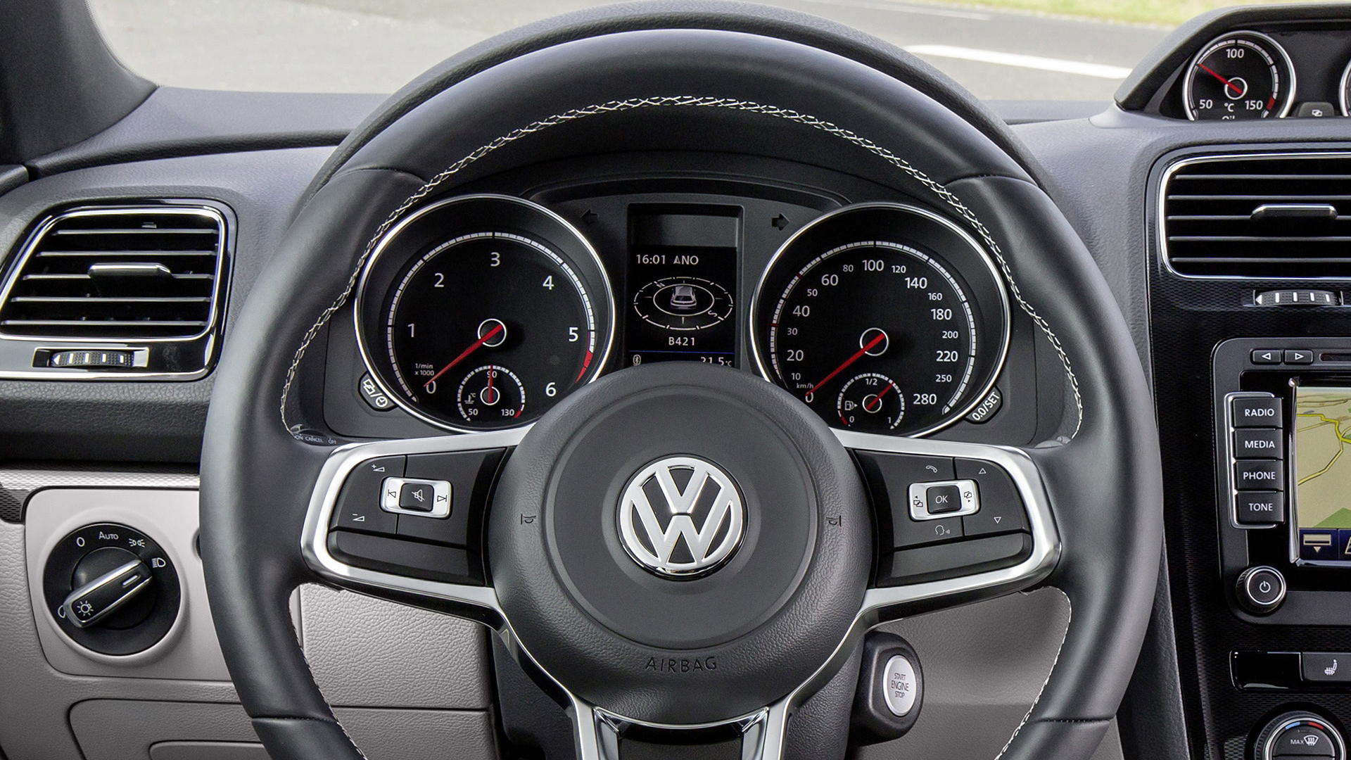Auch die Instrumente und die Bedienung lenken ihn nicht davon ab. Die in Tuben sitzenden Zeigerinstrumente, das Farbdisplay für den Bordcomputer sowie die Schalter und Tasten entstammen VWs großem Teilebaukasten und sind damit zumeist vom VW Golf bekannt.