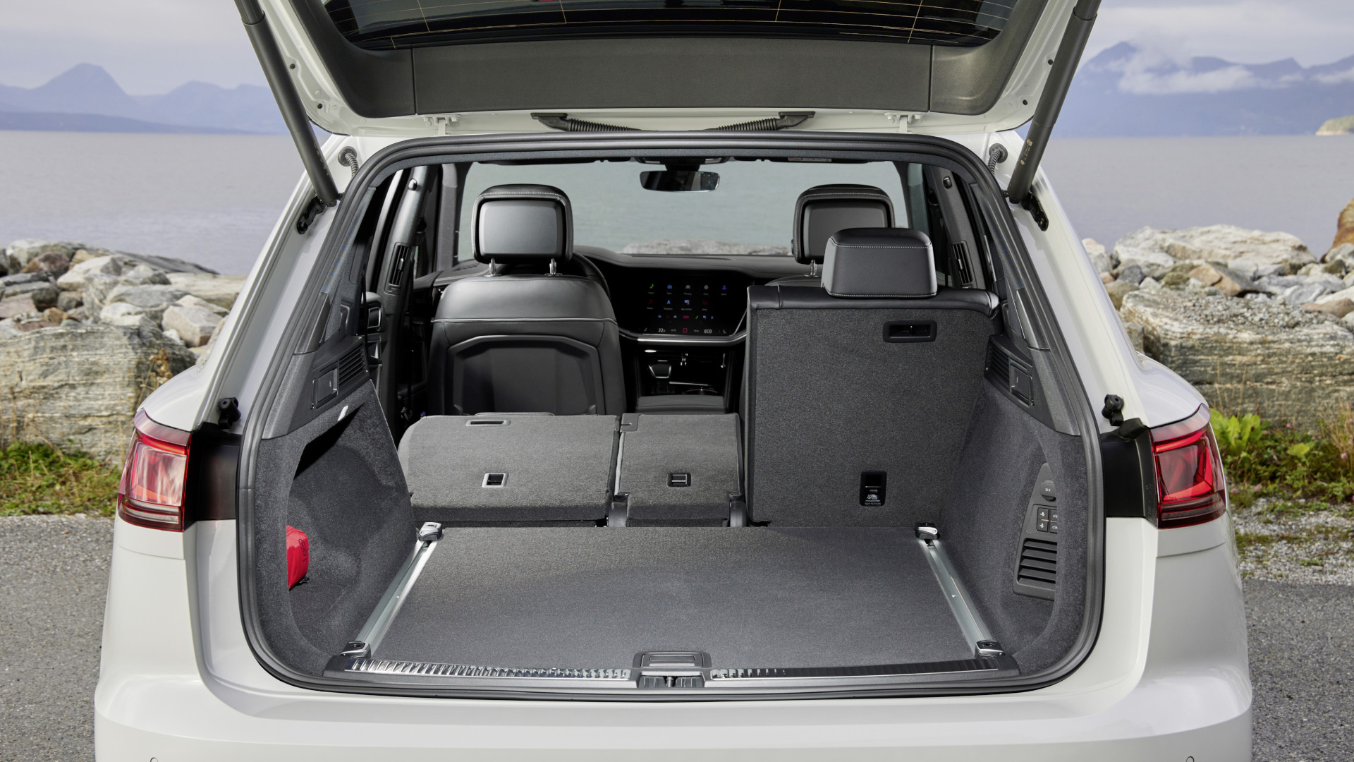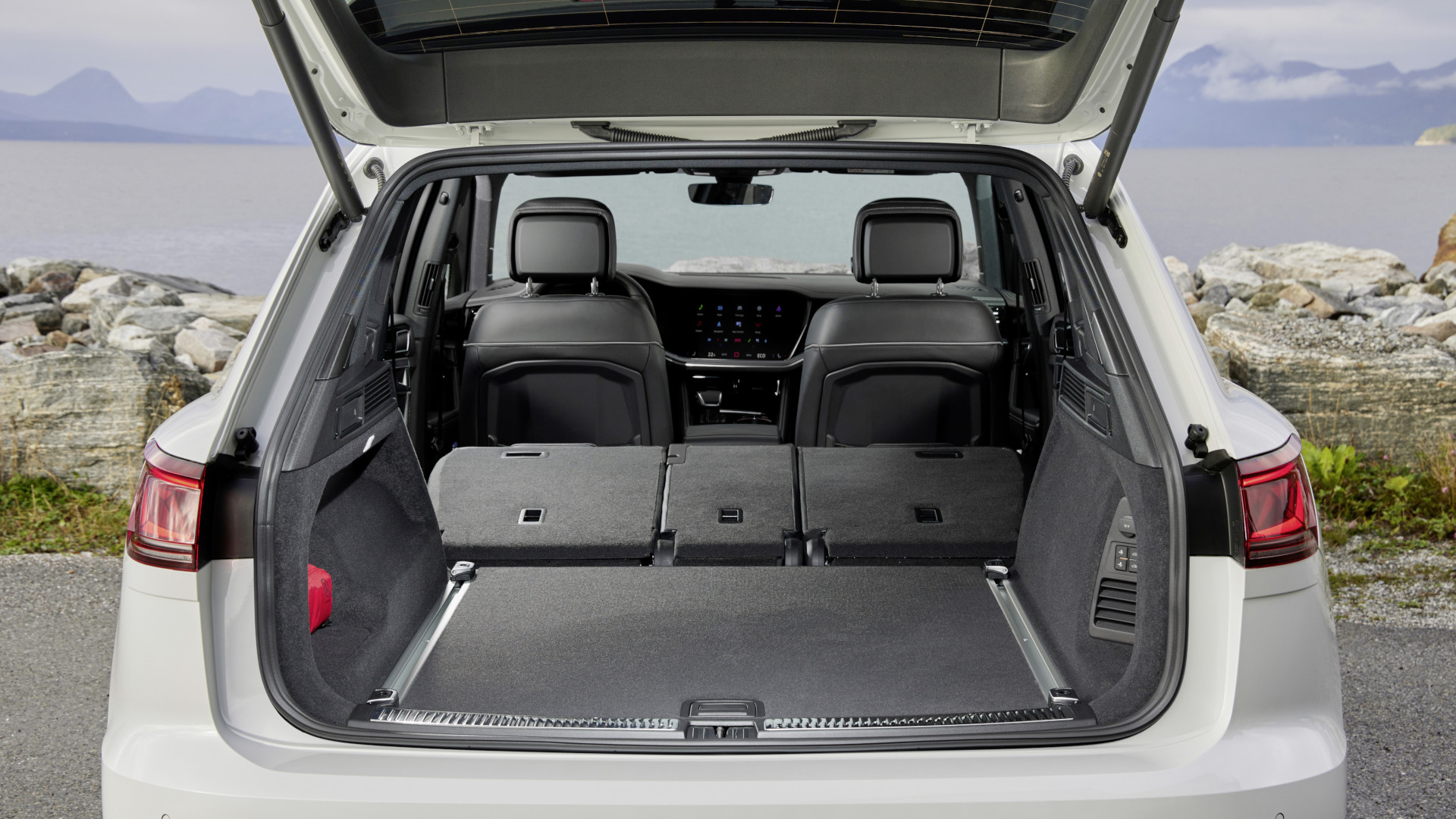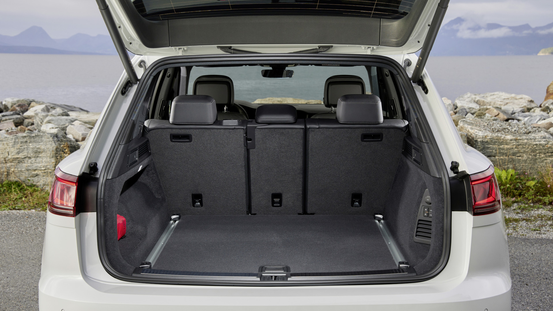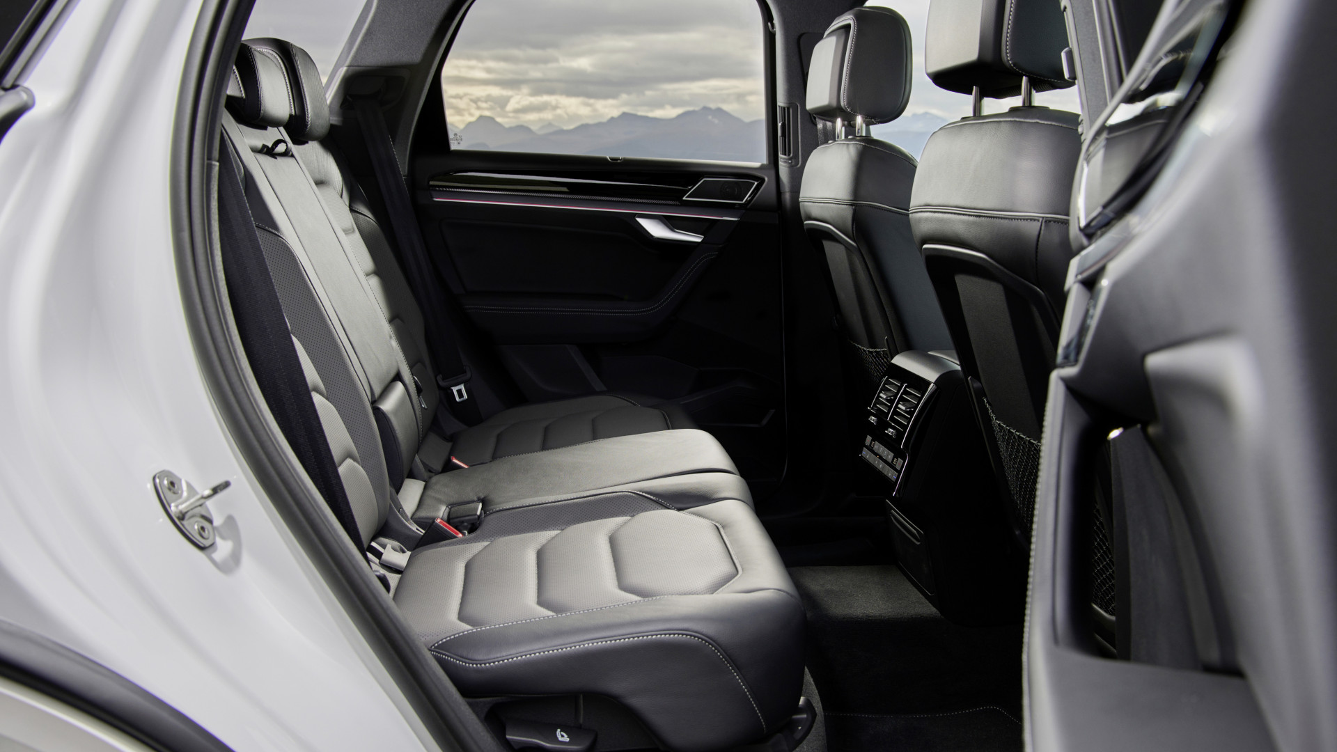 Im Innenraum lockt Volkswagen mit feinster Verarbeitung und üppigem Platzangebot. Vorne sowieso, hinten ist nicht sehr viel weniger Platz. Einziges Manko: Der Kofferraum ist mit 665 bis 1.675 Liter kleiner als in anderen Touareg-Modellen. Highlight im Innenraum ist die 38 Zentimeter Diagonale der beiden Displays, über die sich das SUV steuern lässt. Das bietet zwar zu viele Funktionen und Untermenüs, doch nach einer gewissen Eingewöhnungszeit ist es präzise steuerbar.