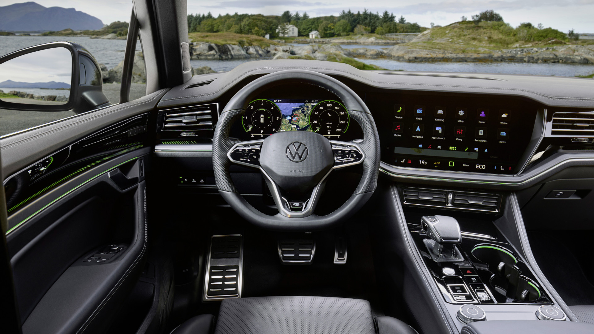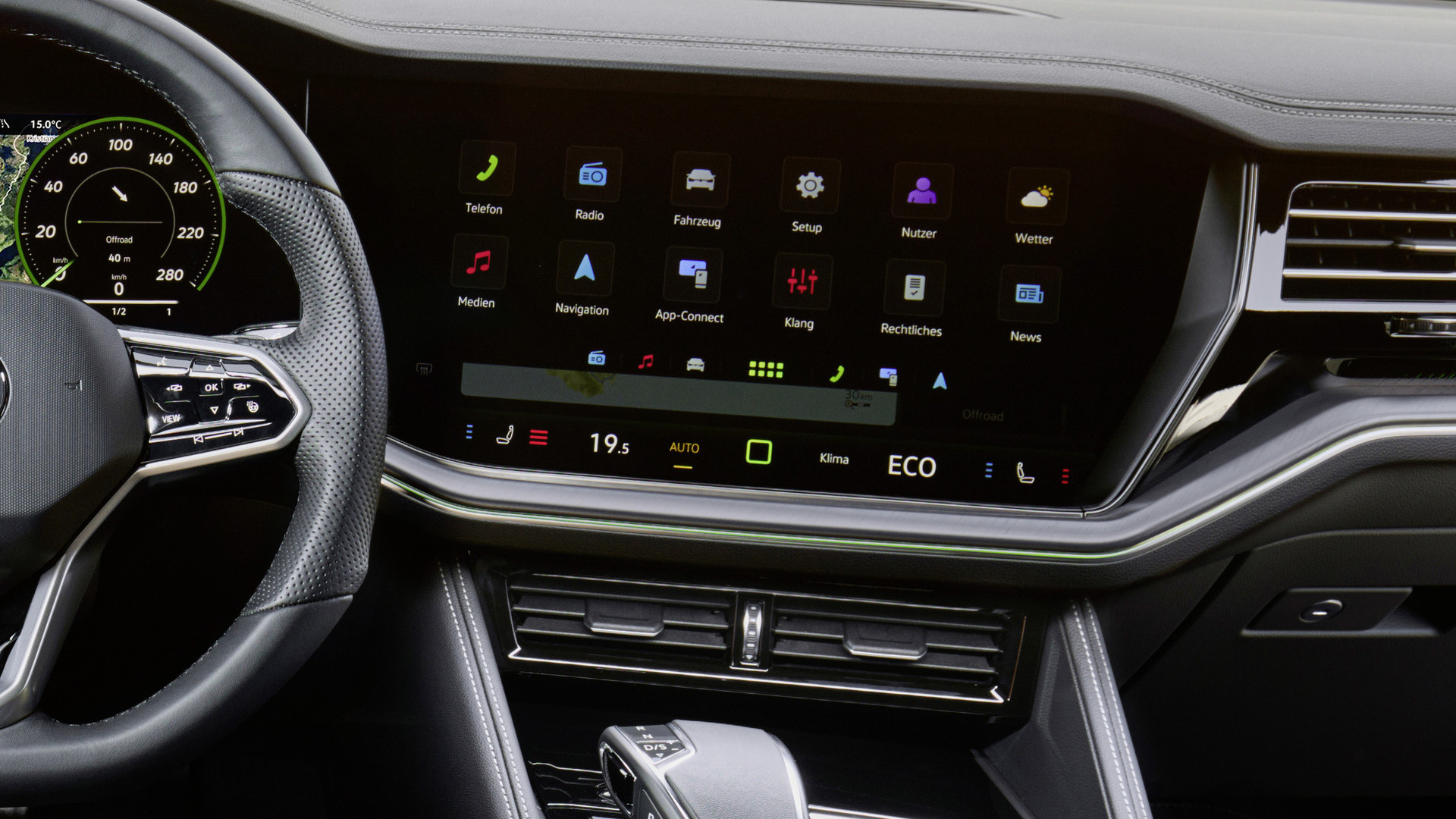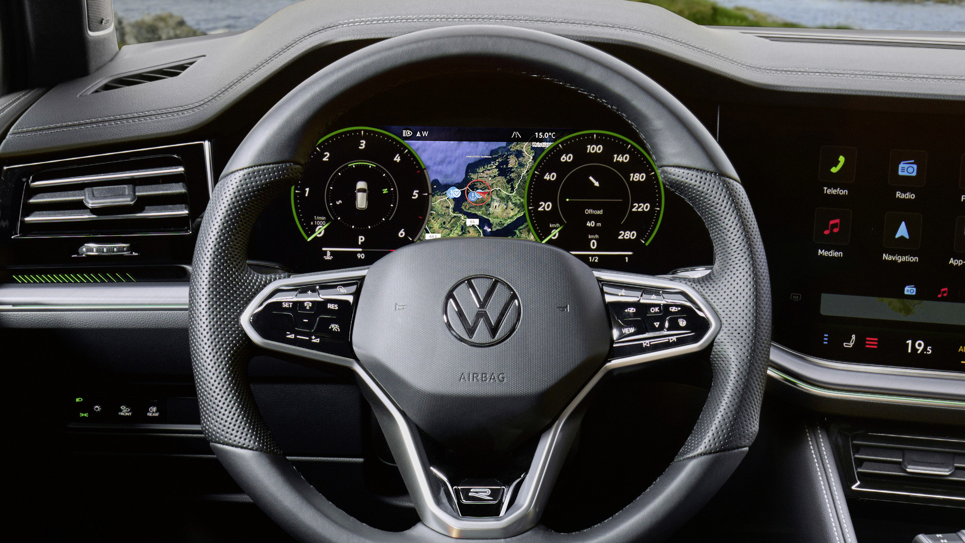 Das Cockpit wirkt sehr aufgeräumt und wird von einer großen Bildschirmlandschaft dominiert. Volkswagen bewirbt sie in der Broschüre zum Touareg R mit einer Diagonale von 38,1 Zentimeter, bei genauerem Hinsehen ist aber zu erkennen, dass es sich bei der Technologie um zwei einzelne, direkt nebeneinander angeordnete Displays handelt. Doch auch diese beiden Bildschirme sind riesig. Fahrer:innen blicken auf ein 12,3 Zoll großes Display, das die wichtigsten Informationen anzeigt und sich vielseitig auf die eigenen Bedürfnisse hin anpassen lässt. Egal ob Navigation, Fahrdaten oder die Offroad-Eigenschaften, hier ist alles möglich. Das Infotainment ist 15 Zoll groß, zeigt seine Inhalte gestochen scharf an und neigt sich zur Fahrer:innenseite. Durch die Fülle an Untermenüs, Funktionen und Individualisierungsmöglichkeiten dauert es aber eine Weile, bis man sich hier sicher zurechtfindet.