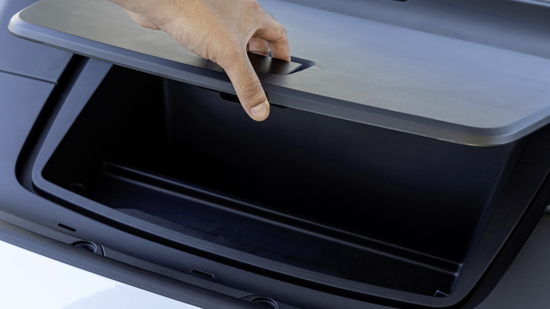 Die elektrischen Fensterheber rücken ebenso in die Mitte, wo sie von Fahrer:in und Beifahrer:in gleichermaßen leicht erreichbar sind. Im Fond lässt sich unter der Mittelkonsole eine praktische Ablagebox herausziehen, die auch als Abfallbehälter nutzbar ist.