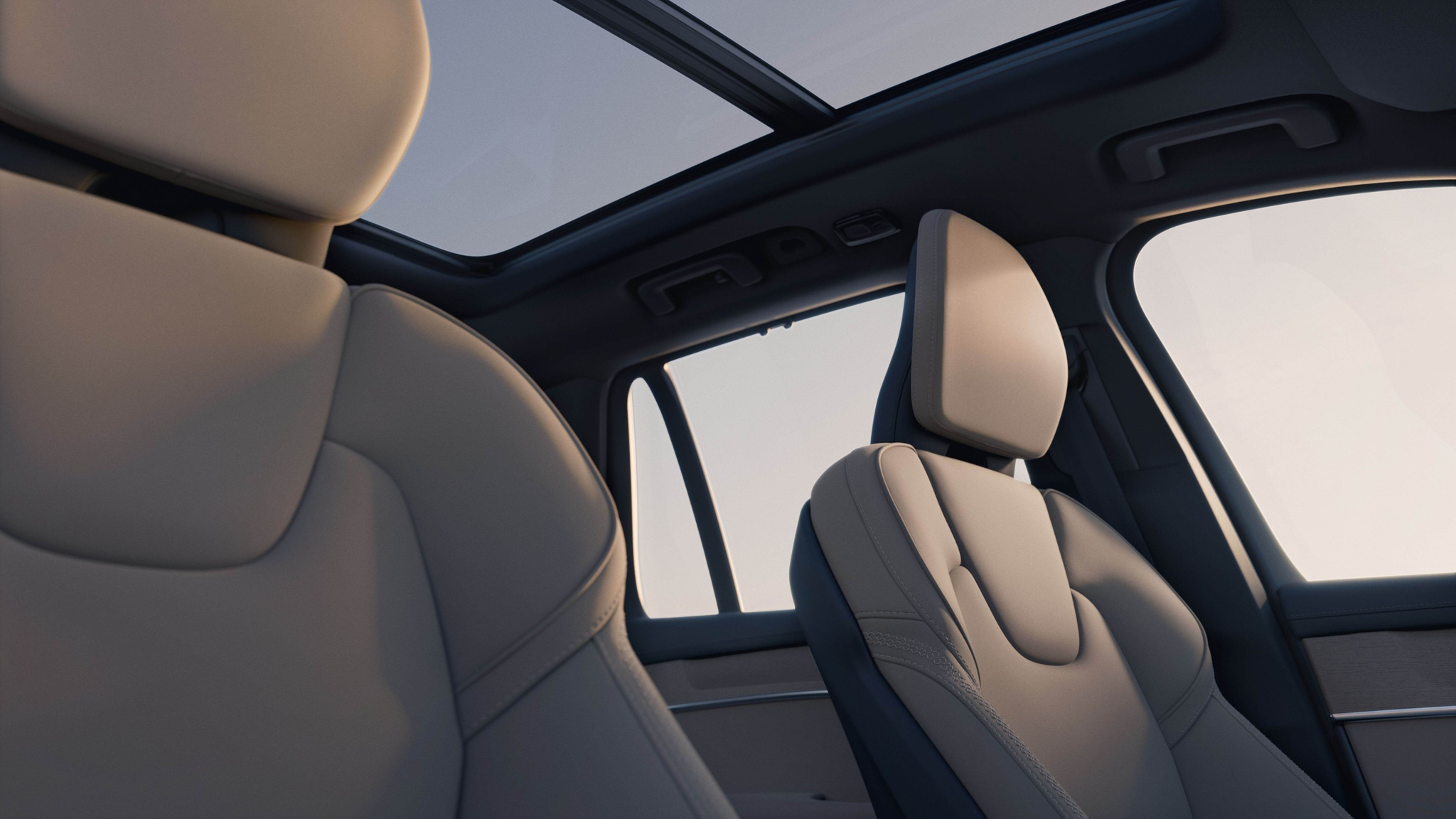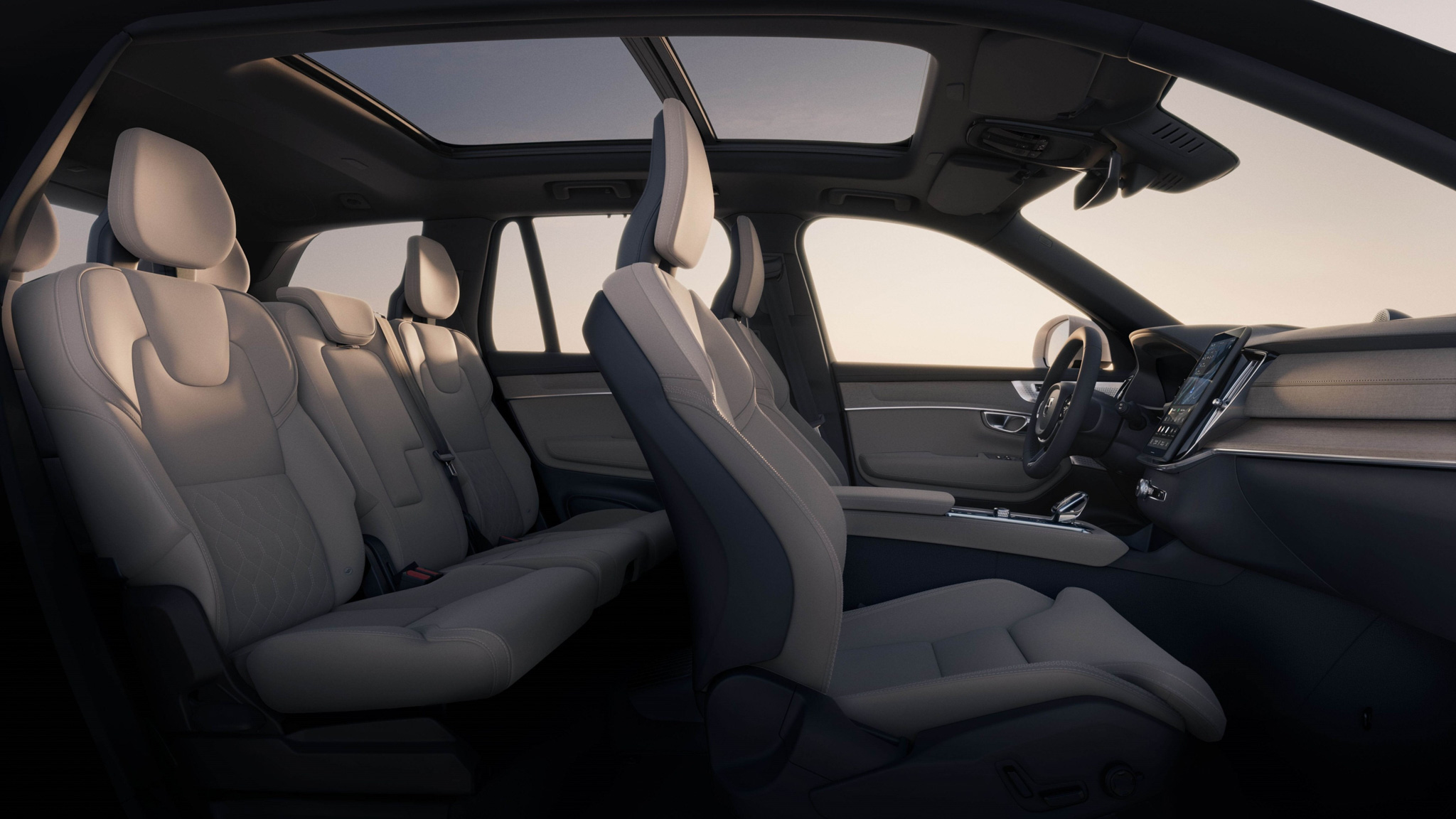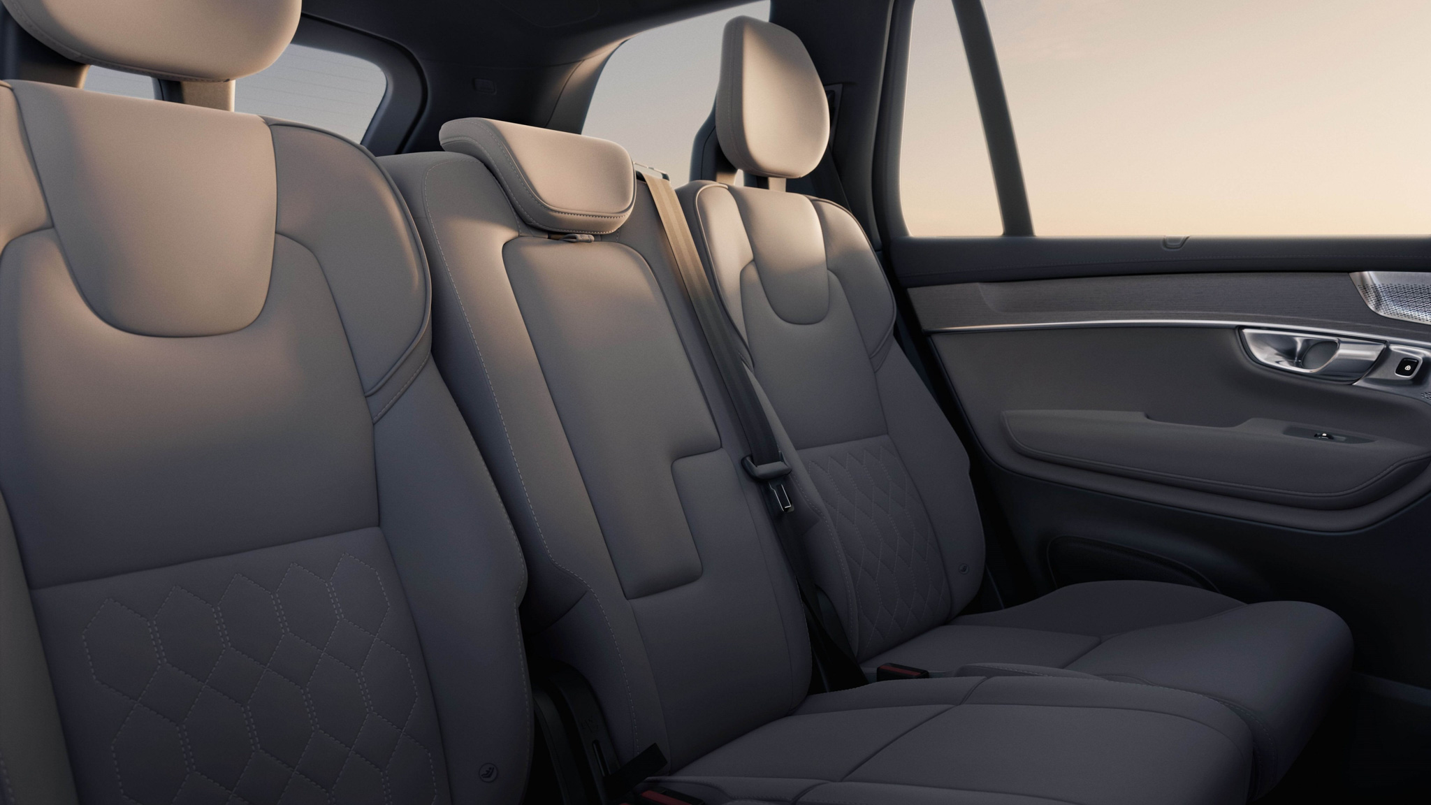 Der XC90 ist als Siebensitzer konzipiert, wobei die Sitze der dritten Reihe besonders für Kinder oder kleinere Erwachsene geeignet sind. Die zweite Sitzreihe ist im Verhältnis 40:20:40 umklappbar und lässt sich nach vorne verschieben, um den Einstieg in die dritte Reihe zu erleichtern. Kopf- und Beinfreiheit sind in den ersten beiden Sitzreihen hervorragend – selbst große Erwachsene sitzen bequem. In der dritten Reihe wird es naturgemäß etwas enger, aber für kürzere Fahrten ist sie eine echte Option.