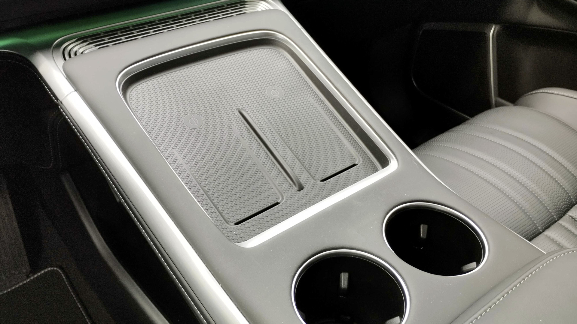 Weiteren Stauraum offeriert der XPeng G9 vorne in der Mittelkonsole unterhalb der 2 Ablageflächen für Smartphones mit Induktionsladung. Auch das gekühlte Fach in der Mittelarmlehne fällt großzügig aus.