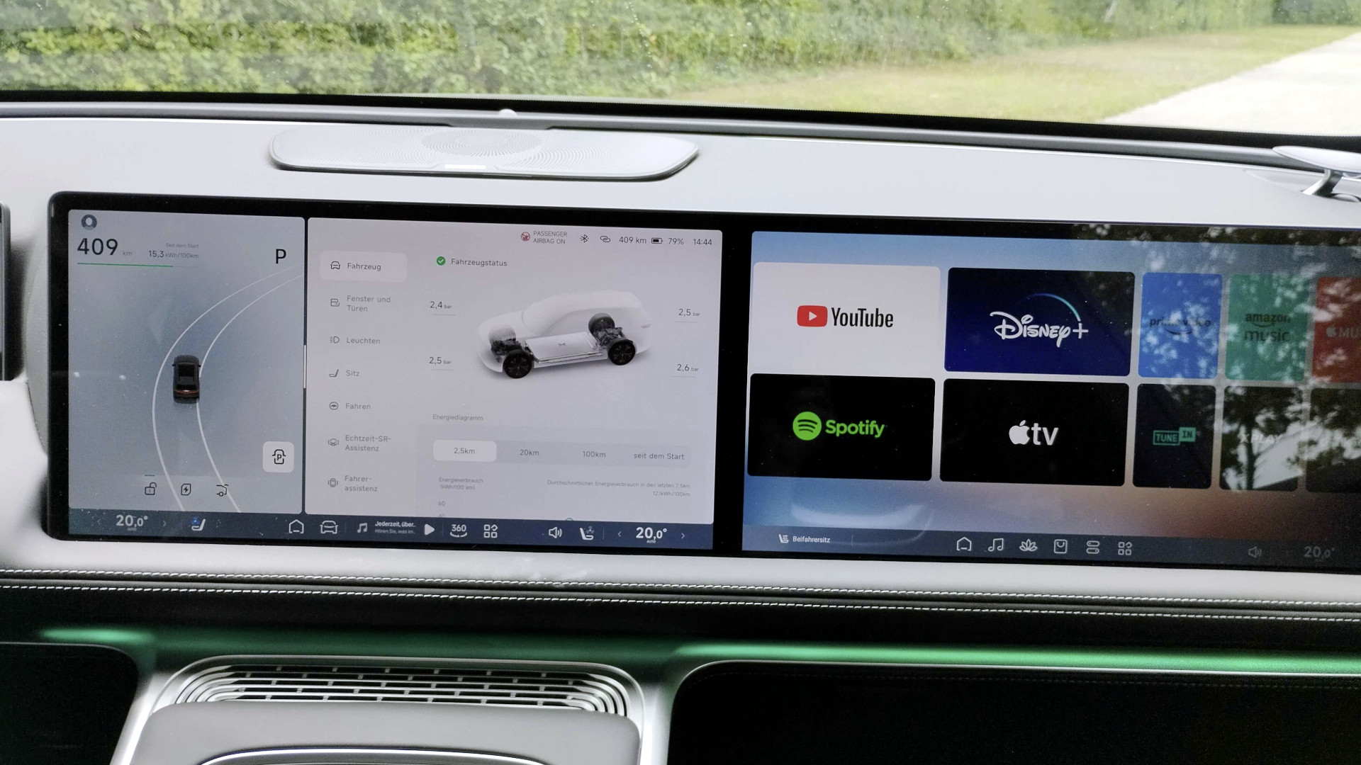 Über den zentralen 15-Zoll-Touchscreen werden das Infotainment und die Fahrzeugeinstellungen gesteuert. Über den zweiten 15-Zoll-Monitor vor dem Beifahrerplatz kann im Netz gesurft oder ein Film gestreamt werden. Mit der Bedienung ist es so eine Sache. Traditionalisten kommen vielleicht nicht gleich klar. Schalter glänzen durch Abwesenheit, bis auf die paar verbliebenen Tasten auf dem Lenkrad. Die Touchscreens bilden das Bedienzentrum. Das wirkt modern, aber im Fortschritt lauert manchmal auch ein Rückschritt. Die neuen Wege sind nicht immer die besseren. Außenspiegel verstellen über den Touchscreen auf jeden Fall nicht.