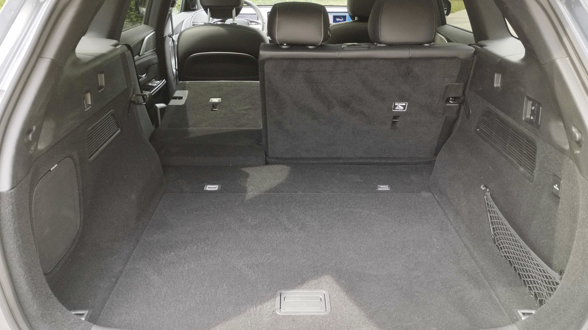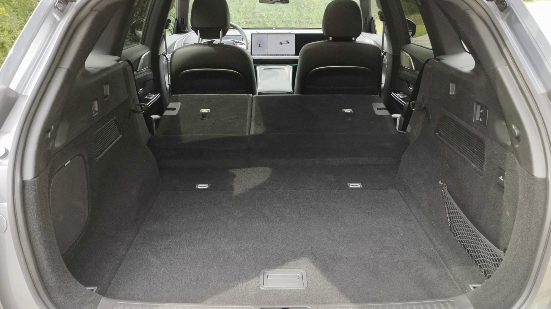 Im Konkurrenzvergleich fällt das Fach für die Ladekabel unter der Fronthaube, der „Frunk“, mit 71 Liter Volumen außergewöhnlich groß aus. Die Ladung darf das auch. Das Gepäckabteil bietet 660 bis 1.576 Liter Kofferraumkapazität und hohen Ladekomfort. Das Einladen wird durch die elektrische Heckklappe mit Sensoröffnung und die Luftfederung, die die Laderampe auf Schalterdruck absenkt oder anhebt, erleichtert.